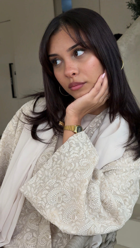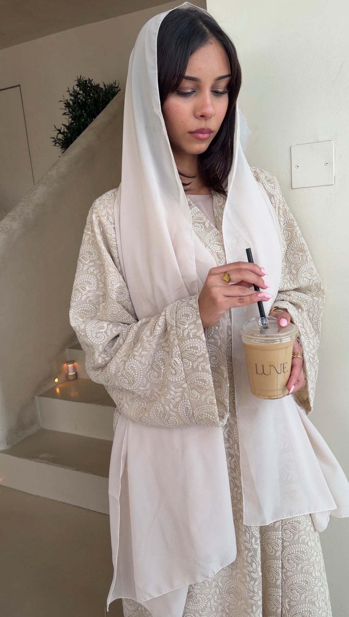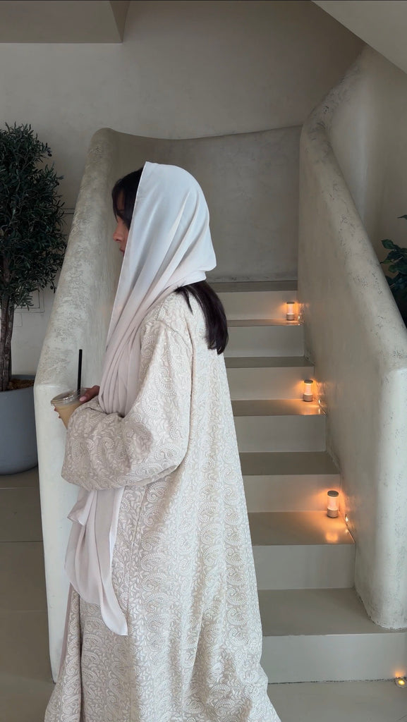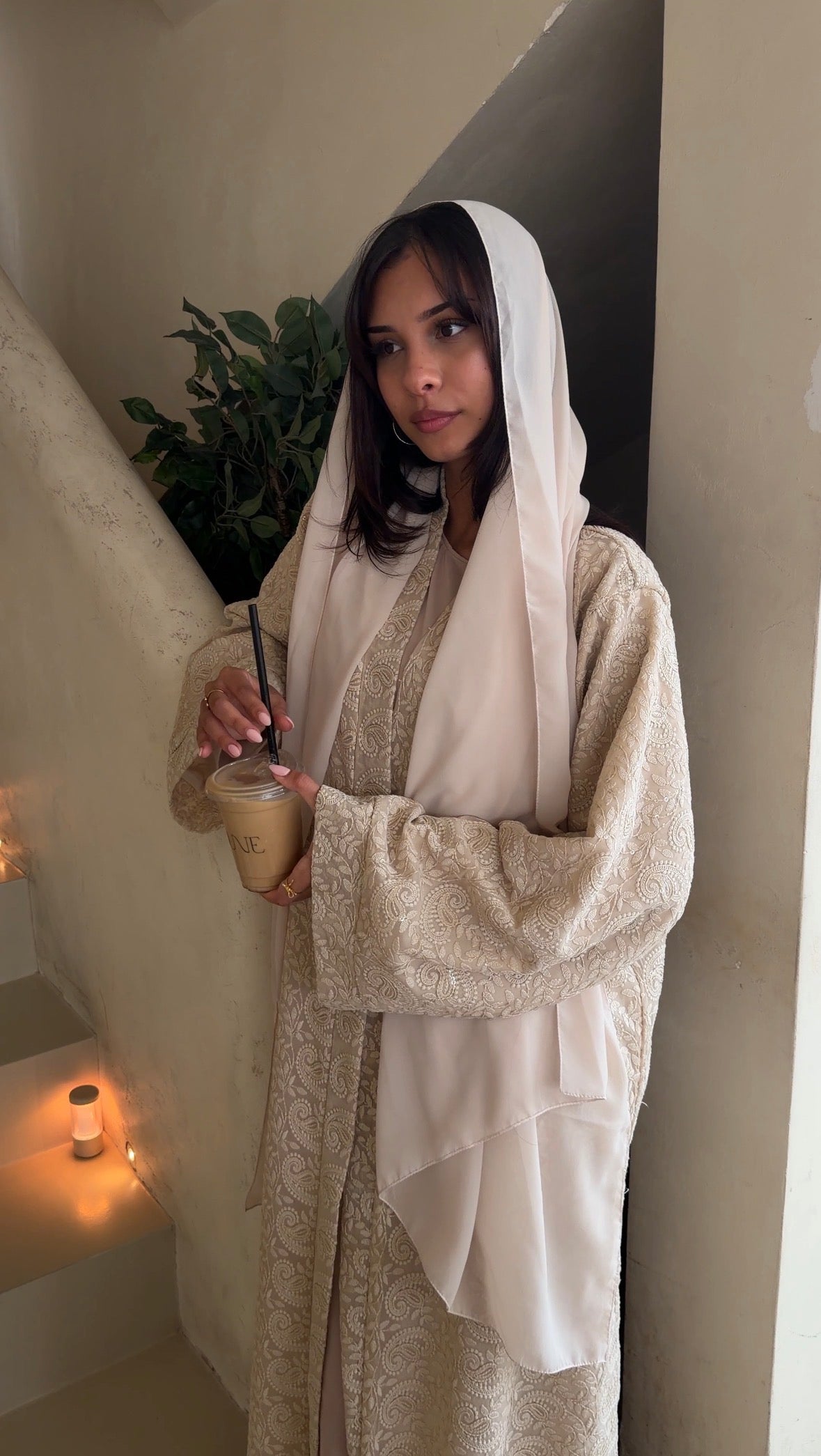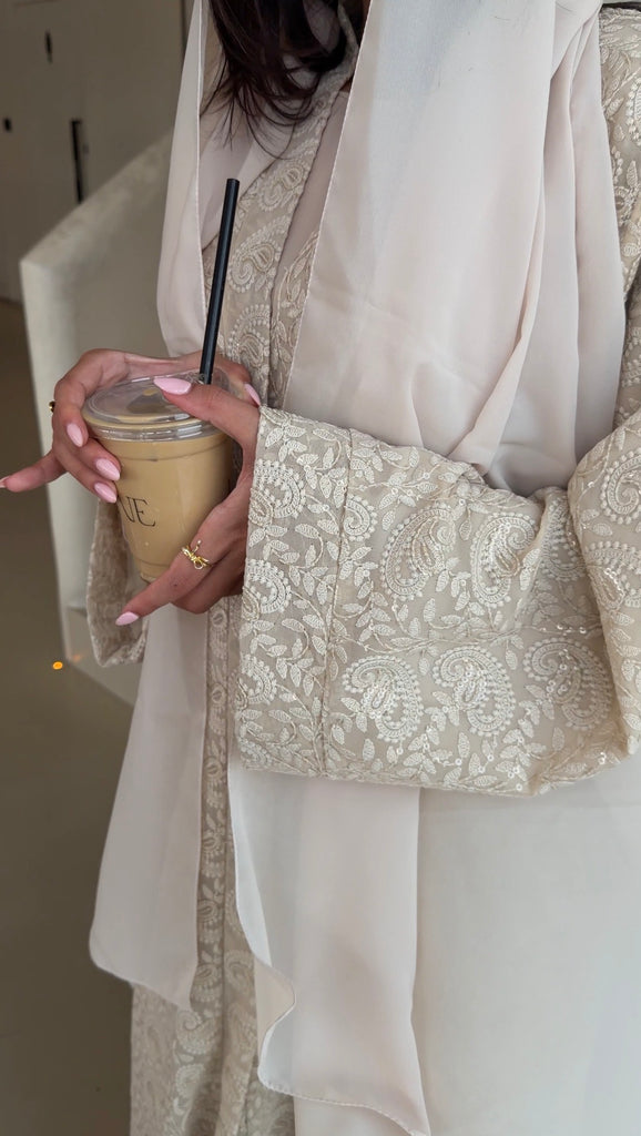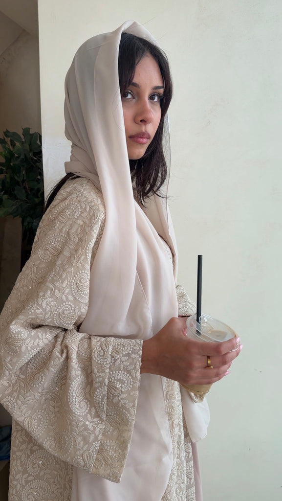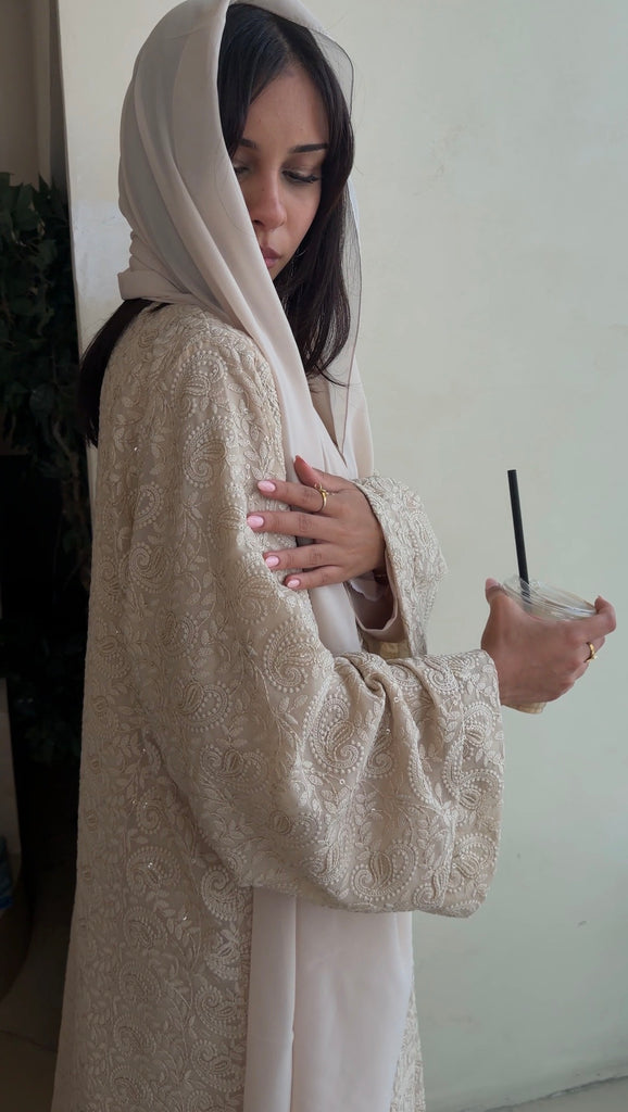 Delicate, detailed, and dreamlike — this embroidered abaya blends craftsmanship with quiet luxury. The soft beige base is adorned with intricate threadwork and subtle sequin glimmers that catch the light in motion. Crafted from rich embroidered georgette and paired with a chiffon layer, it flows in a Bisht-inspired silhouette — airy, fluid, and gracefully elegant. Understated yet unforgettable.