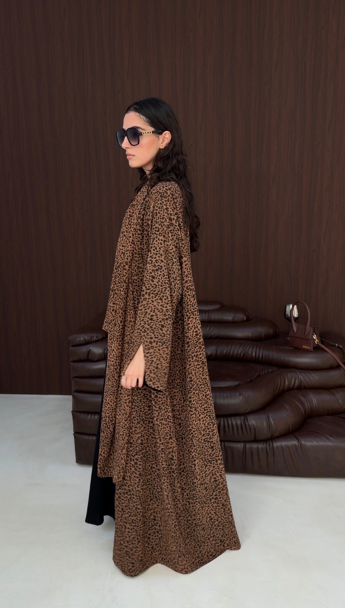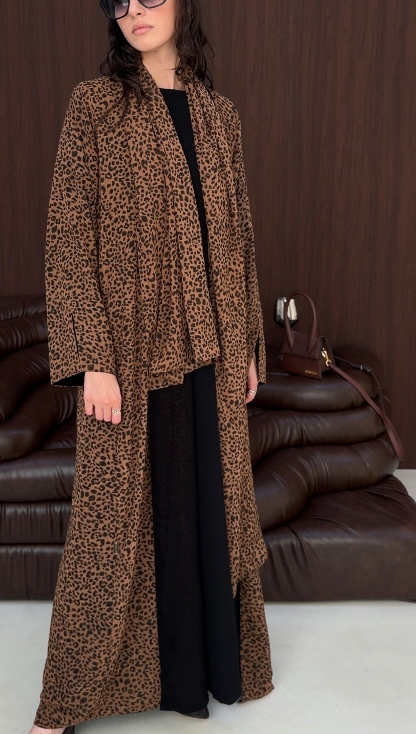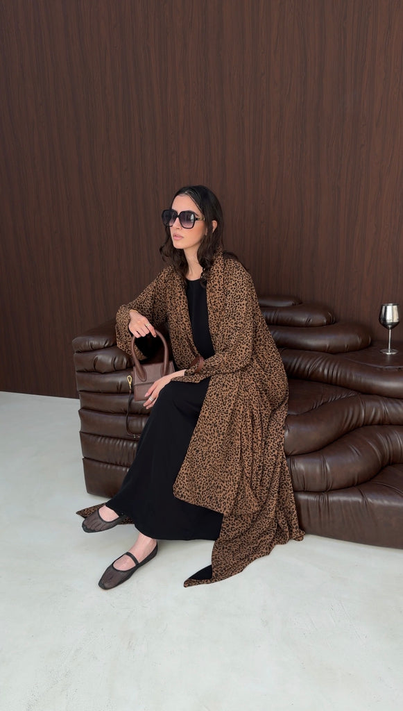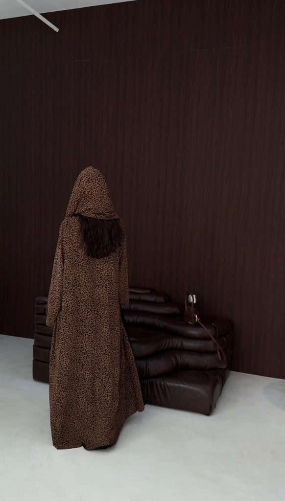 New printed abaya silhouette: straight relaxed cut — a softly tailored shape with a sleeve slit.