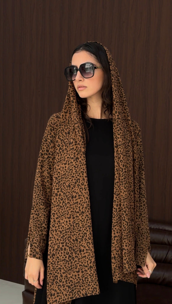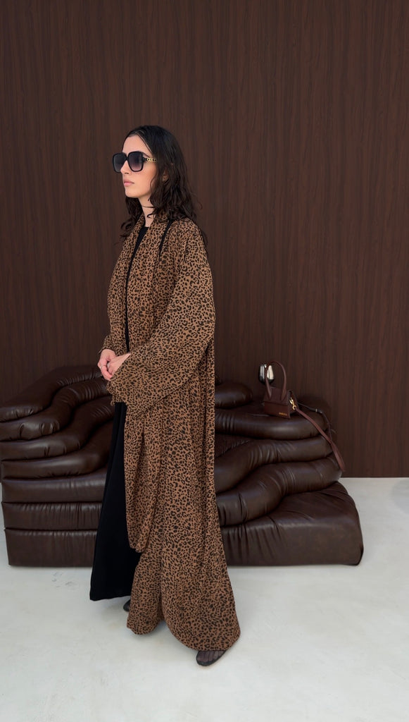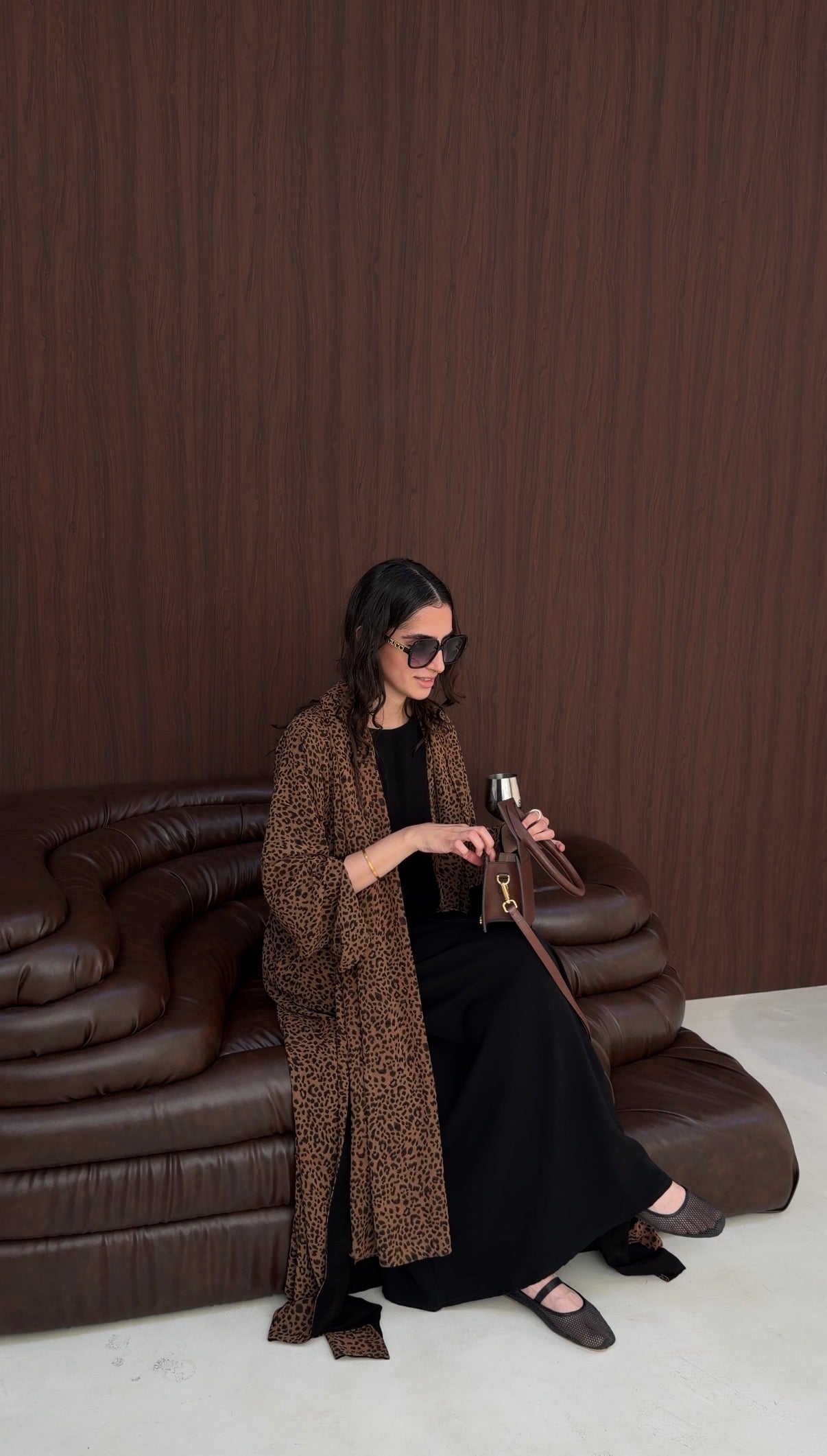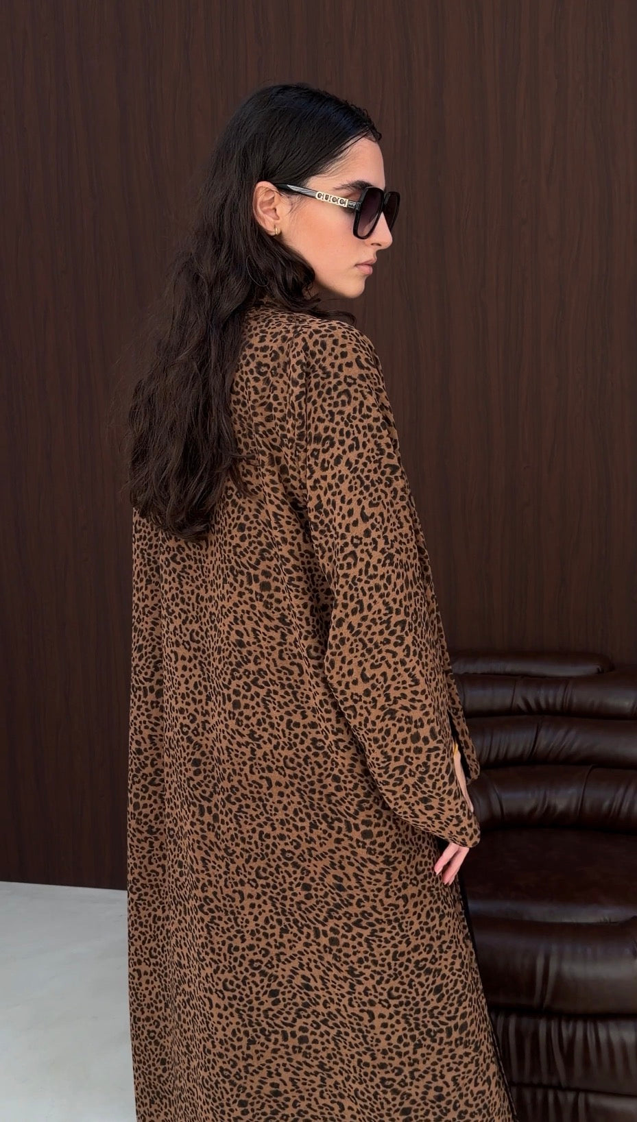New printed abaya silhouette: straight relaxed cut — a softly tailored shape with a sleeve slit.