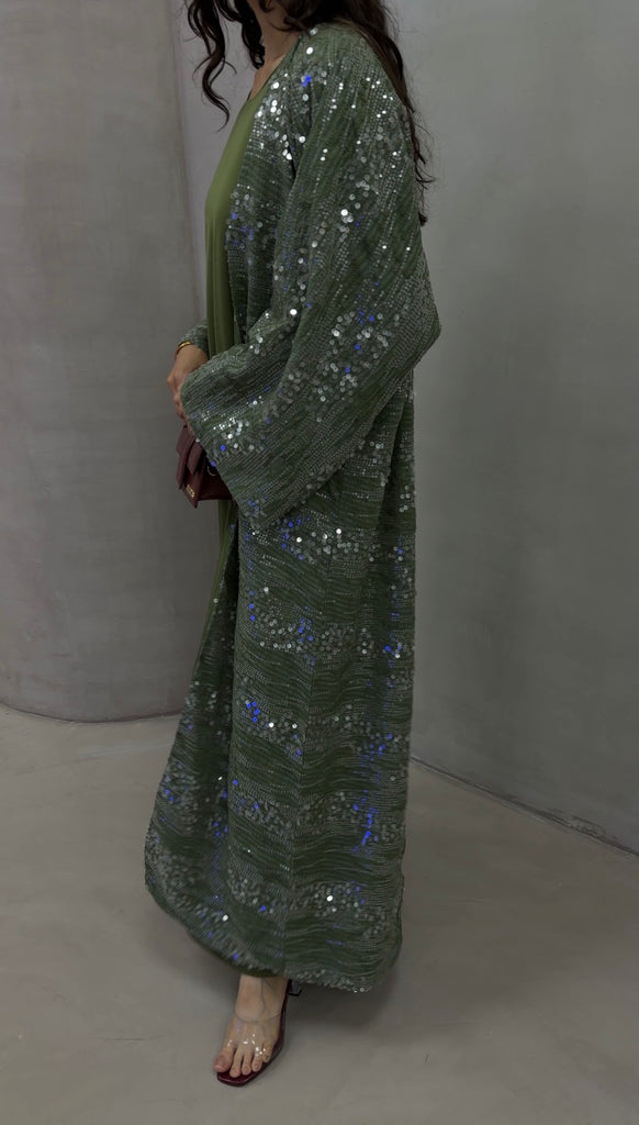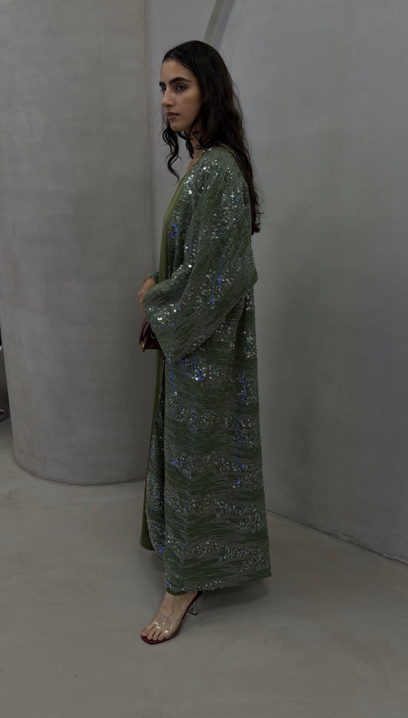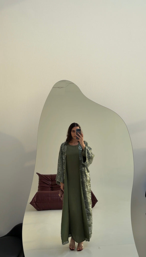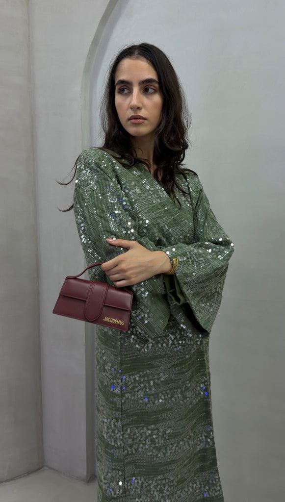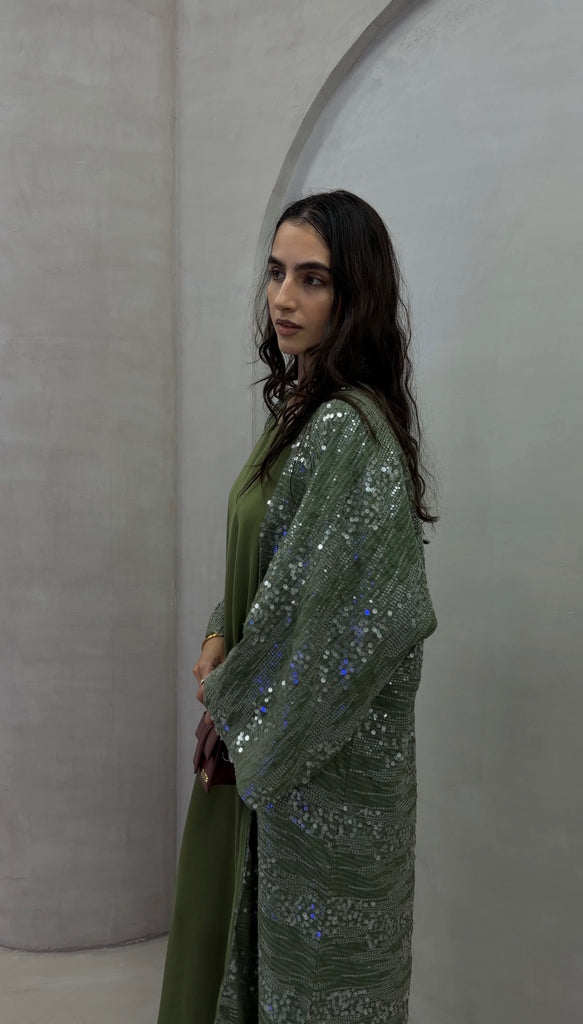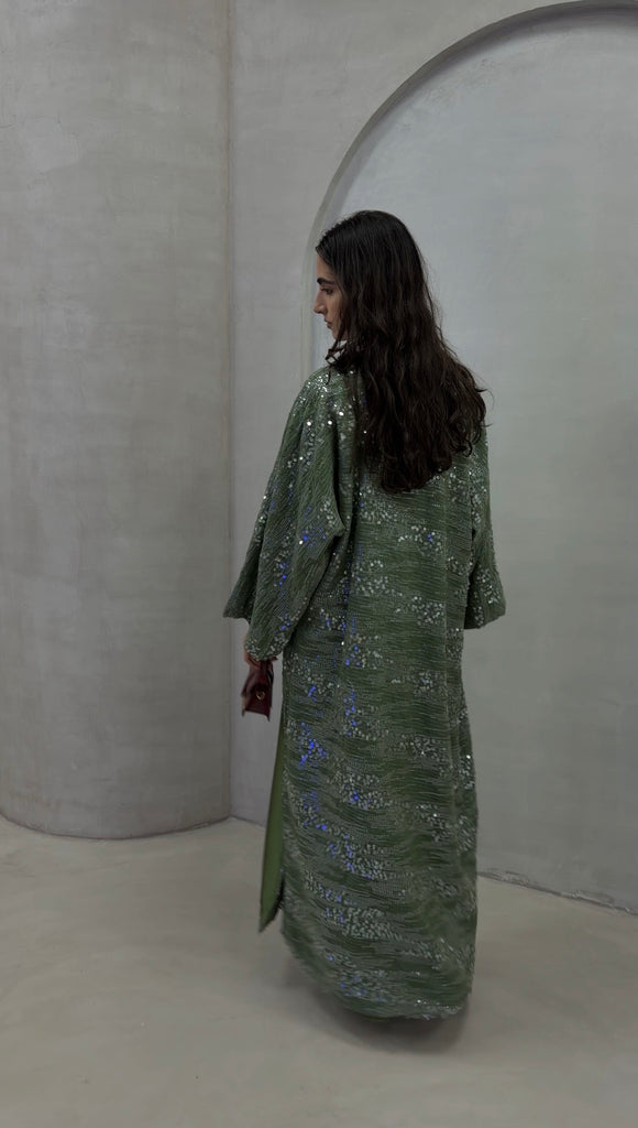 There’s something about a soft shimmer that just feels right. The Olive Gleam Sequin Bisht moves with light — olive-toned fabric scattered with silver sequins that catch every step. Fully lined so it’s never see-through, it balances flow and structure perfectly, giving that effortless kind of glam you can wear day or night.