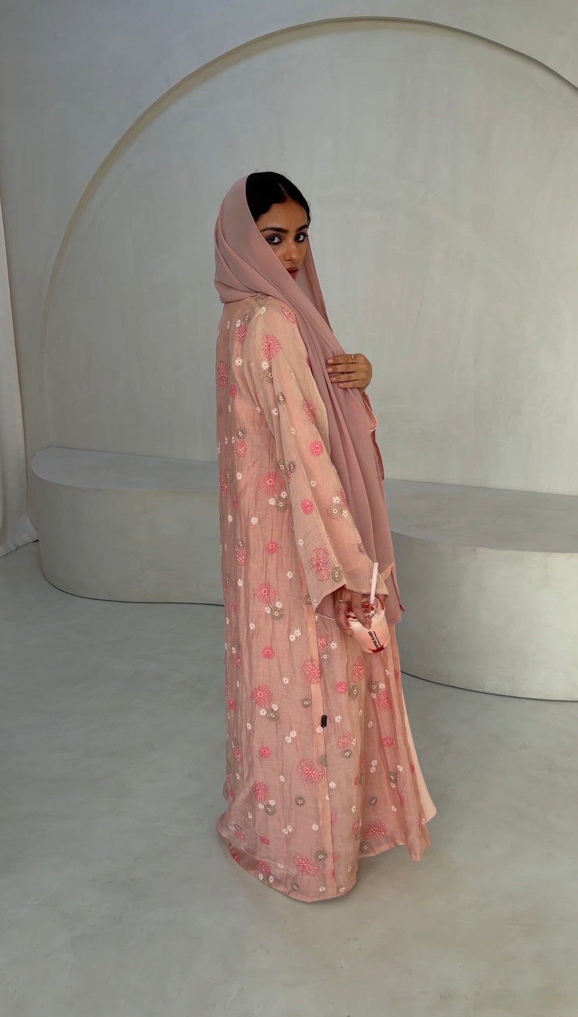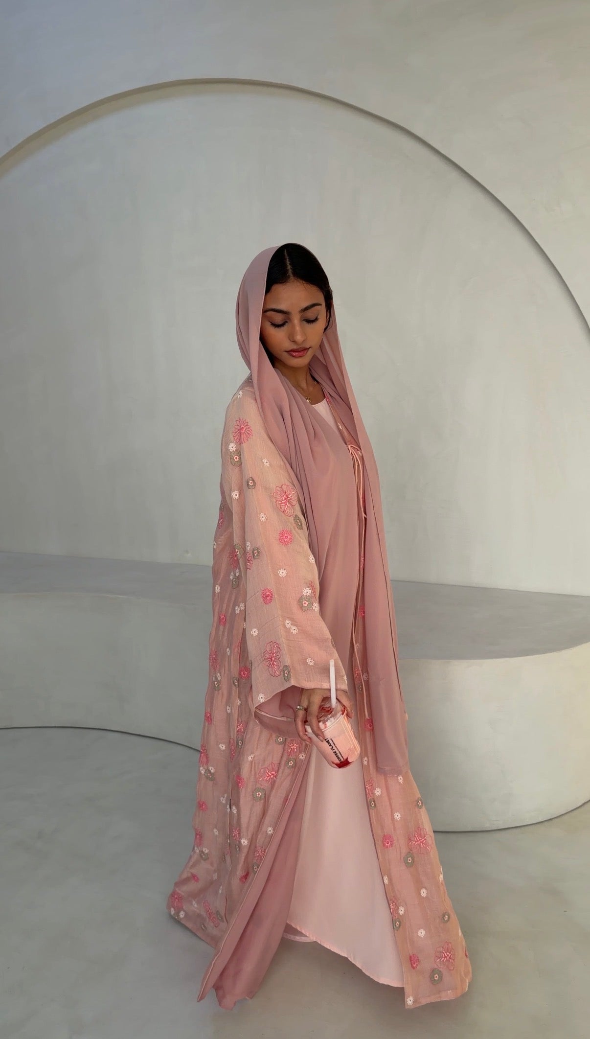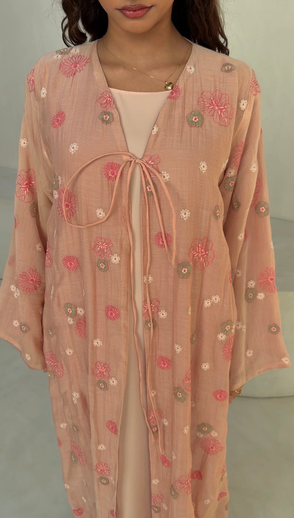 A soft pink-peach abaya scattered with delicate floral embroidery, bringing gentle warmth and romantic ease to everyday dressing. Light-catching yet understated, it features a front-tie details that allow the piece to close softly for a young, fresh look while keeping the look relaxed and fluid.