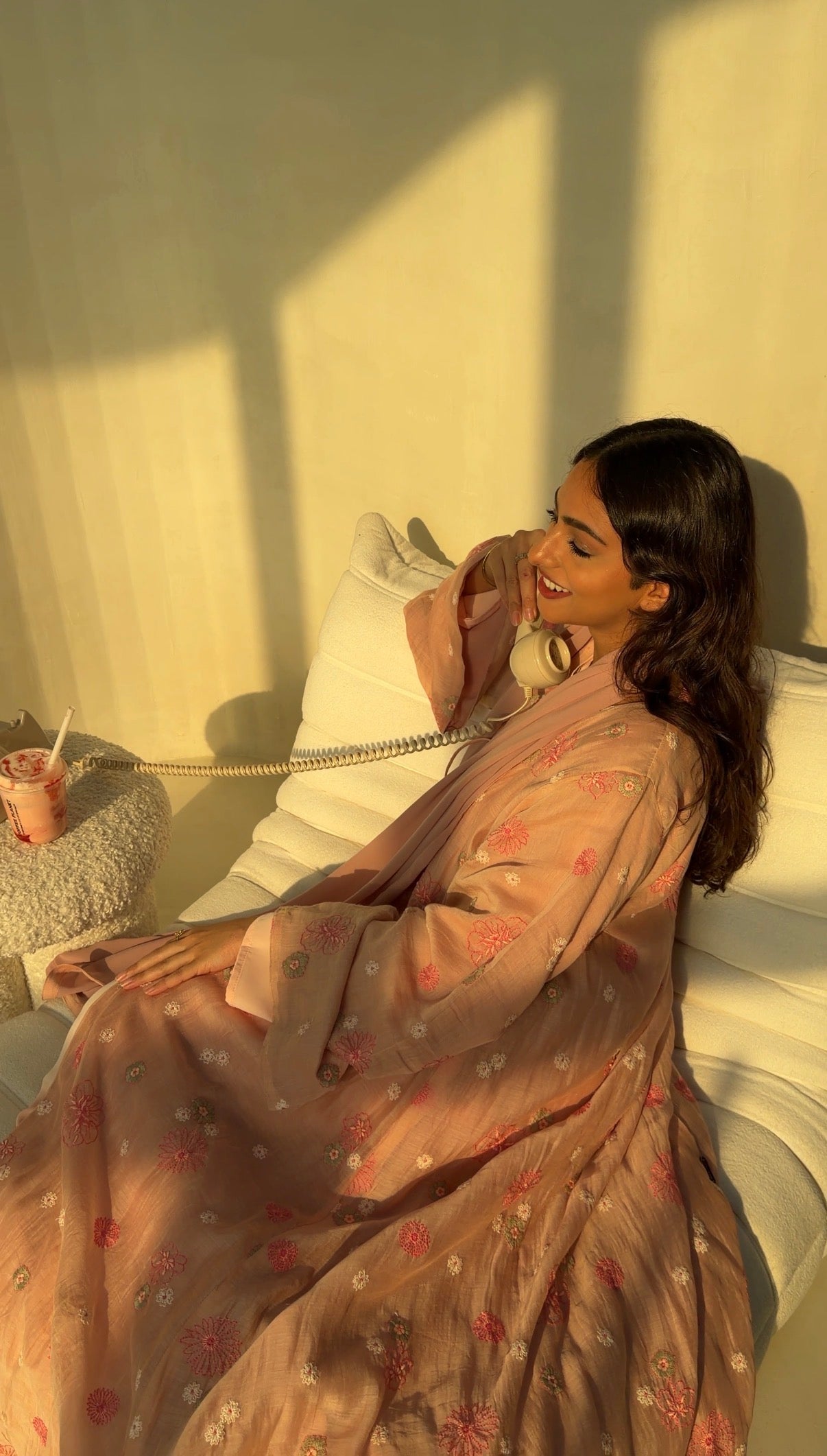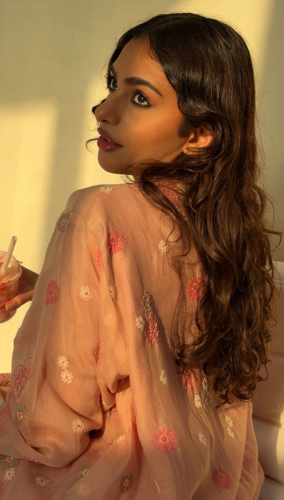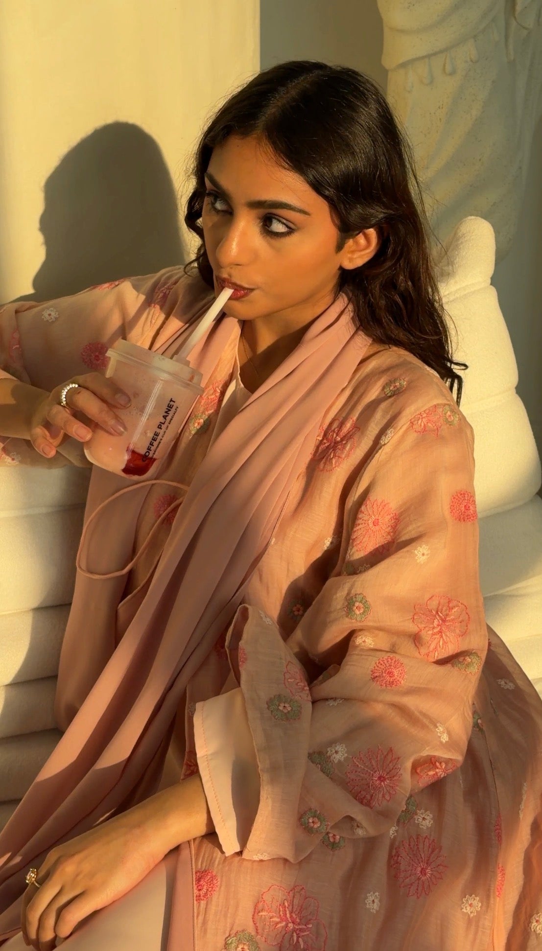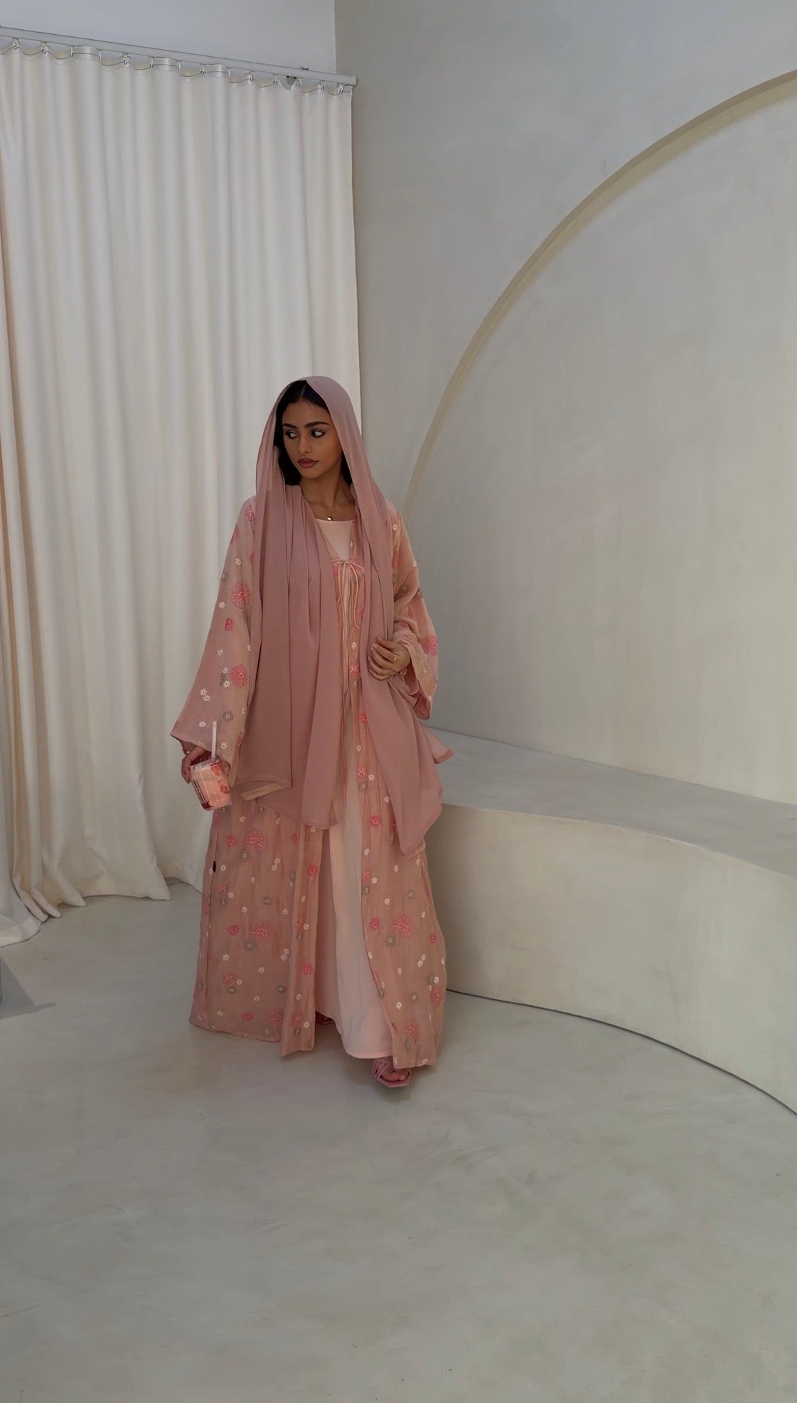 A soft pink-peach abaya scattered with delicate floral embroidery, bringing gentle warmth and romantic ease to everyday dressing. Light-catching yet understated, it features a front-tie details that allow the piece to close softly for a young, fresh look while keeping the look relaxed and fluid.