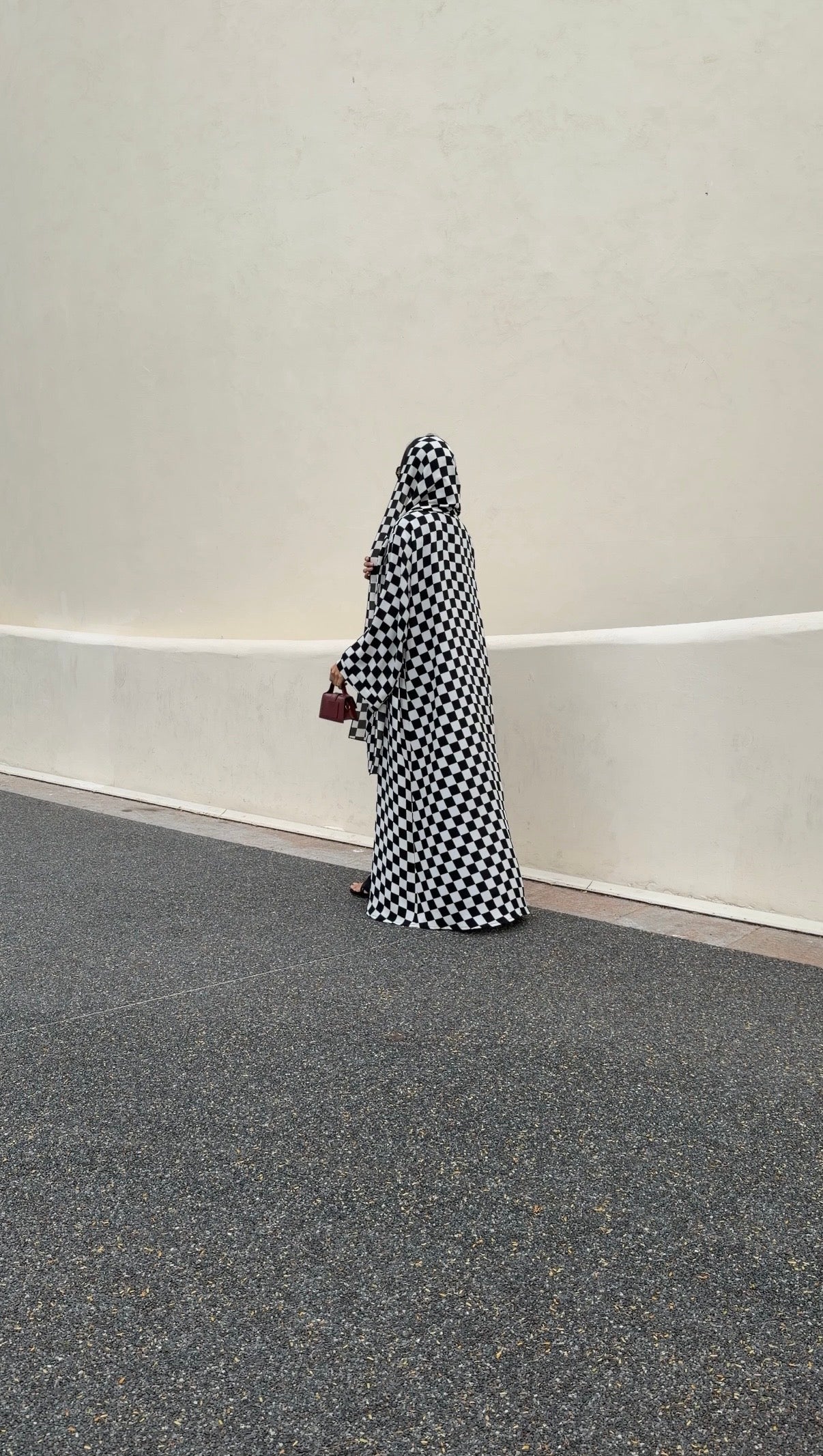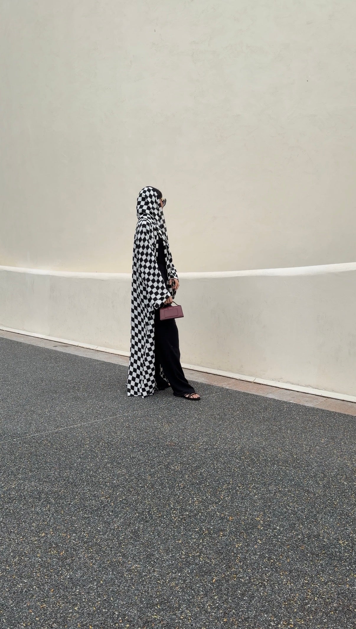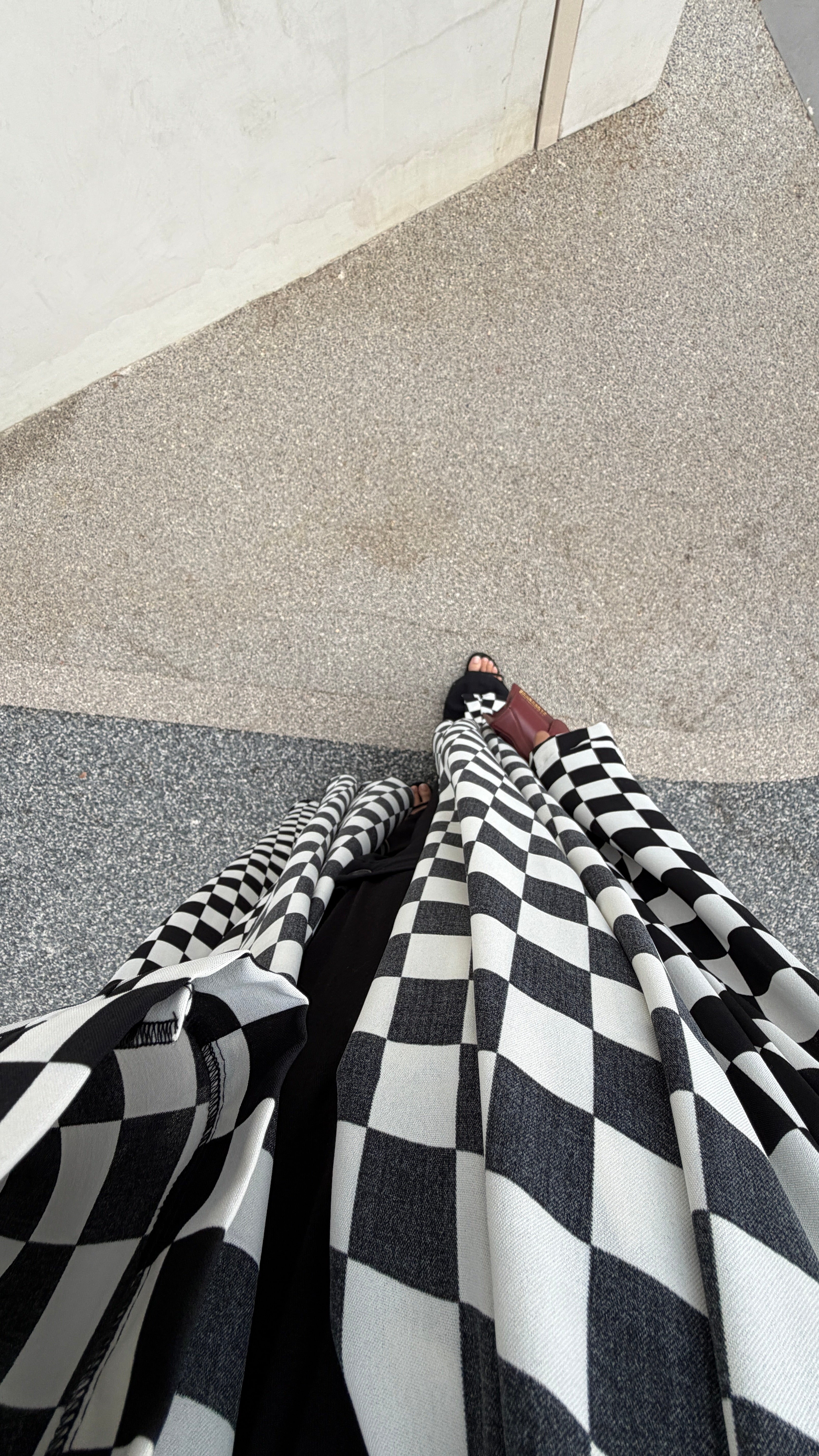 A bold black and white checkered print meets a denser crepe-like fabric that drapes with fluid movement. Structured enough to hold its shape, yet soft enough to flow effortlessly as you walk.