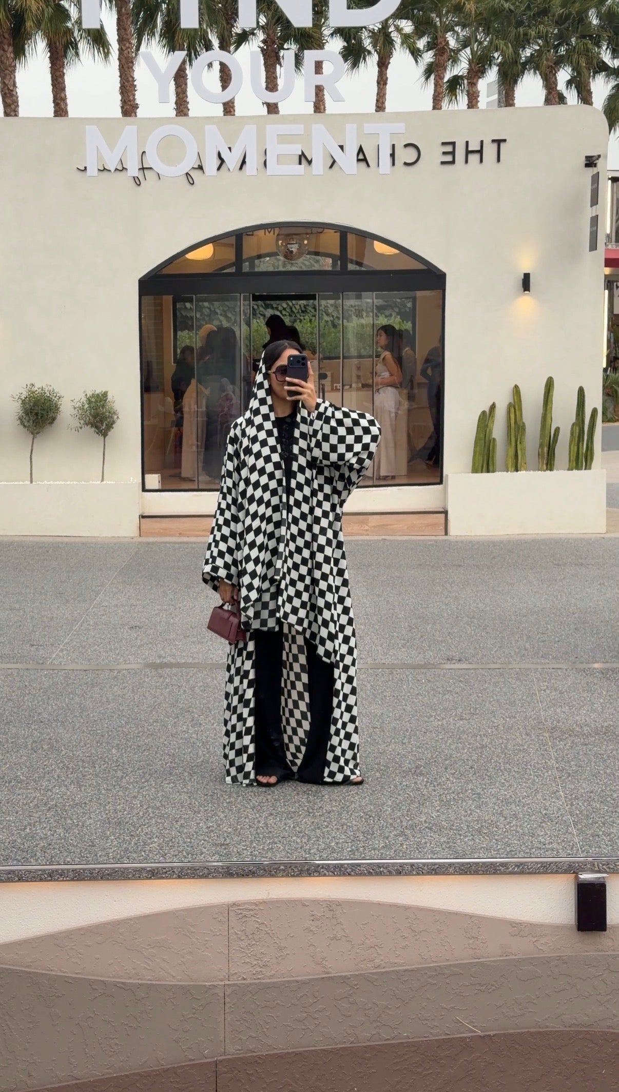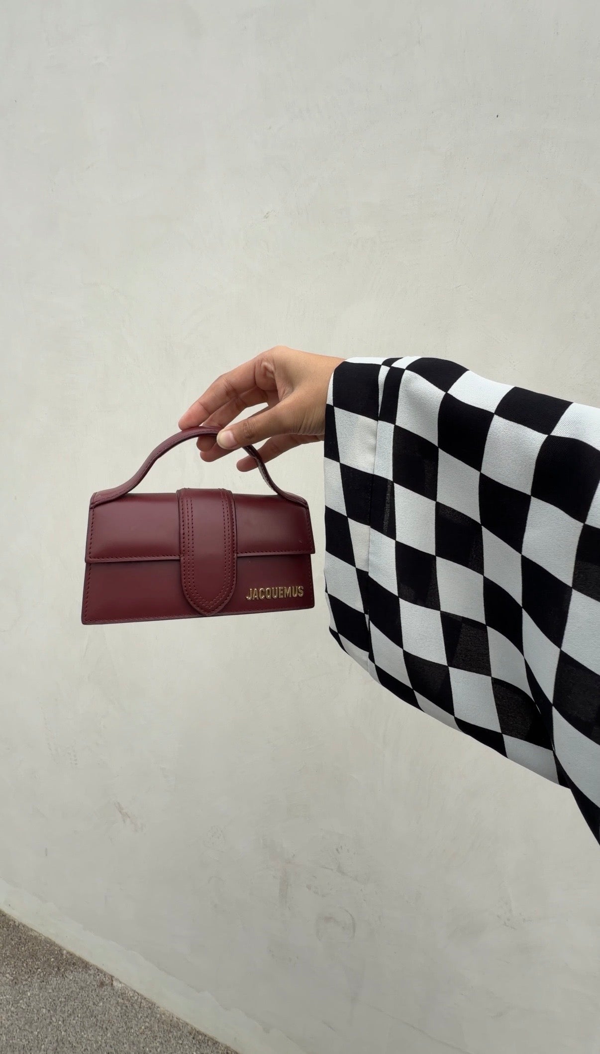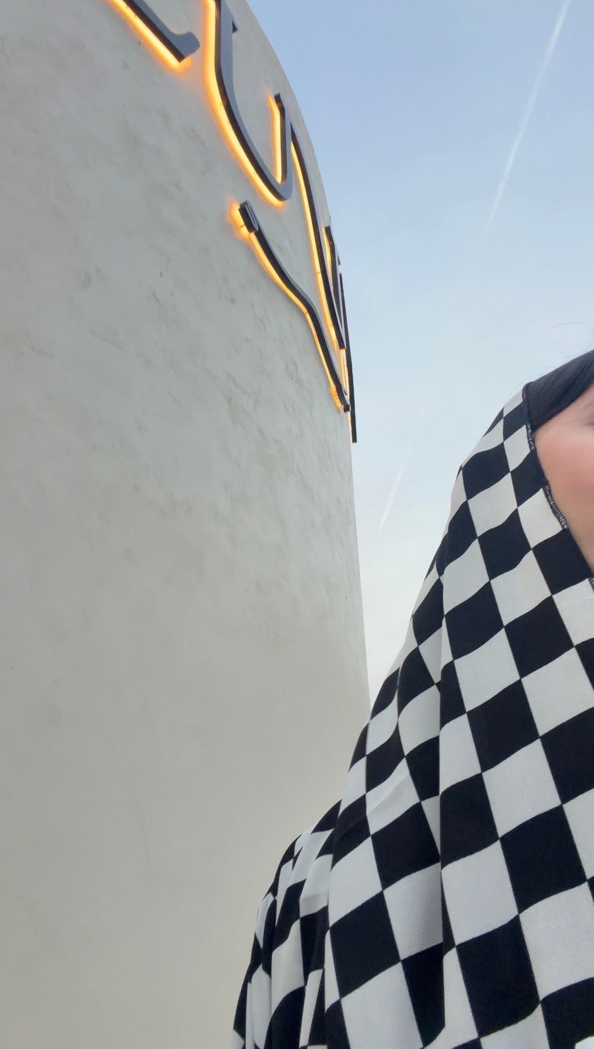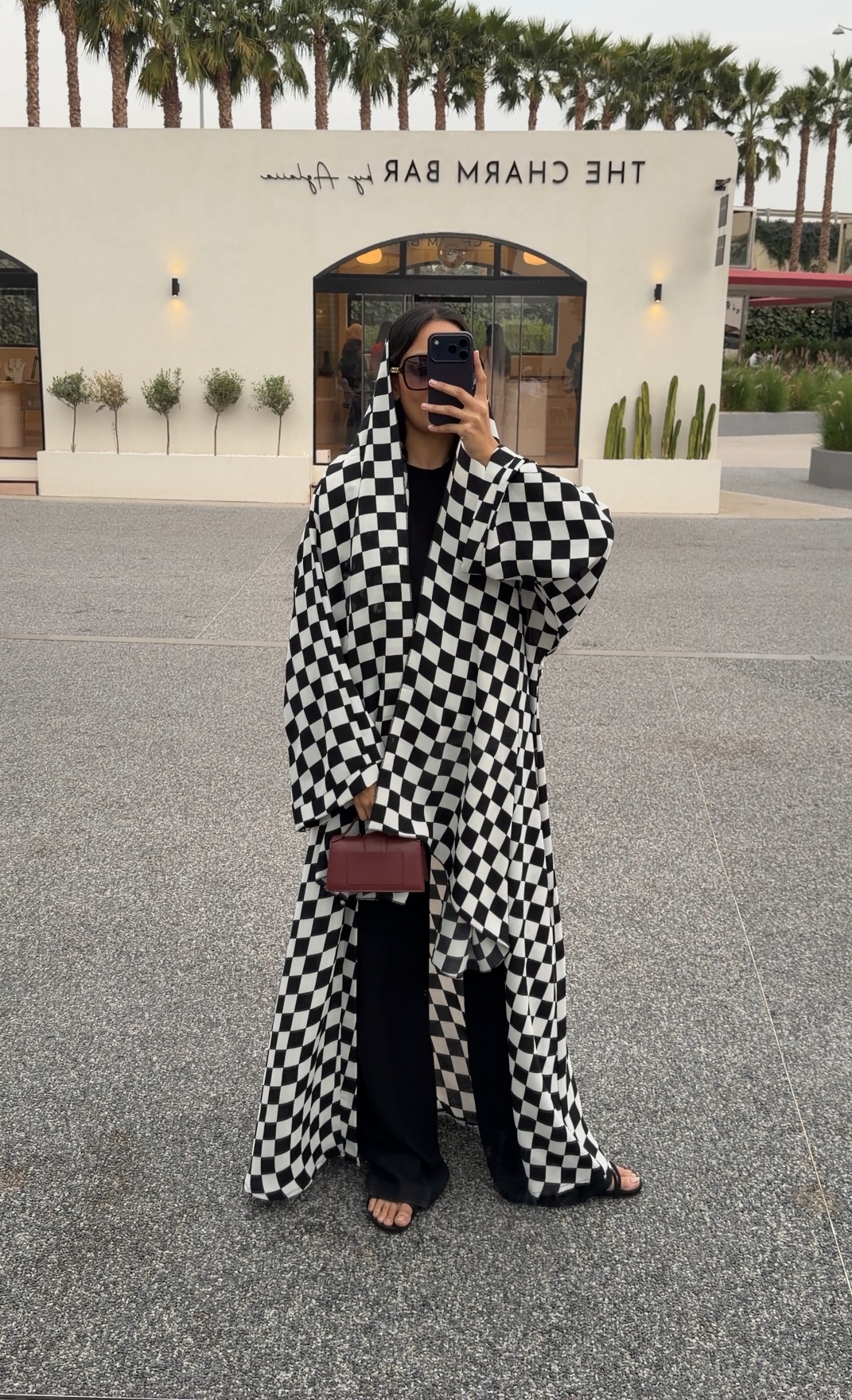 A bold black and white checkered print meets a denser crepe-like fabric that drapes with fluid movement. Structured enough to hold its shape, yet soft enough to flow effortlessly as you walk.