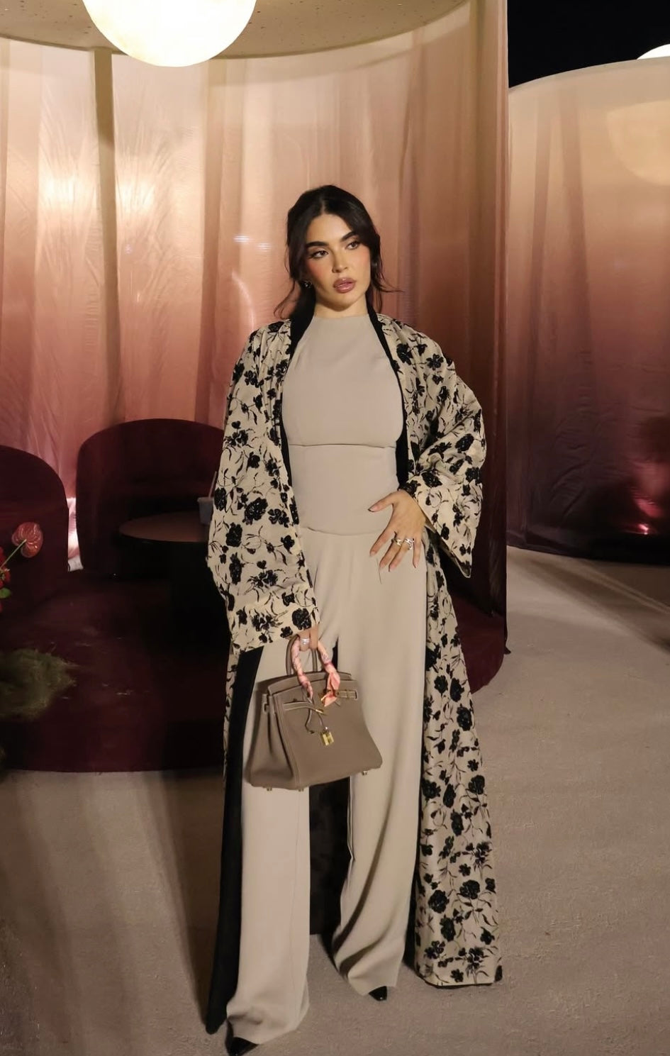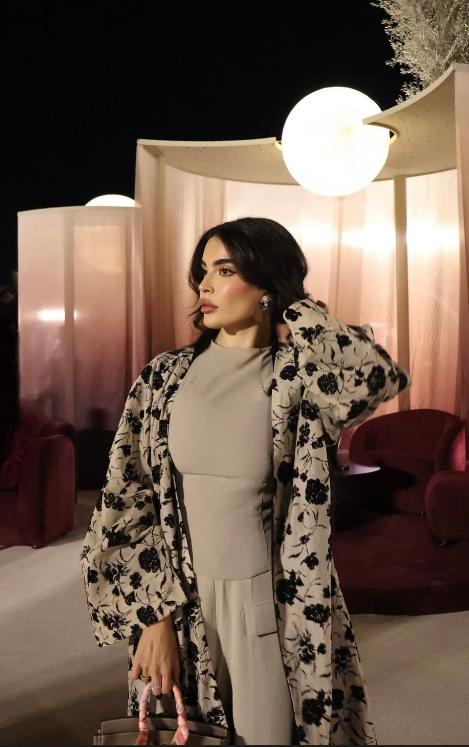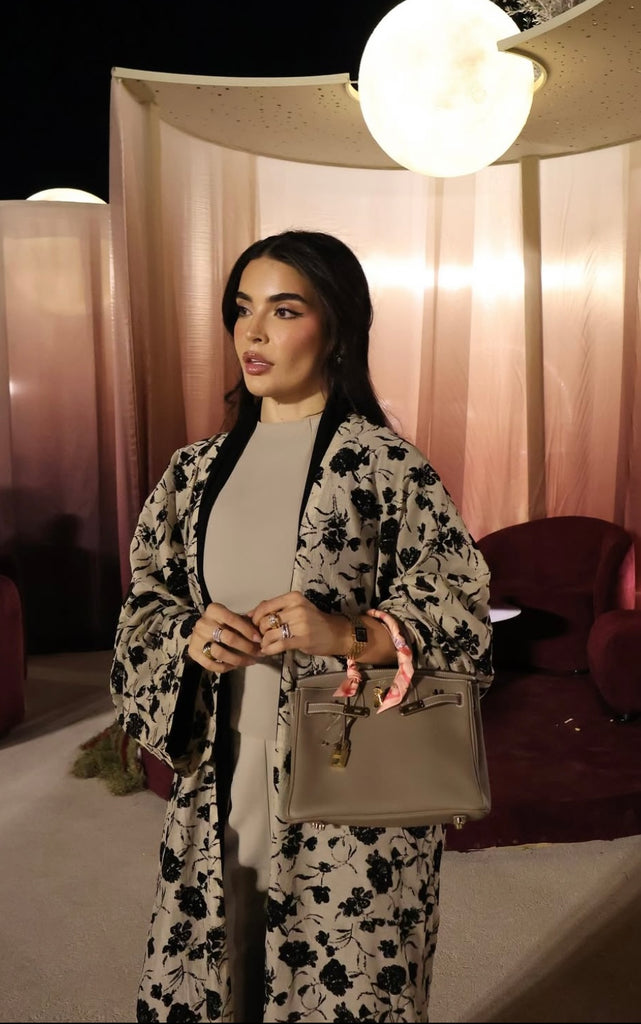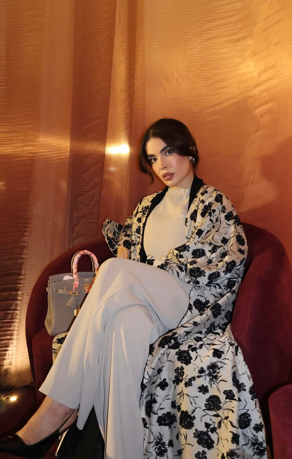 Textured, artful, and softly dramatic — this abaya features a lightweight woven base with velvety floral overlays that add depth and quiet sheen. The crushed texture gives it an effortless drape, bringing depth and dimension to a timeless black-and-beige palette. Understated yet striking, it’s a piece that feels raw, refined, and beautifully balanced.