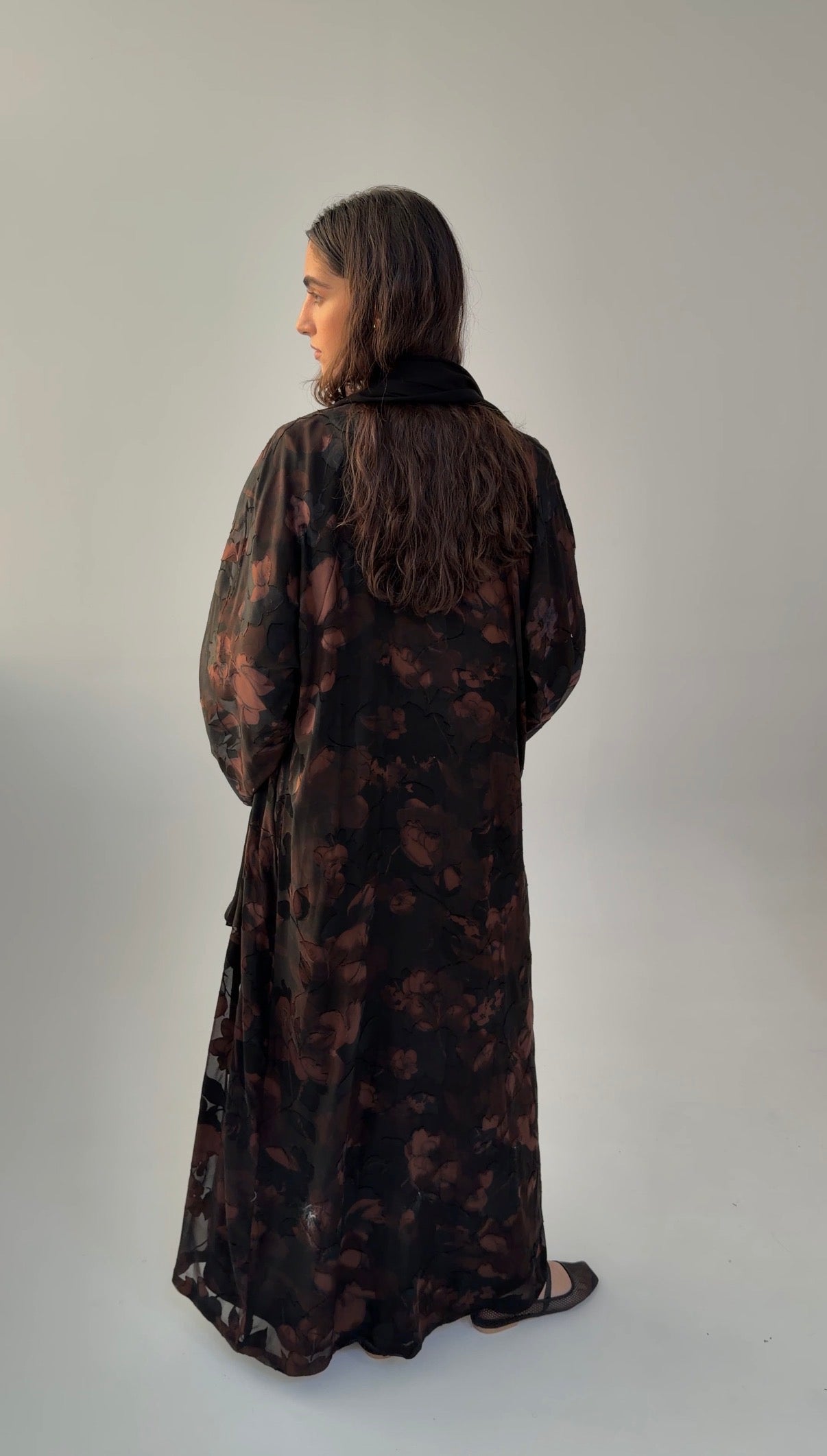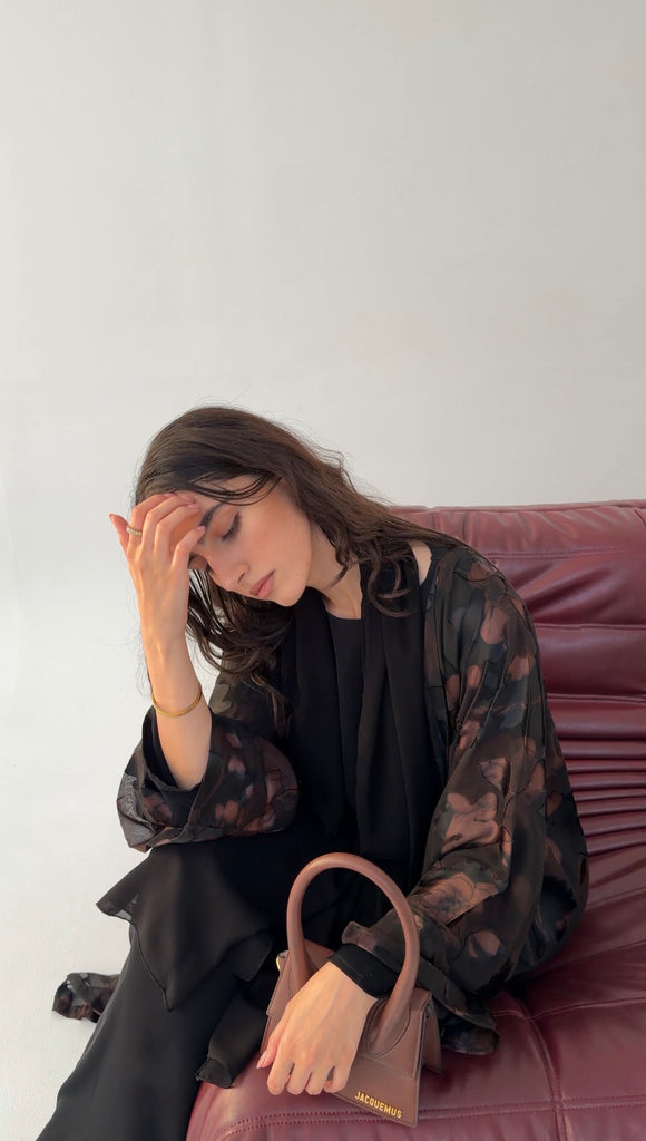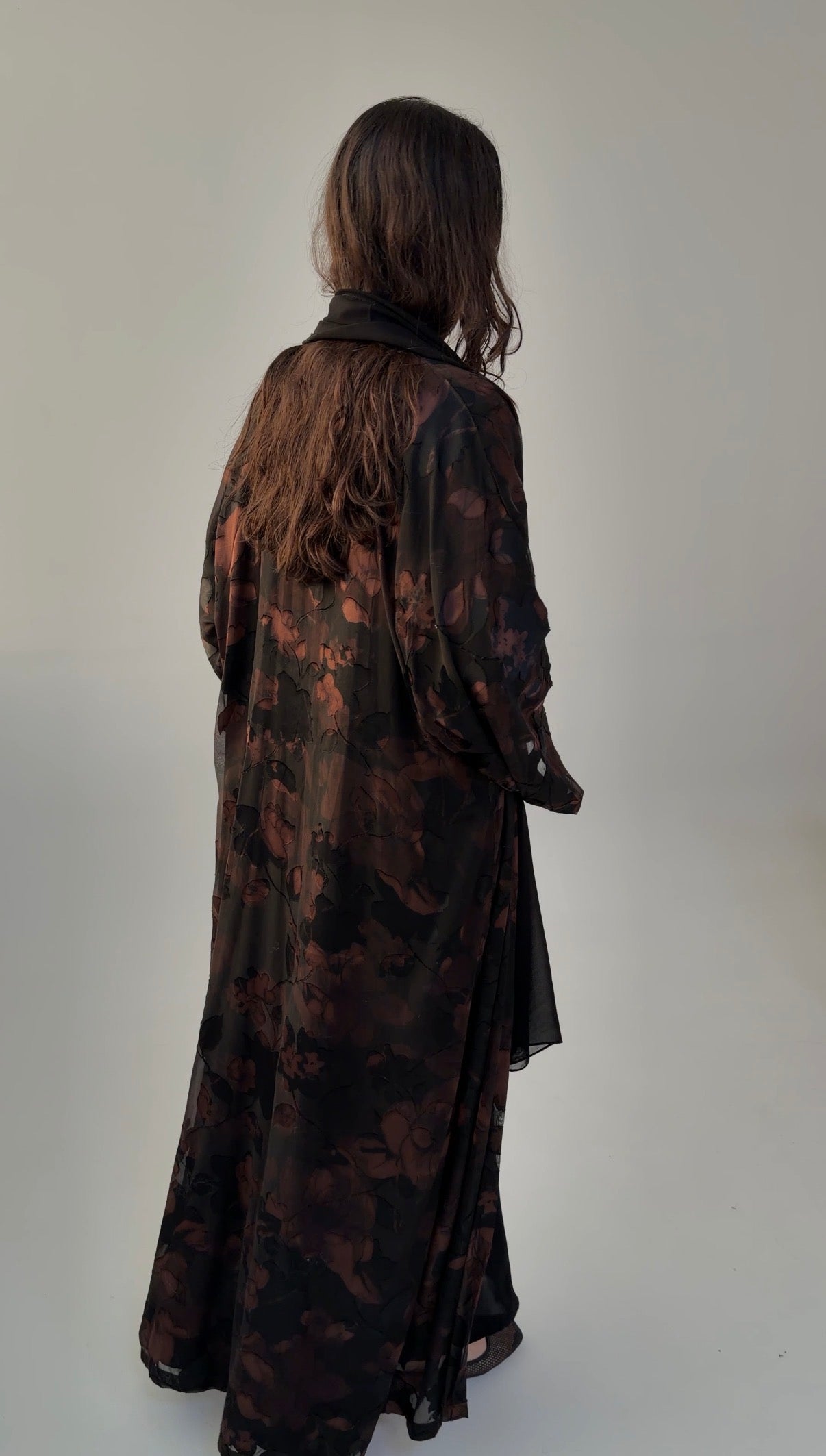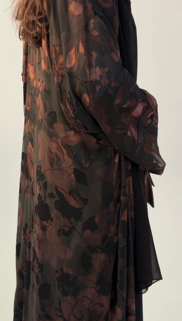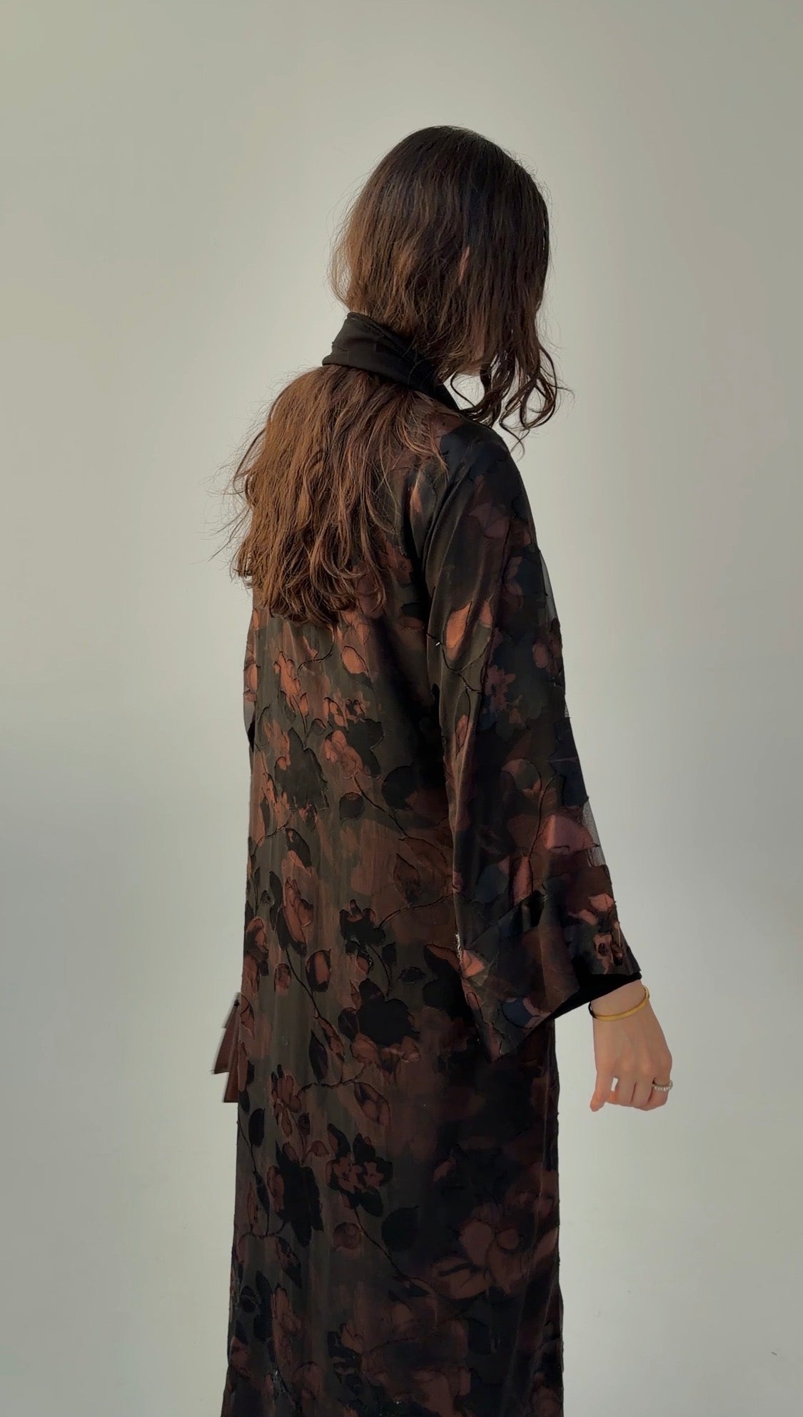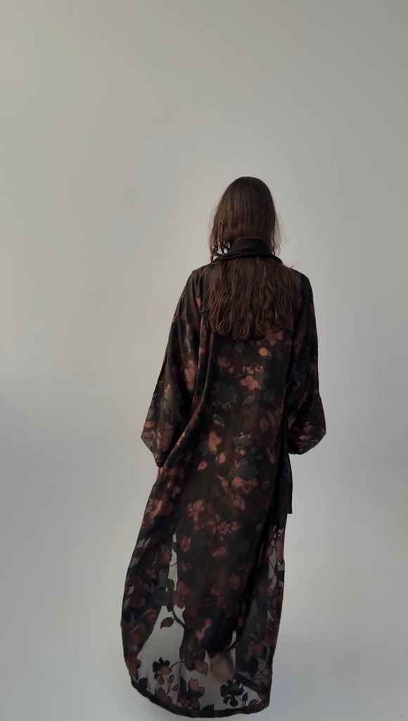 A sheer, smoky black crepe kimono with warm brown undertones that shift with the light. The burnout-style floral texture adds a soft play of shadow and sheen, layered over a smooth satin base that glimmers with movement.