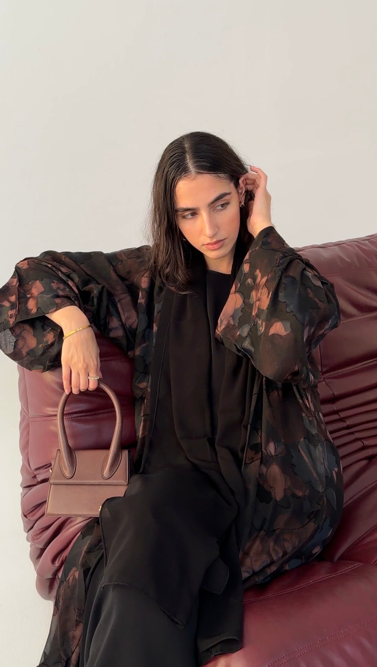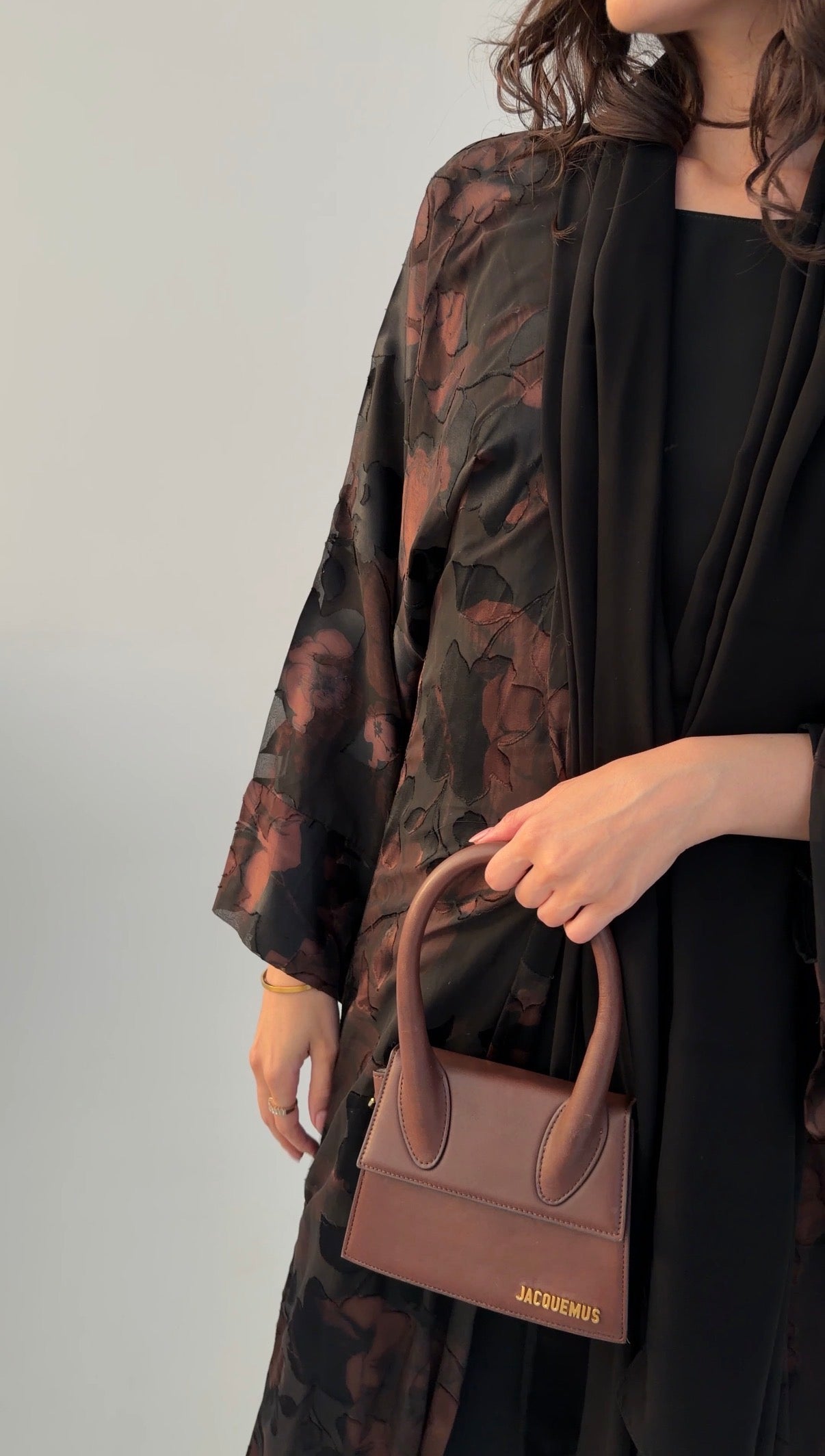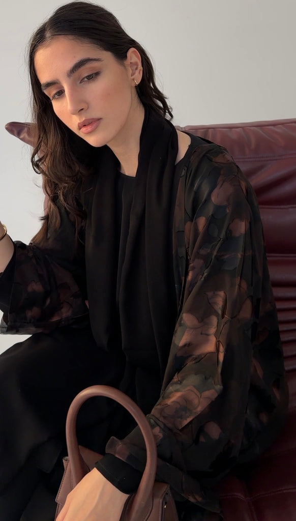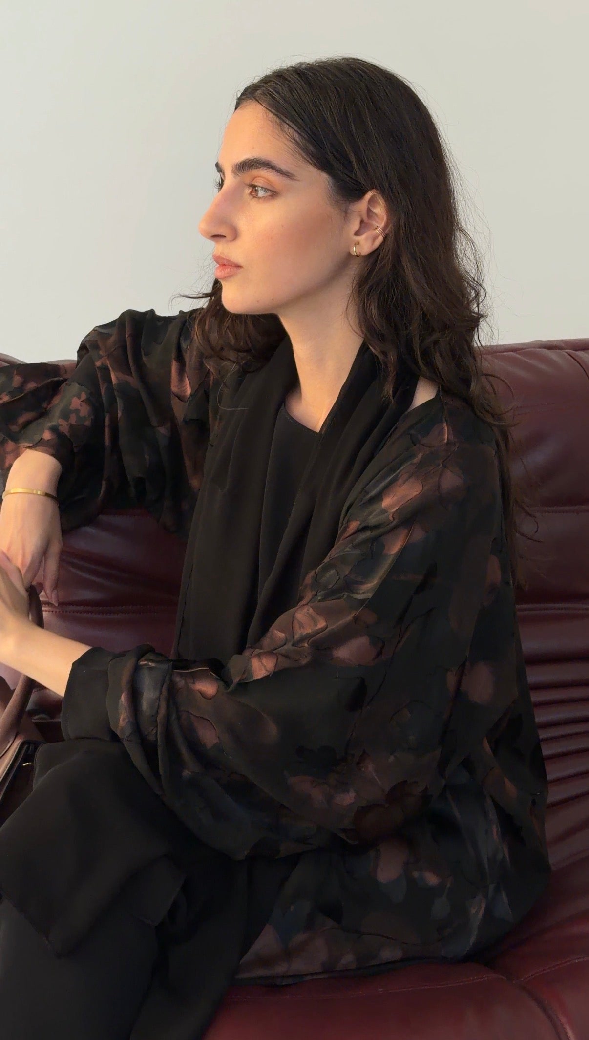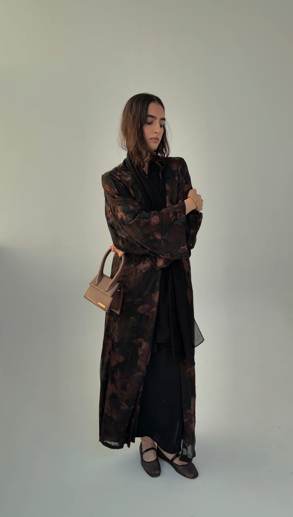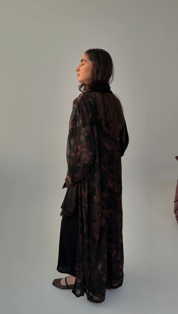 A sheer, smoky black crepe kimono with warm brown undertones that shift with the light. The burnout-style floral texture adds a soft play of shadow and sheen, layered over a smooth satin base that glimmers with movement.