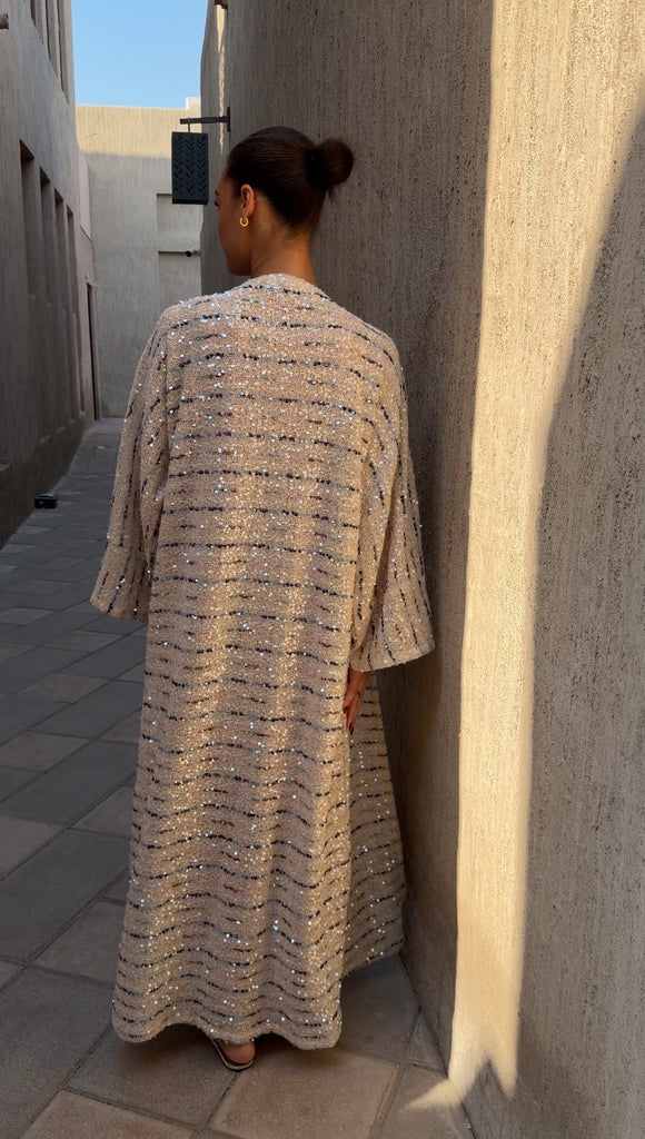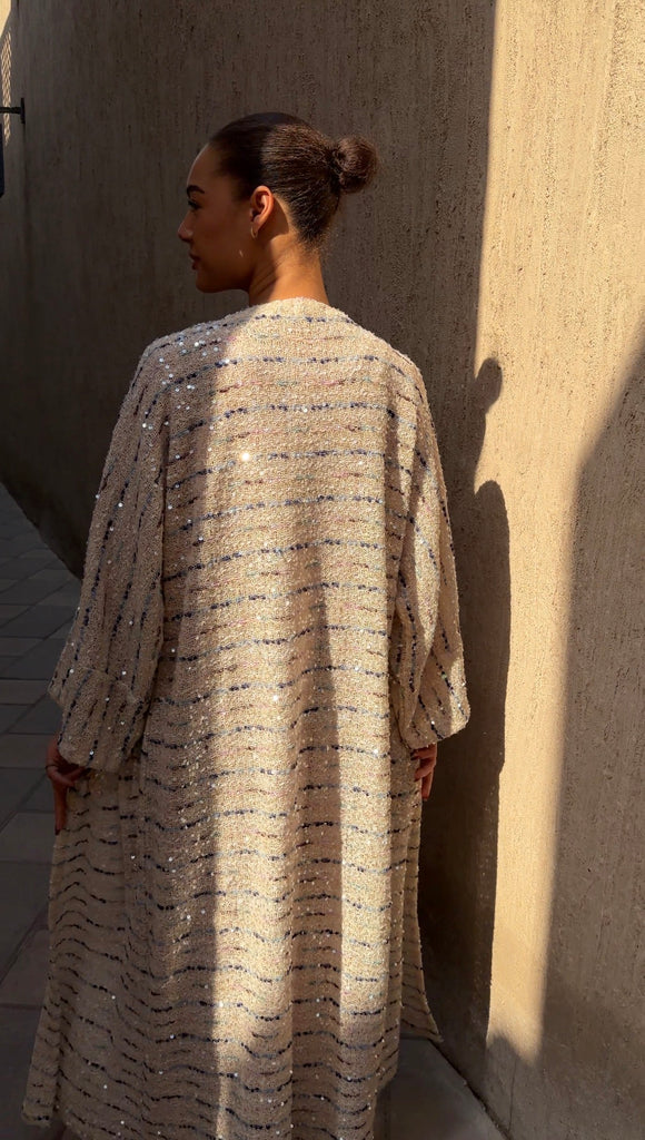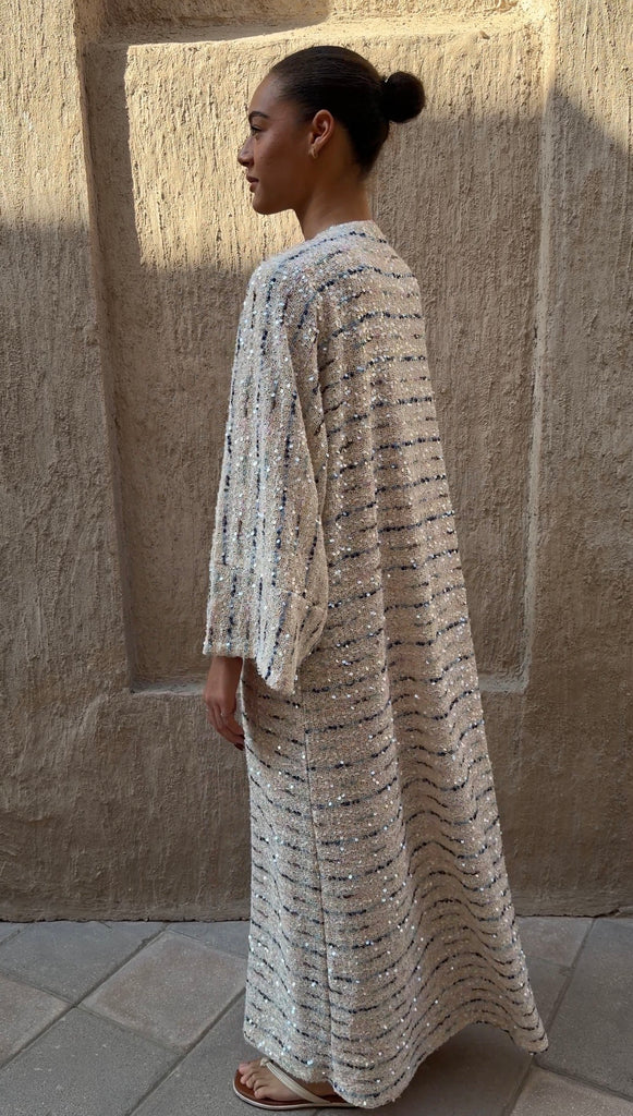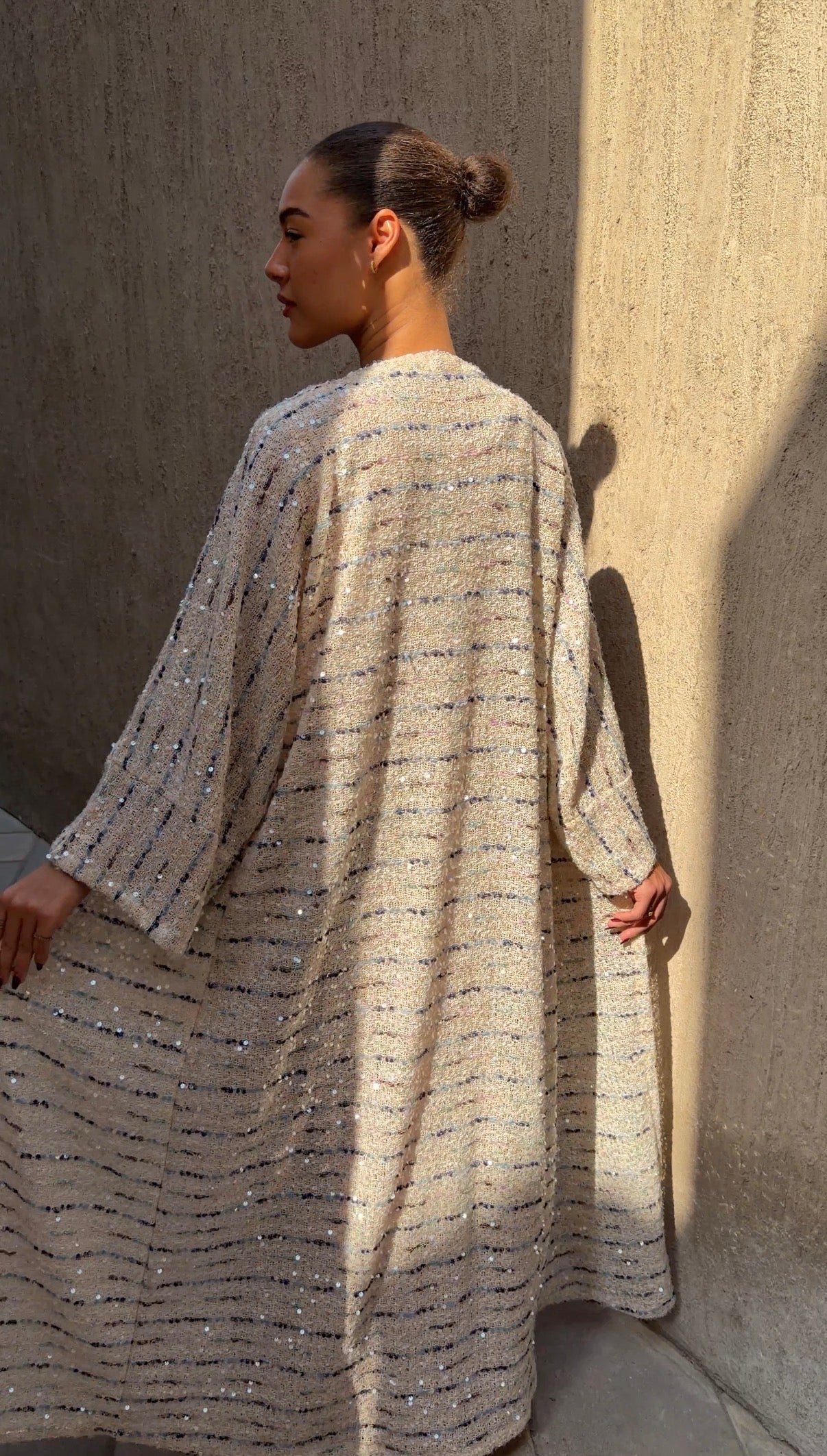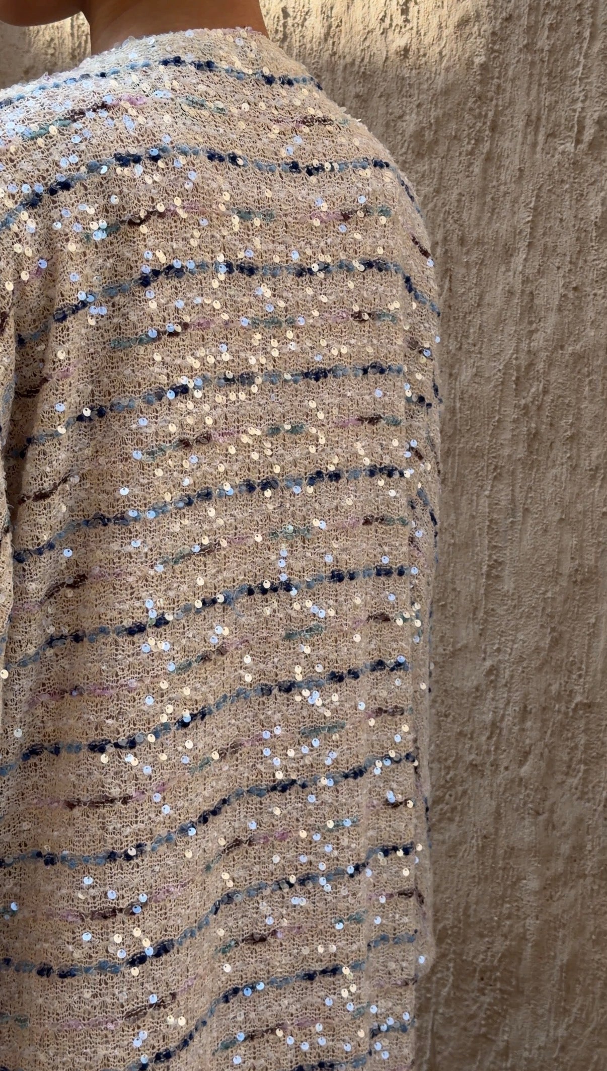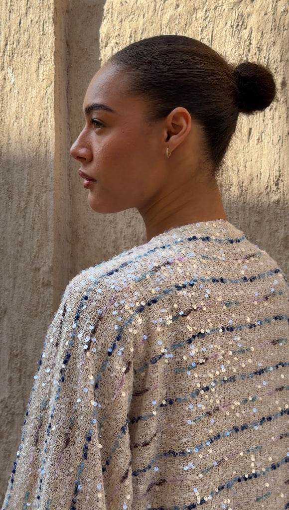 A creamy crochet base woven with soft pastel threads — hints of lilac, blush, and sky blue scattered like confetti in sunlight. Detailed with embroidered clear sequins that glimmer gently as you move, this piece feels cozy yet refined — the kind you’ll reach for when you want effortless elegance with a touch of joy.