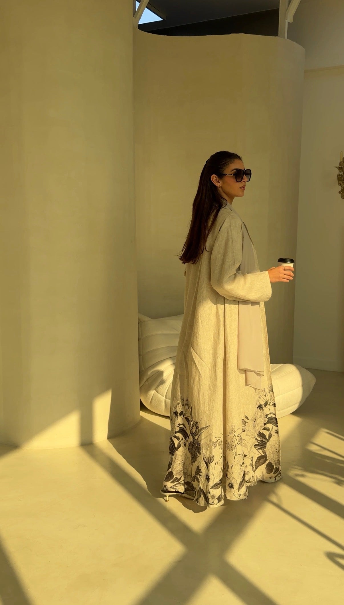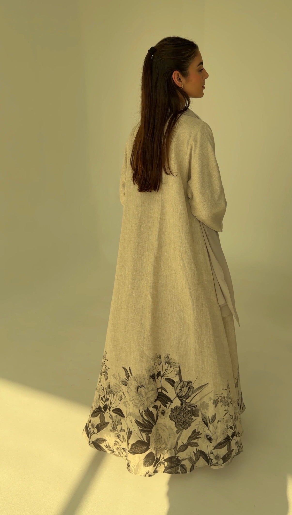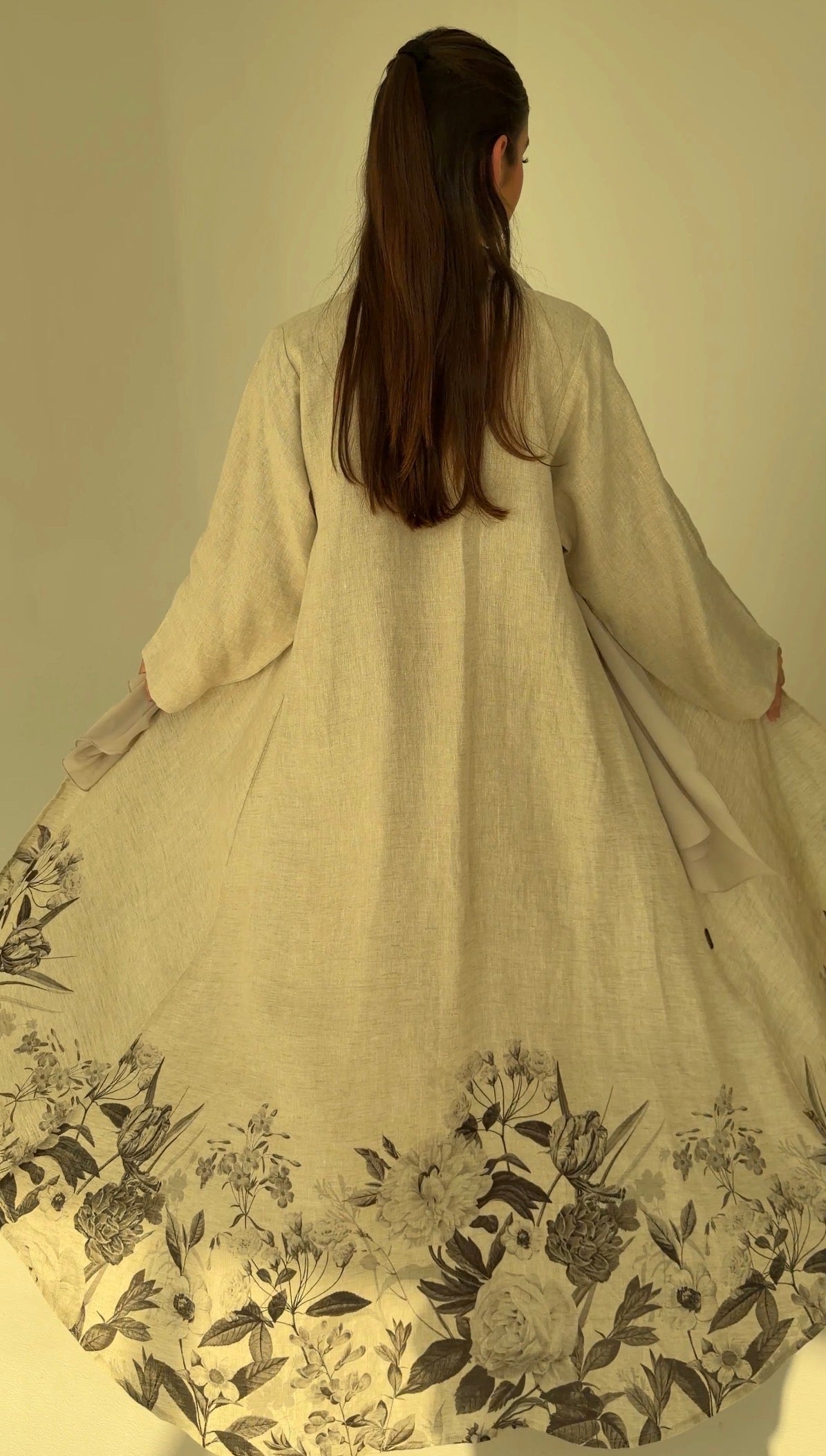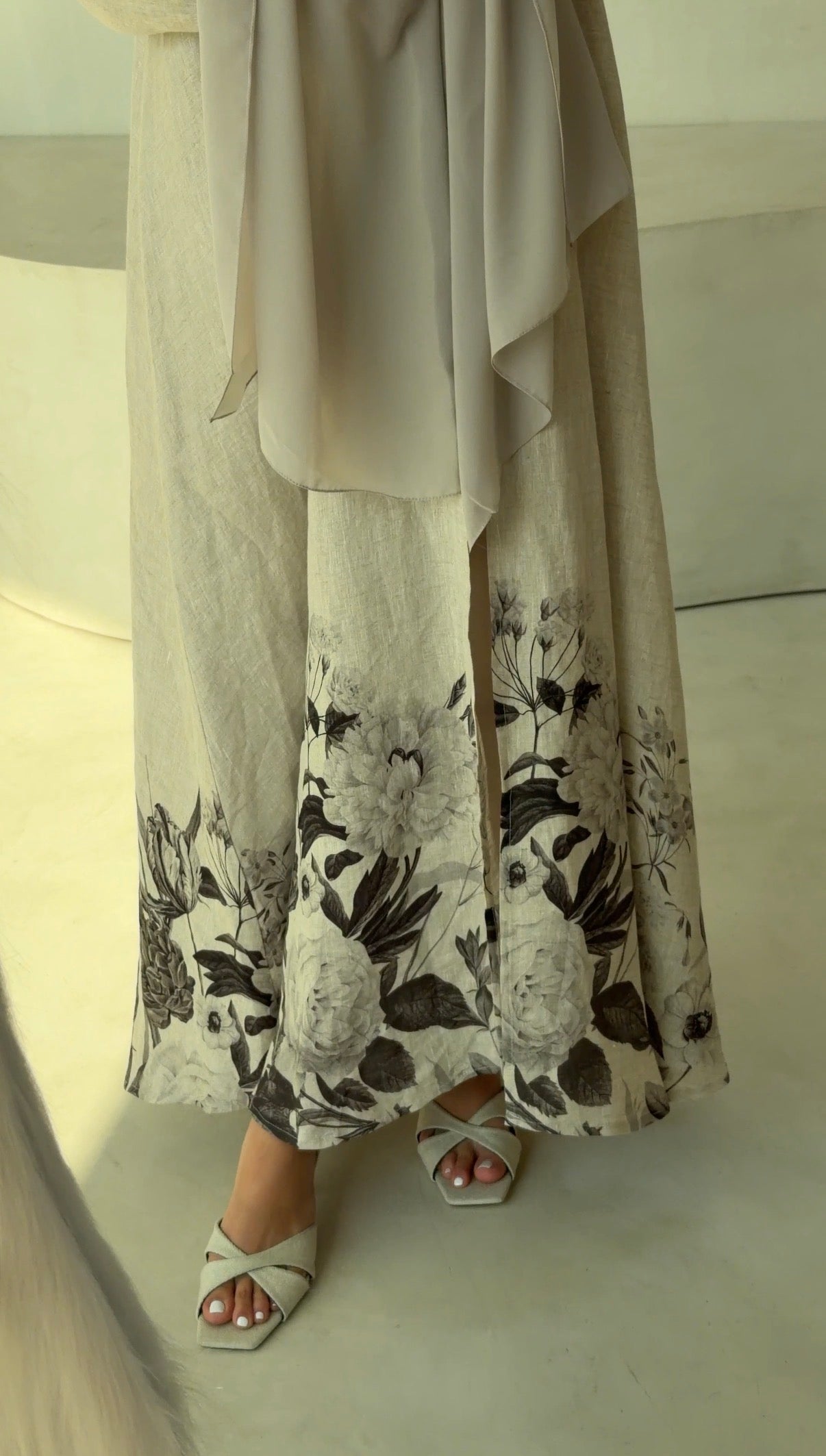 Our best-selling silhouette in raw, breathable ivory linen, finished with a striking black-and-white floral border at the hem. The contrast feels intentional and bold without overpowering, adding that quiet, confident edge. Designed in a single layer with an umbrella-style flow, it moves with ease and wears effortlessly cool — understated, but unmistakably statement.
