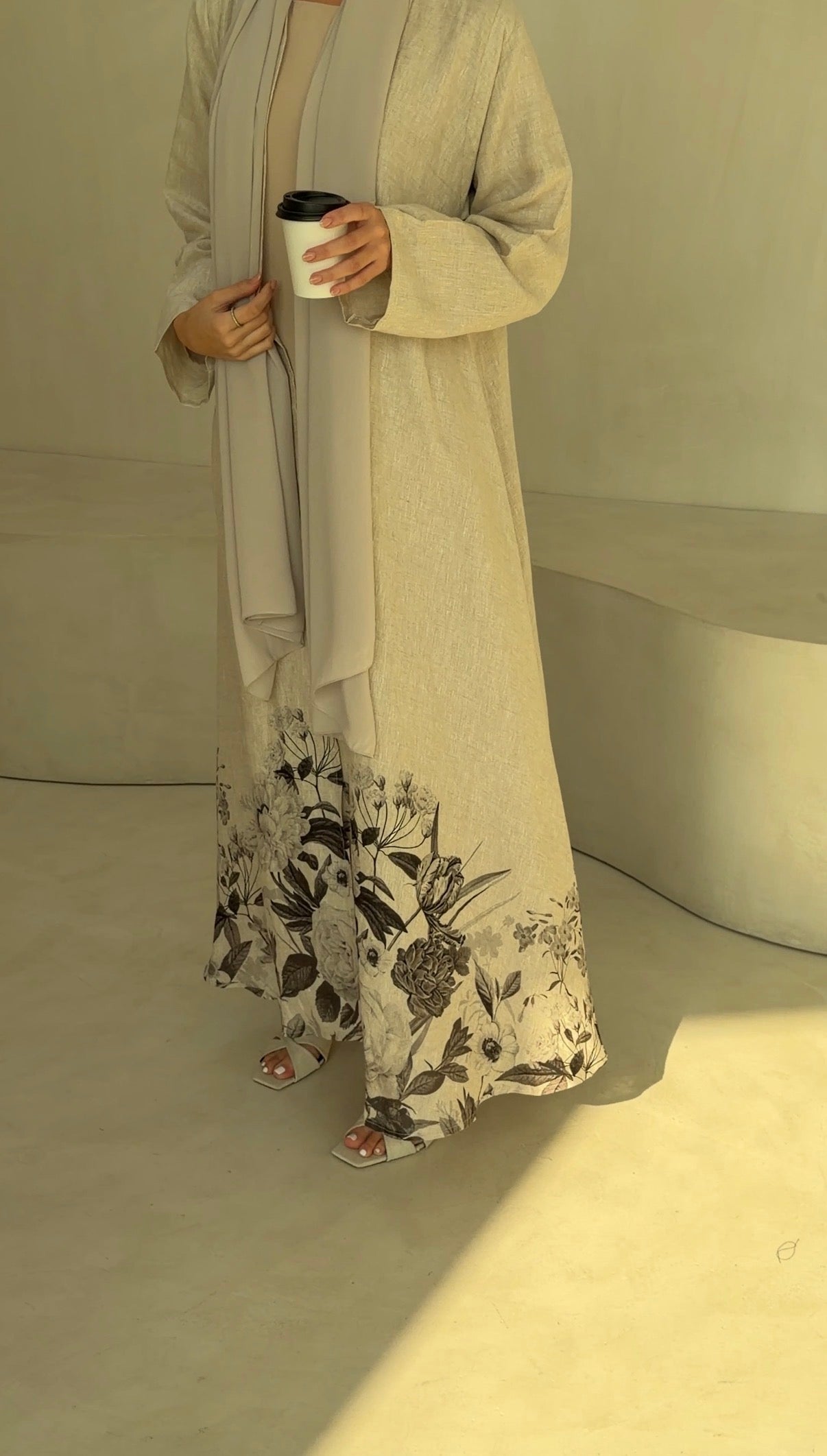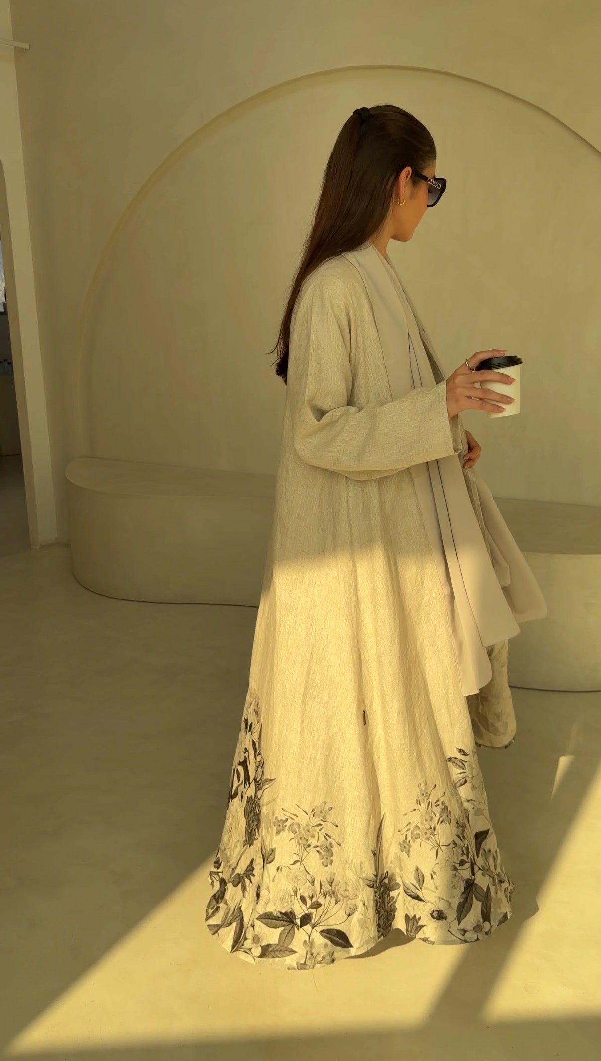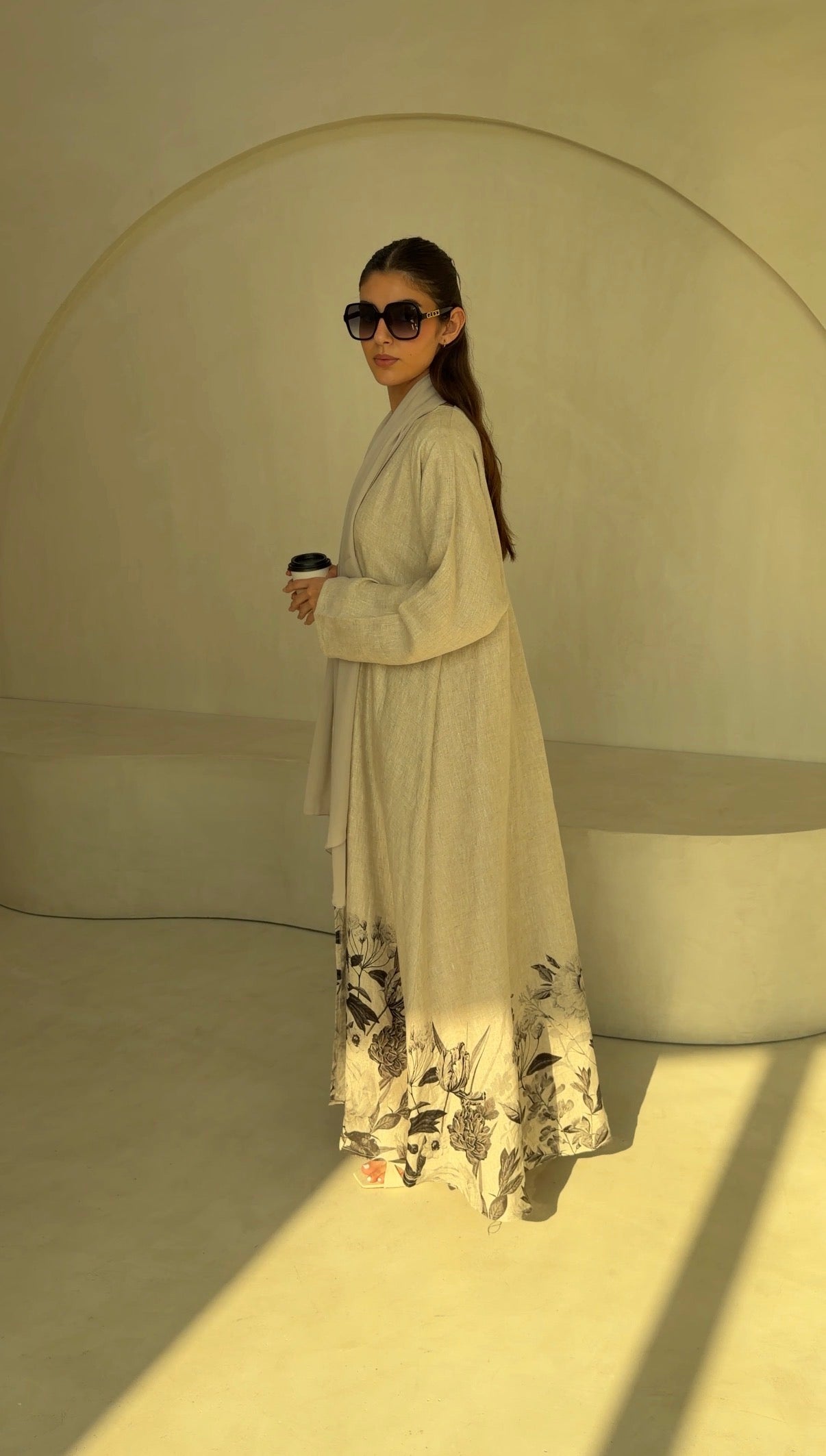 Our best-selling silhouette in raw, breathable ivory linen, finished with a striking black-and-white floral border at the hem. The contrast feels intentional and bold without overpowering, adding that quiet, confident edge. Designed in a single layer with an umbrella-style flow, it moves with ease and wears effortlessly cool — understated, but unmistakably statement.