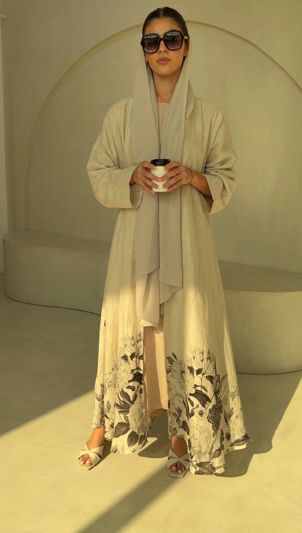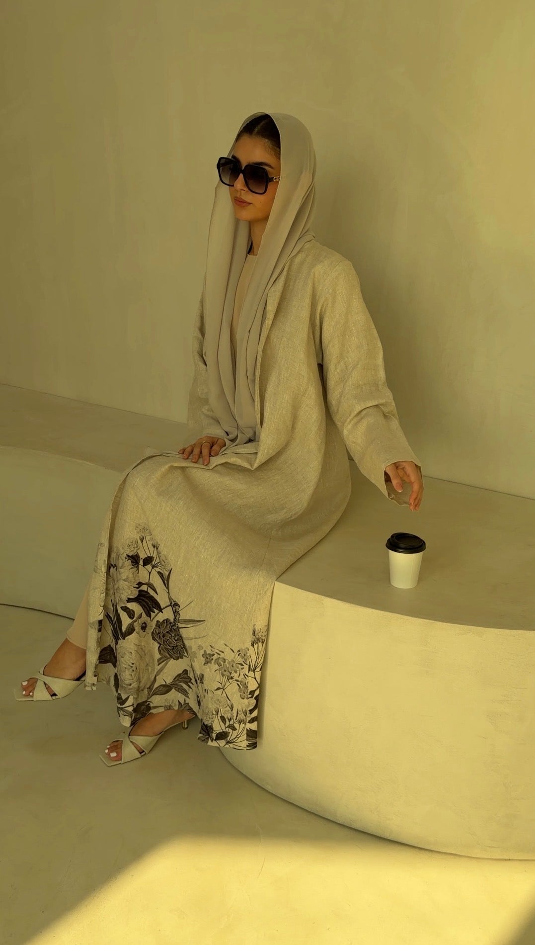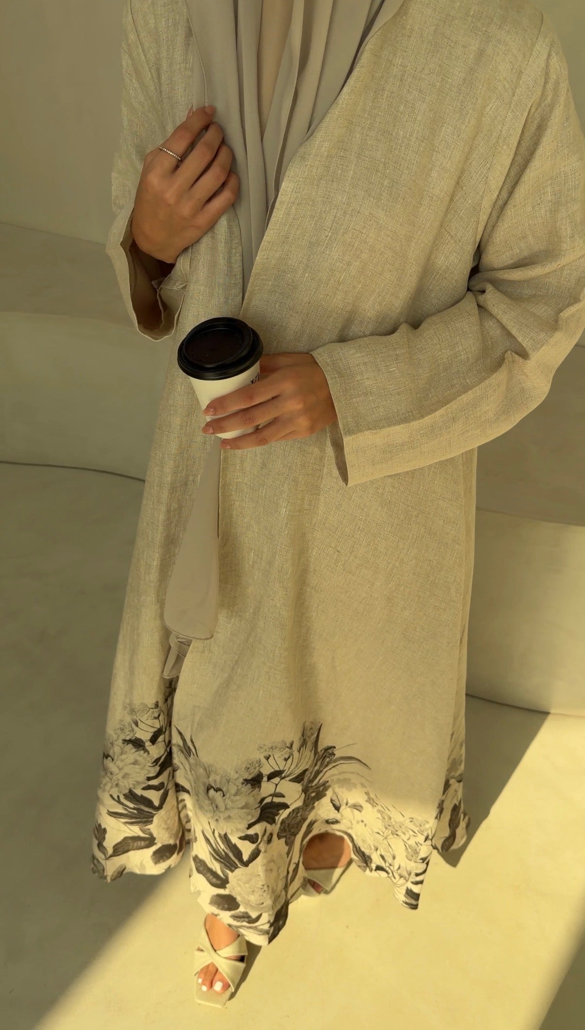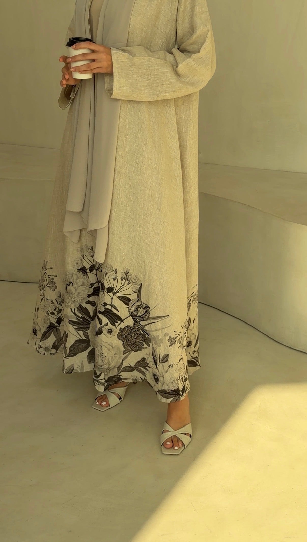 Our best-selling silhouette in raw, breathable ivory linen, finished with a striking black-and-white floral border at the hem. The contrast feels intentional and bold without overpowering, adding that quiet, confident edge. Designed in a single layer with an umbrella-style flow, it moves with ease and wears effortlessly cool — understated, but unmistakably statement.