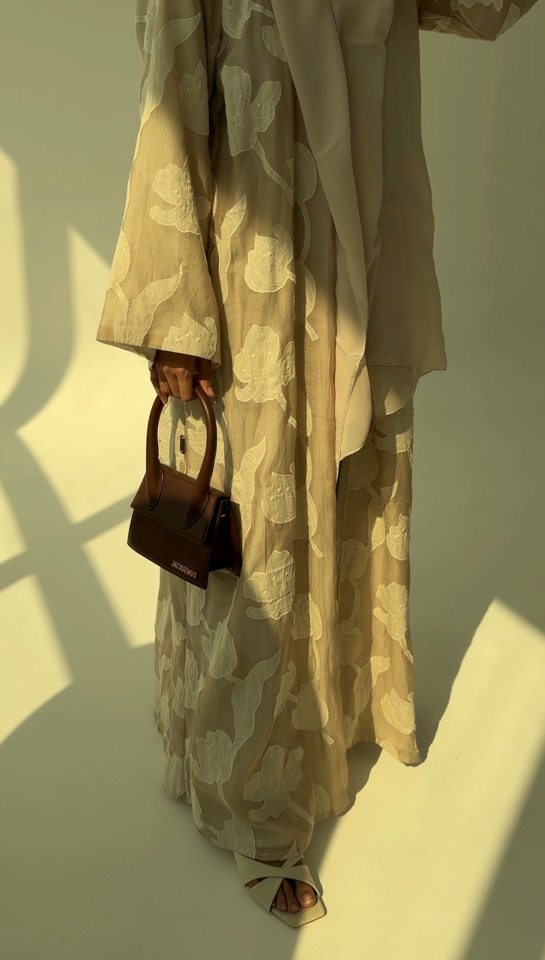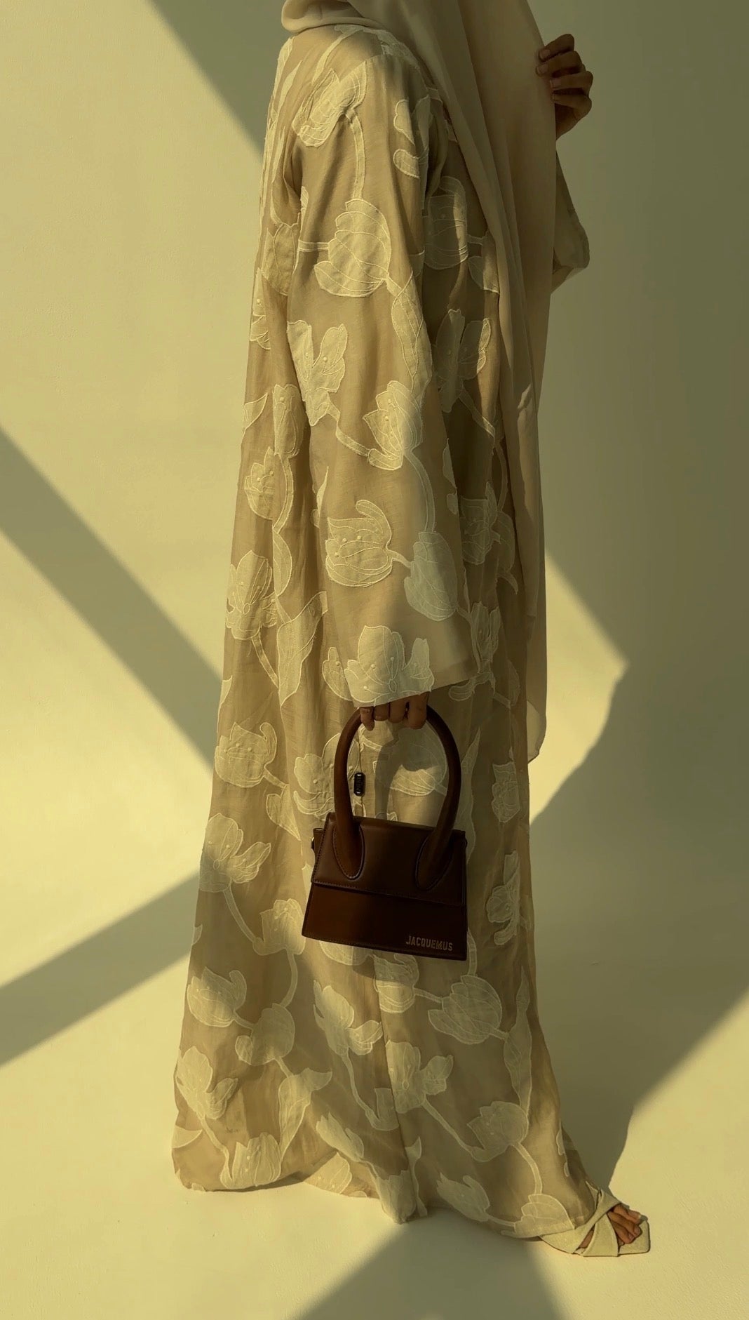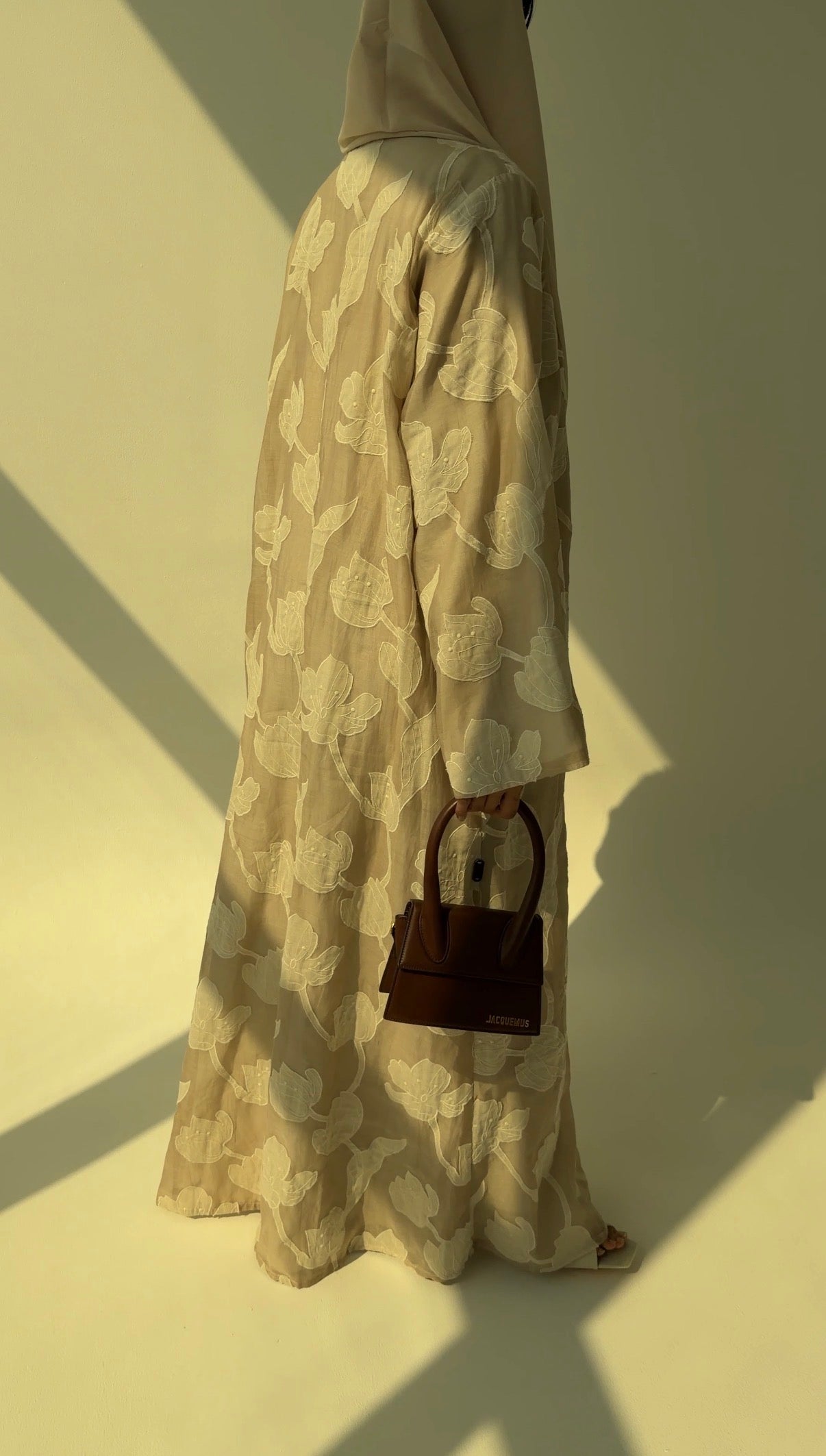 Featherlight silk-cotton blend fabric layered with oversized tonal petal appliqué that softly drifts across a warm oat-beige base. The ivory blooms add quiet dimension, catching light gently without any shine.