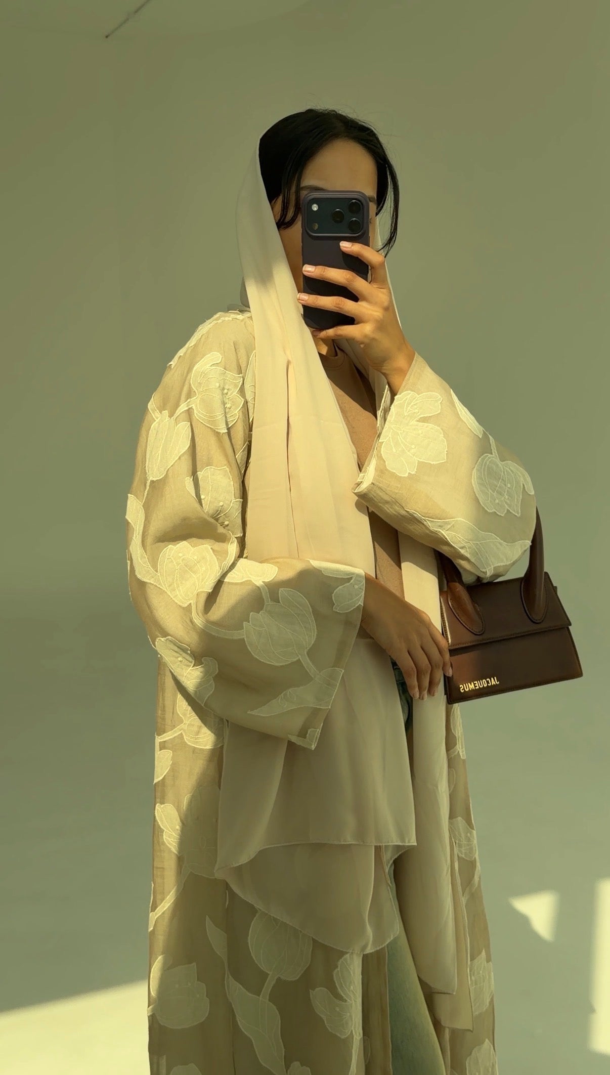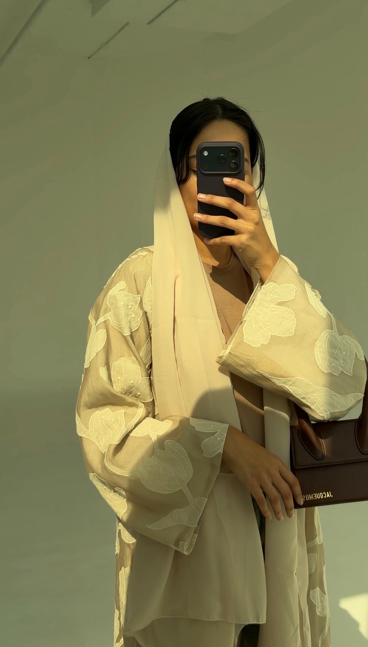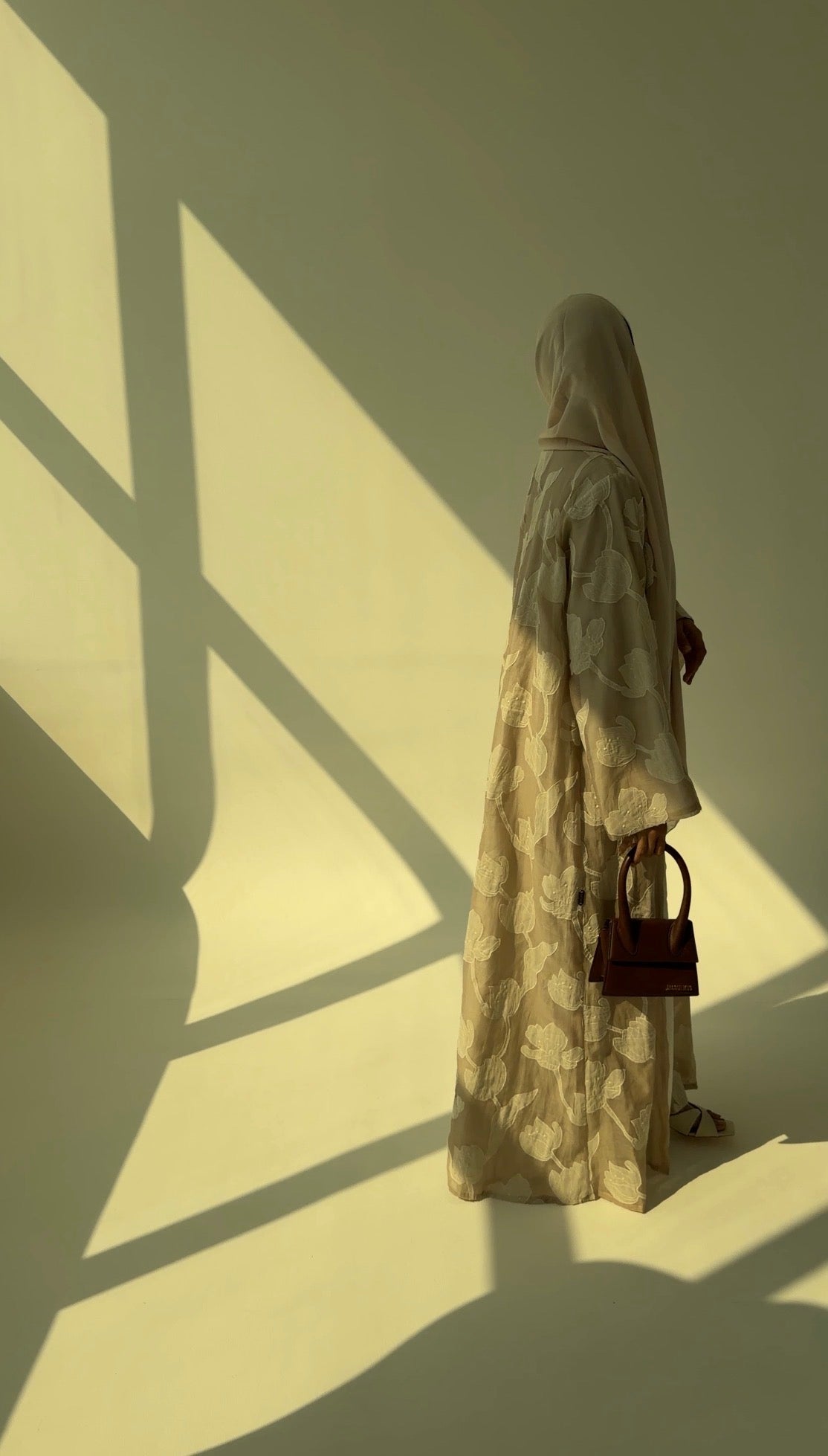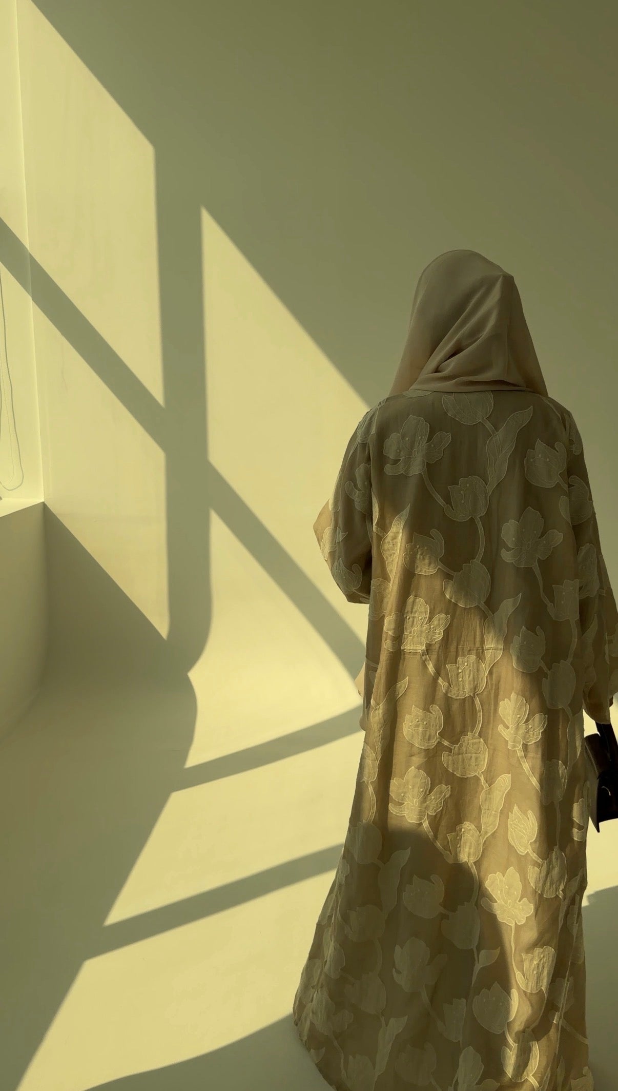 Featherlight silk-cotton blend fabric layered with oversized tonal petal appliqué that softly drifts across a warm oat-beige base. The ivory blooms add quiet dimension, catching light gently without any shine.