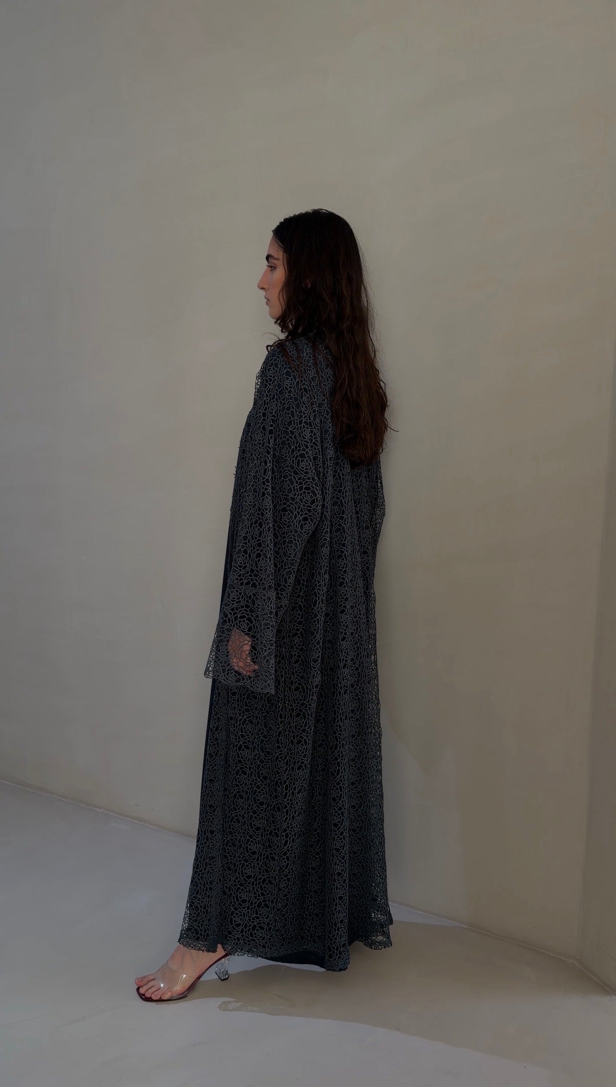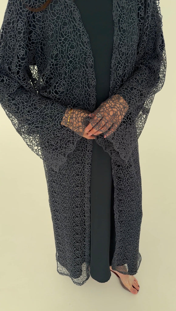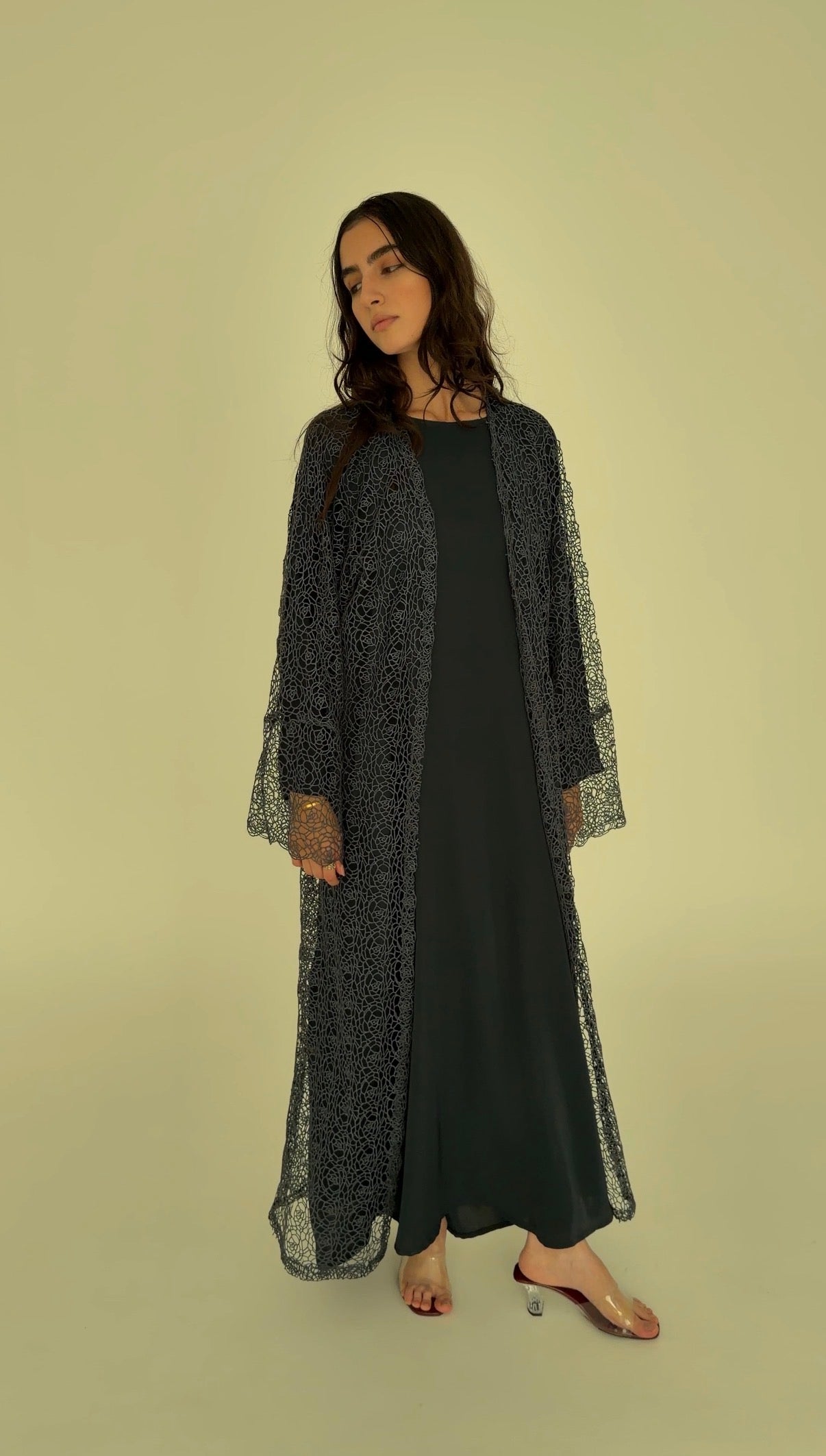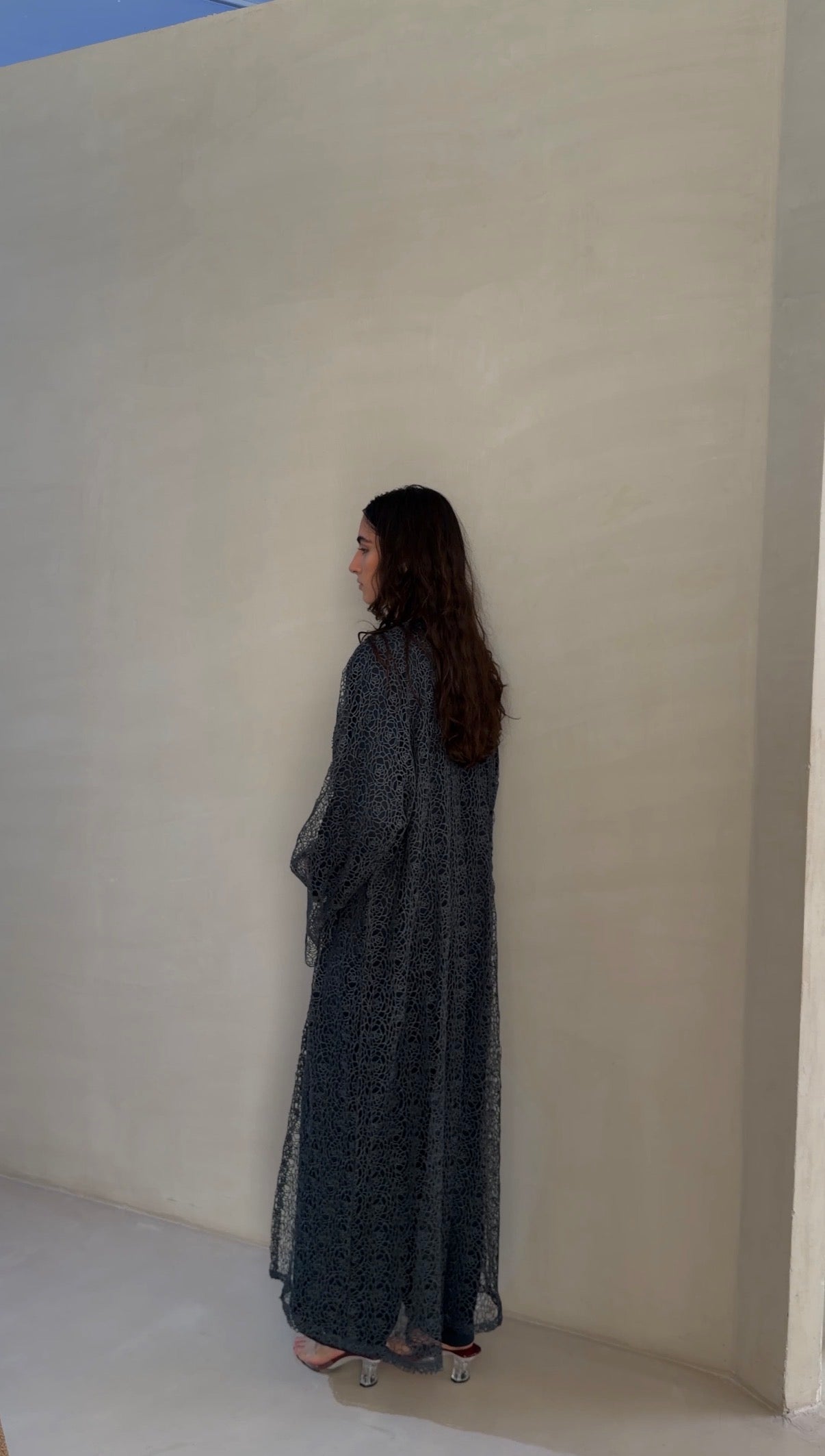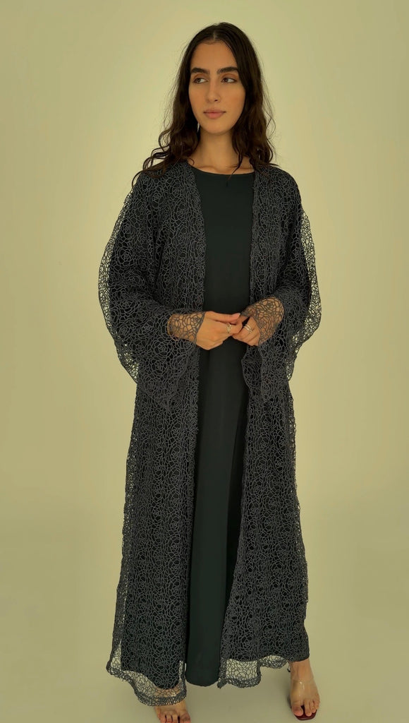 A sheer, barely-there deep green lace layer that flows like air. The intricate meshwork forms a delicate tangle of threads — light, textural, and quietly grounded. Its soft transparency and natural tone evoke an earthy kind of elegance, blending ease with quiet strength. A fluid statement piece for days that call for subtle depth.