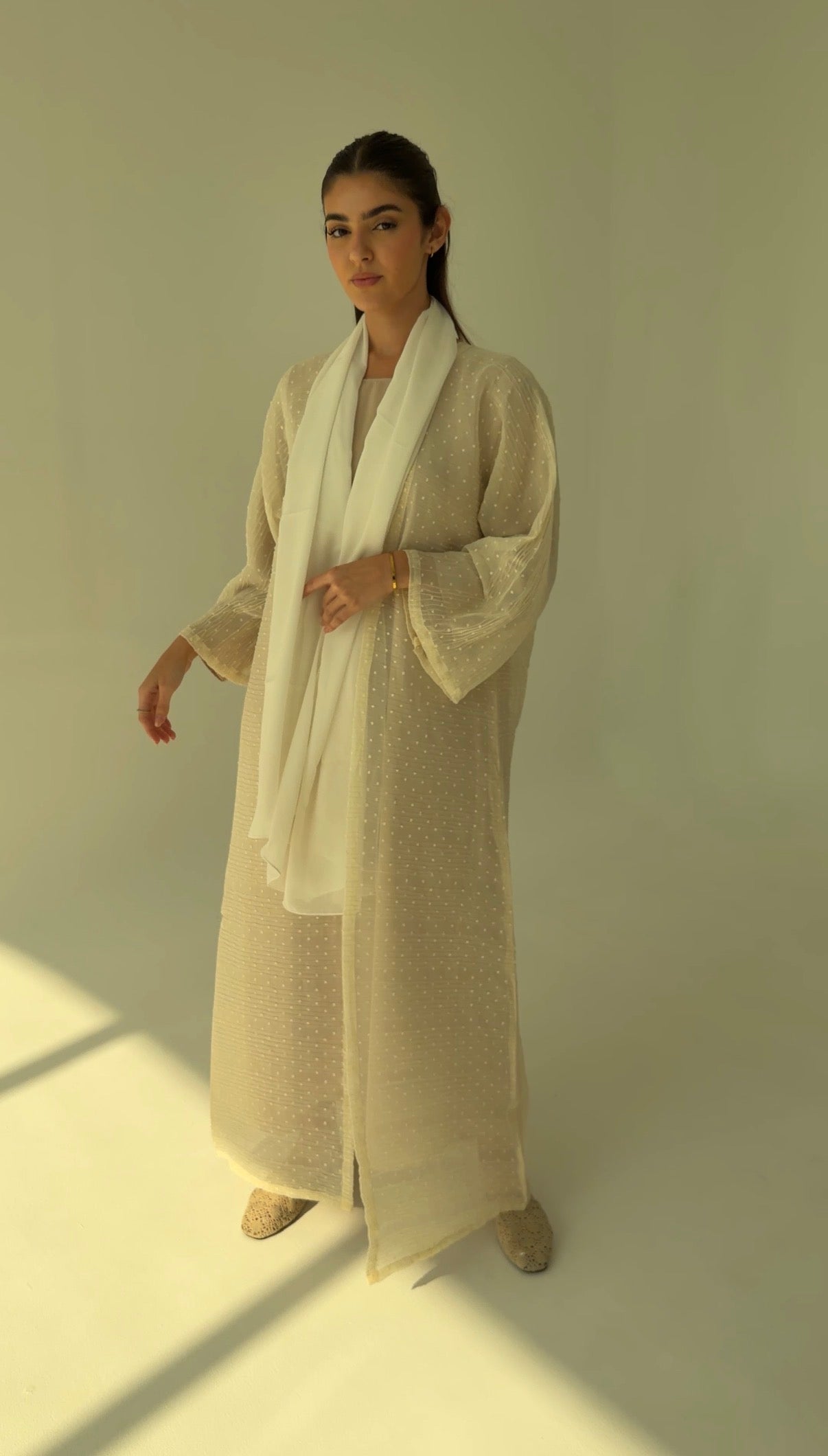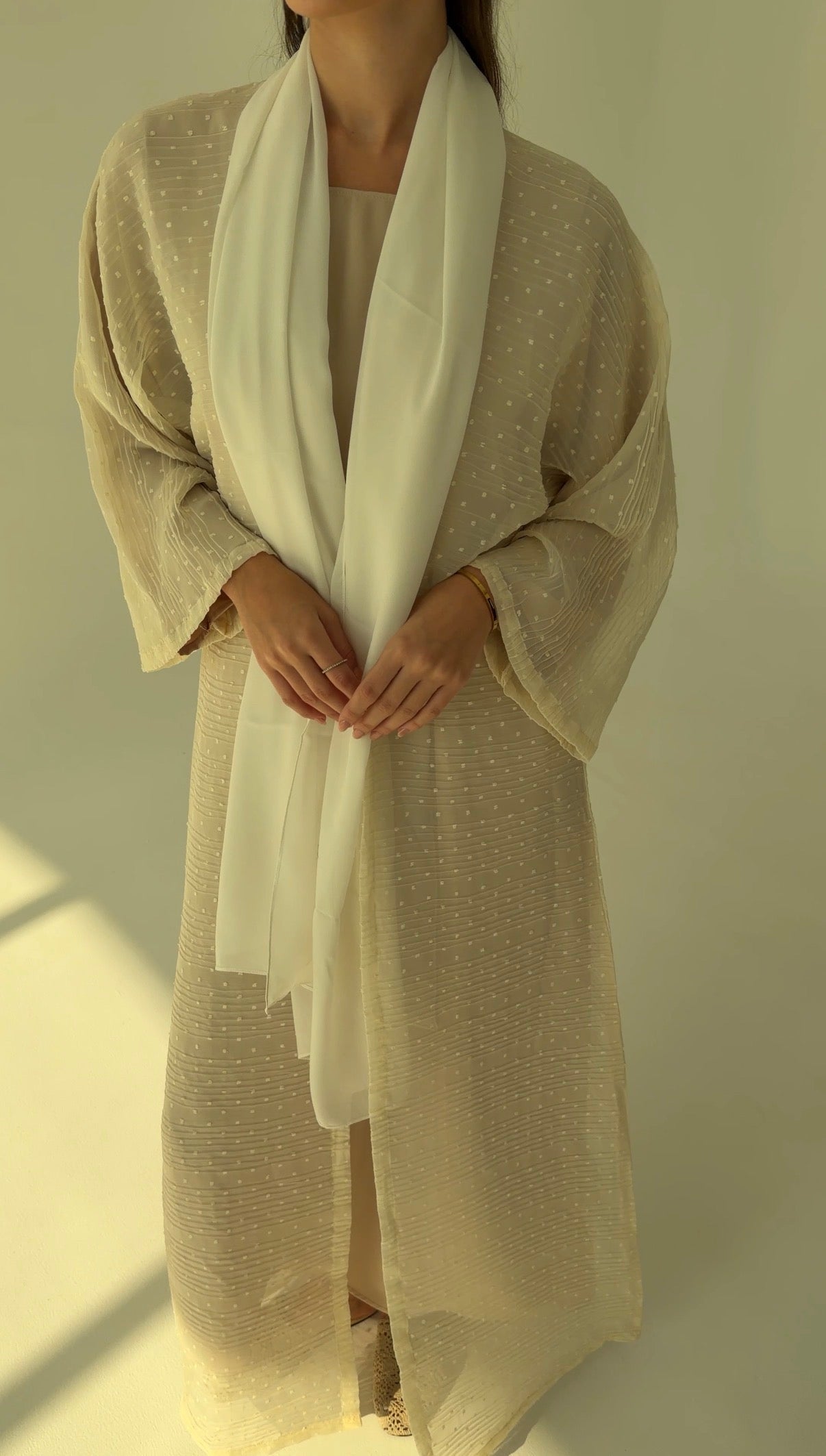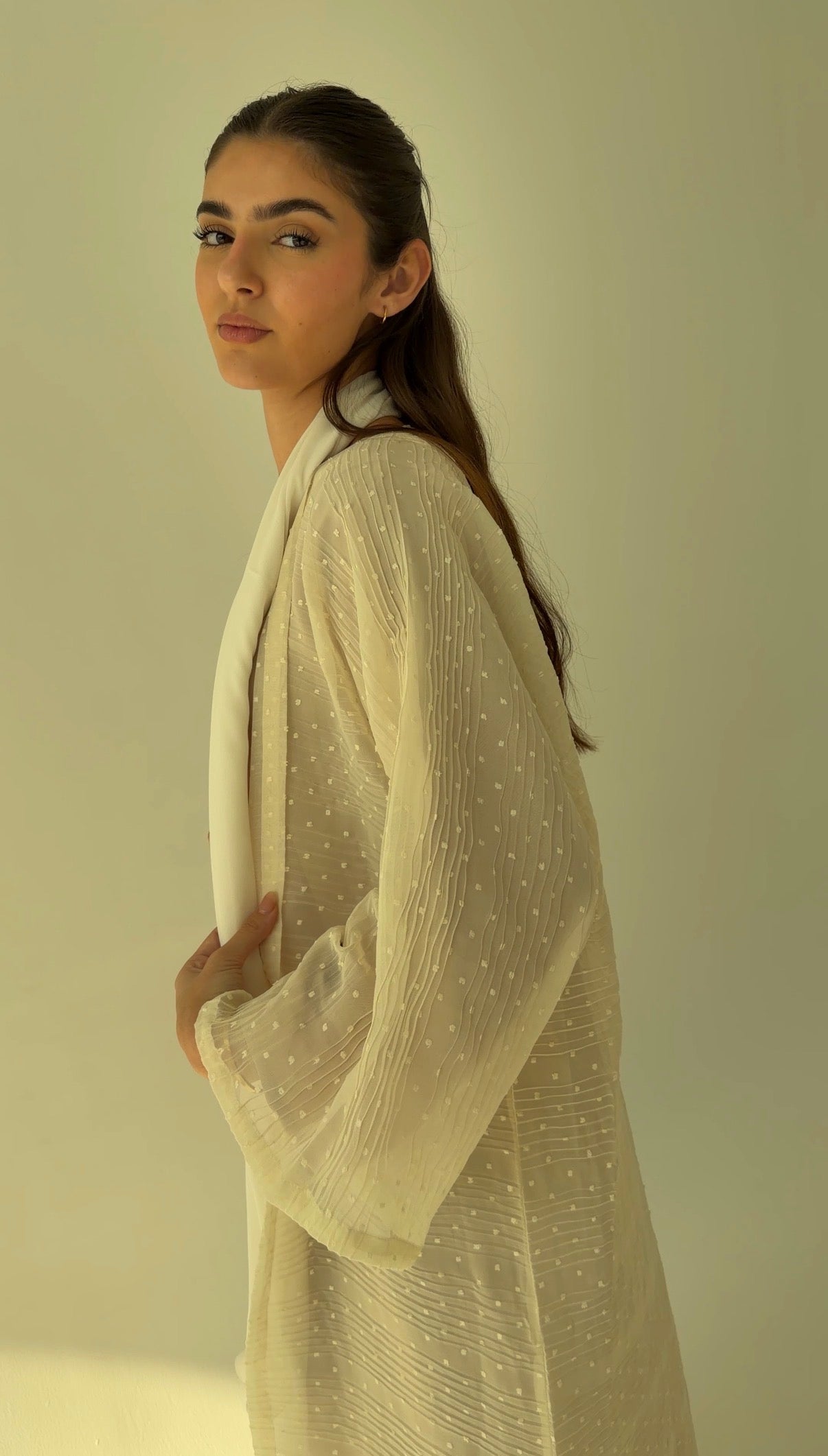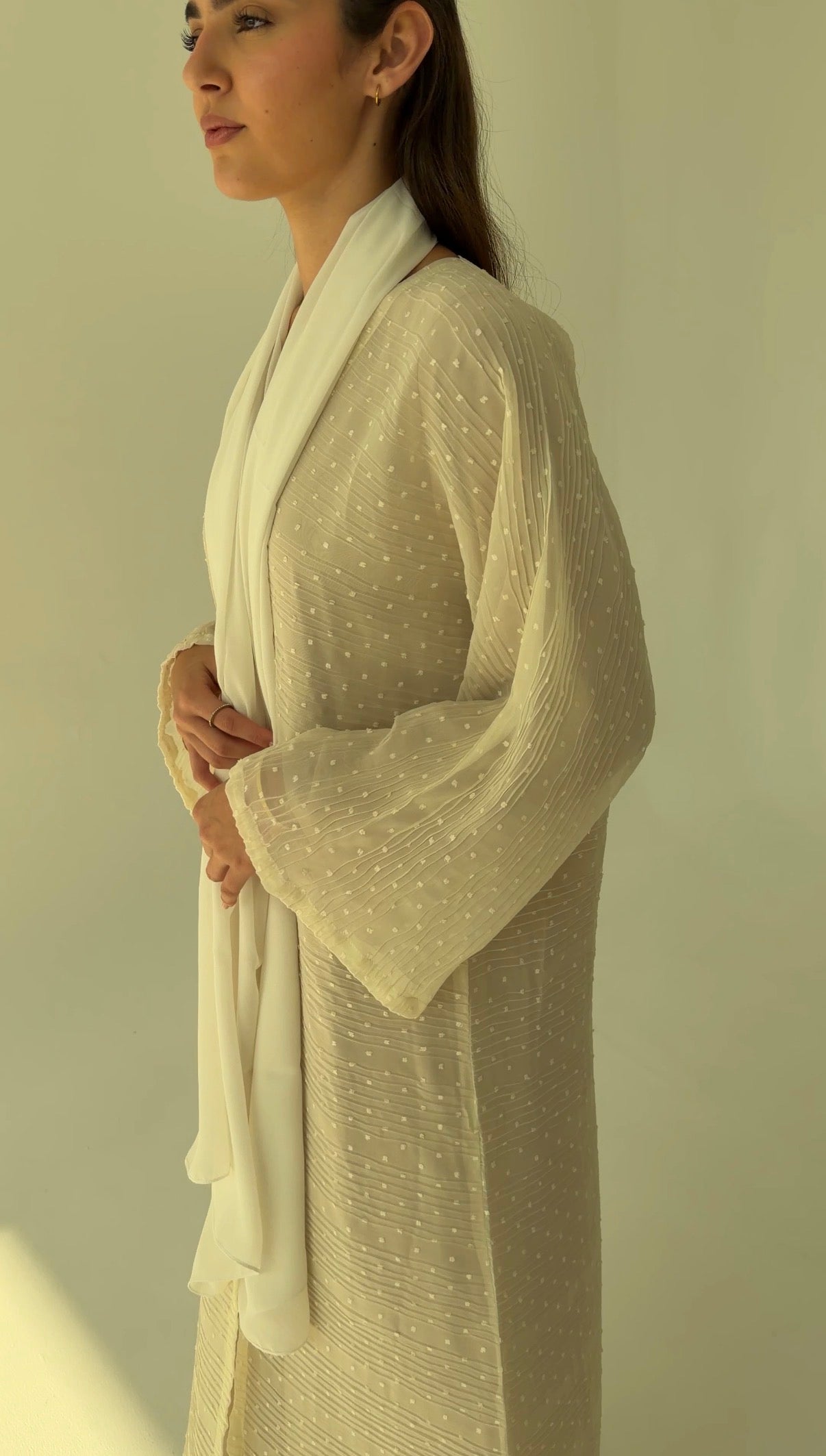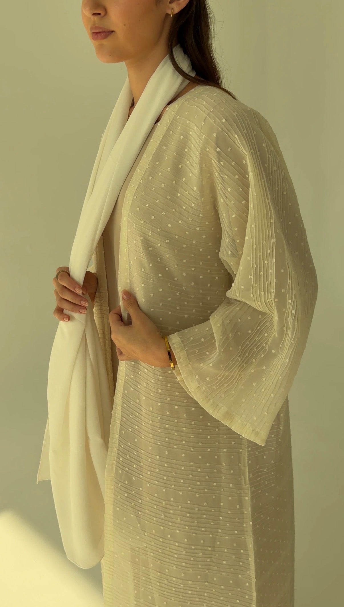 Ivory textured georgette with ripple weave and raised dot work.