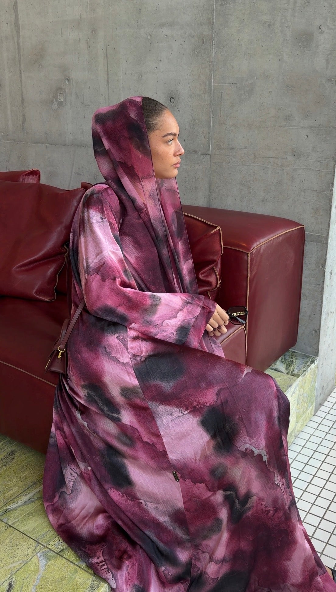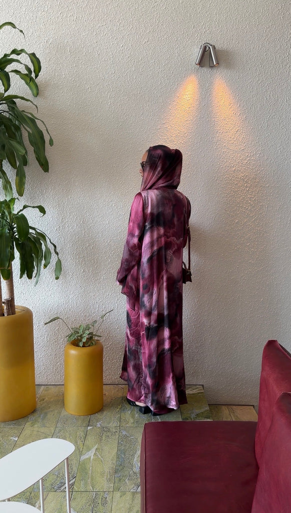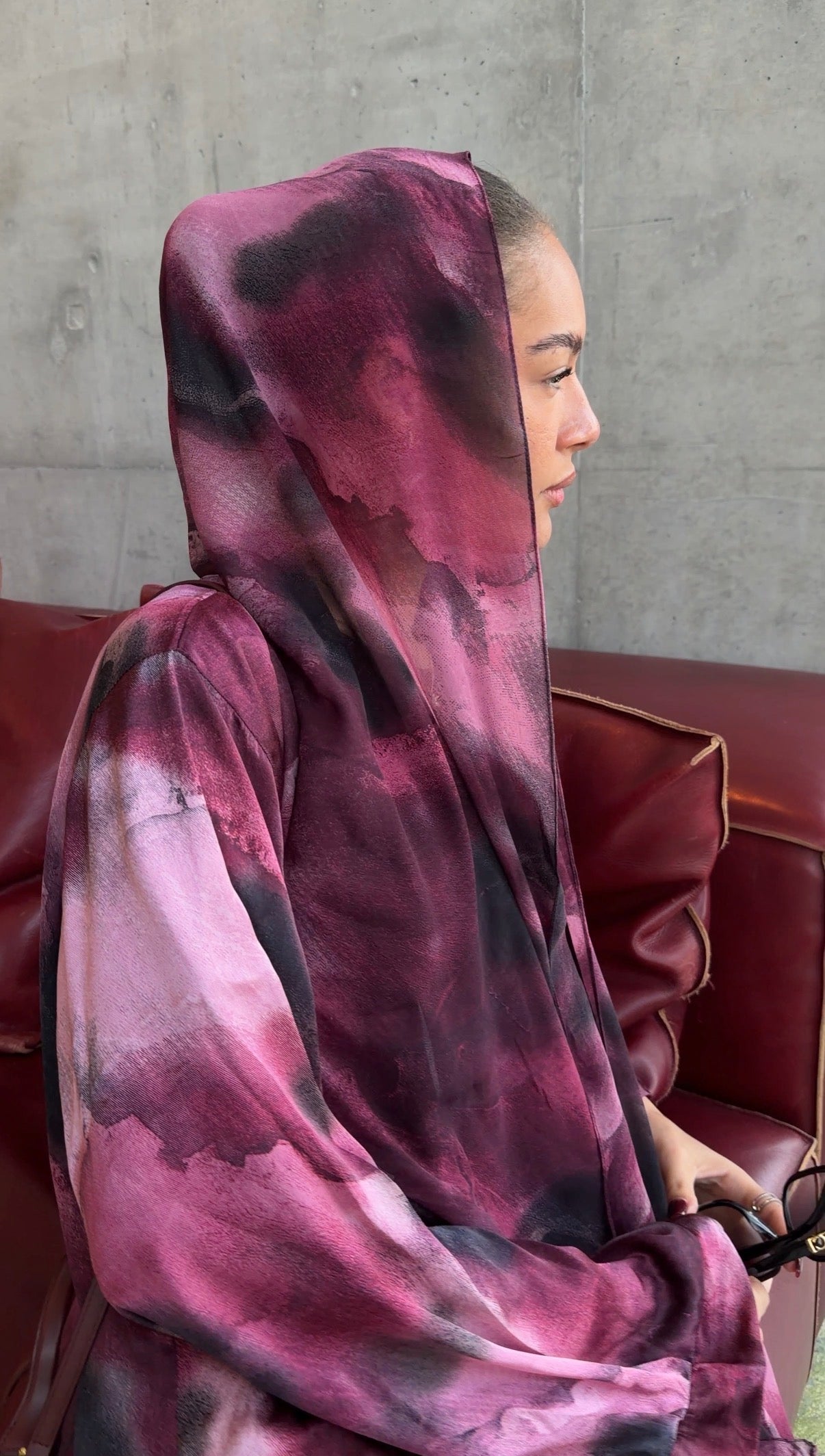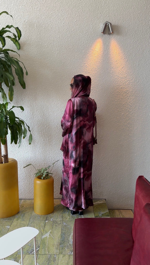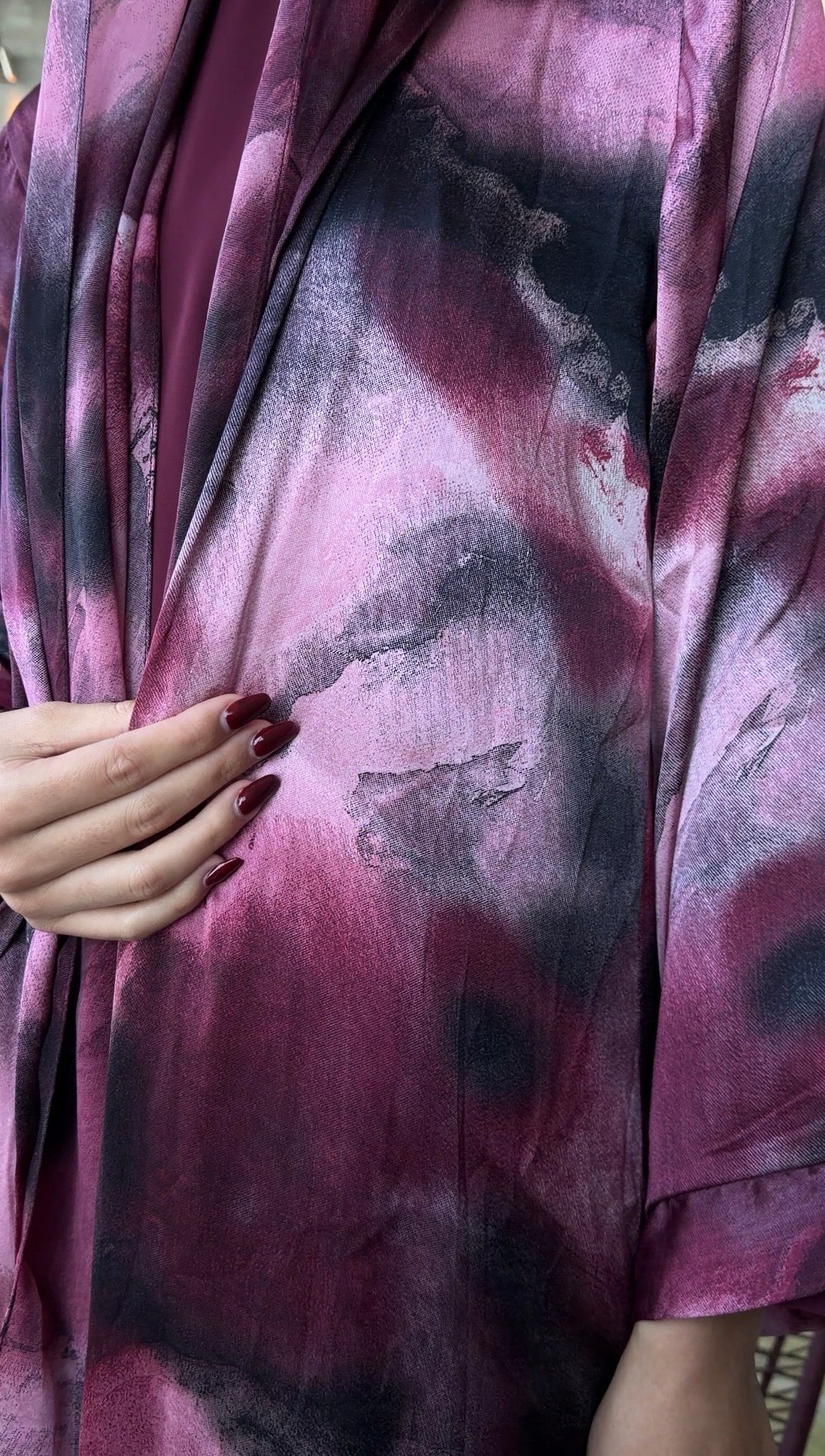 A wash of deep burgundy, crimson and rose tones flow across silky fabric like brushstrokes on canvas. The satin-silk blend moves with liquid grace — glossy, light, and fluid. Expressive yet refined, it feels like art in motion, effortlessly balanced by its soft matching chiffon scarf.