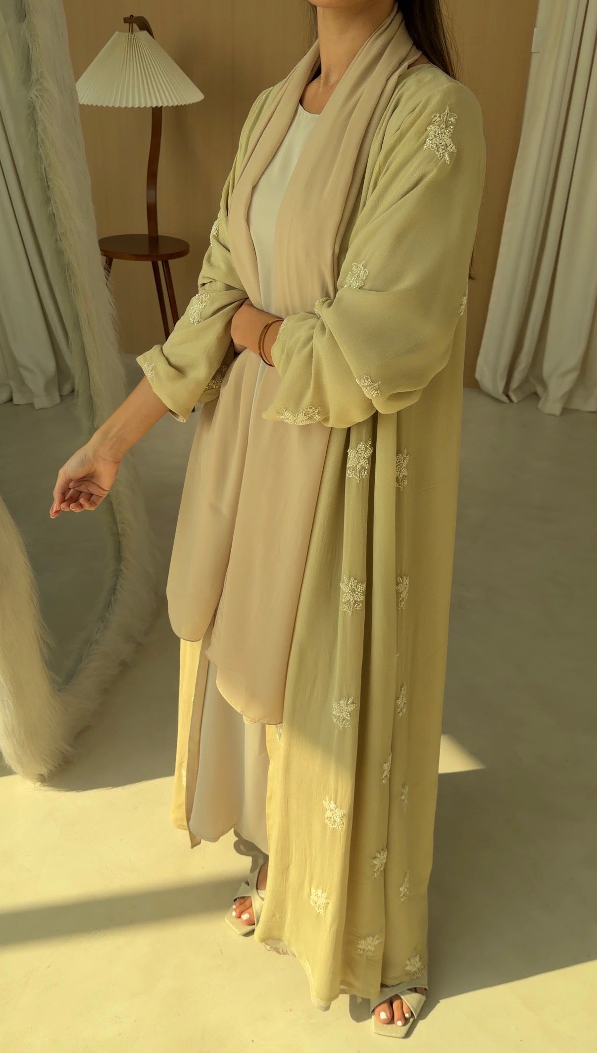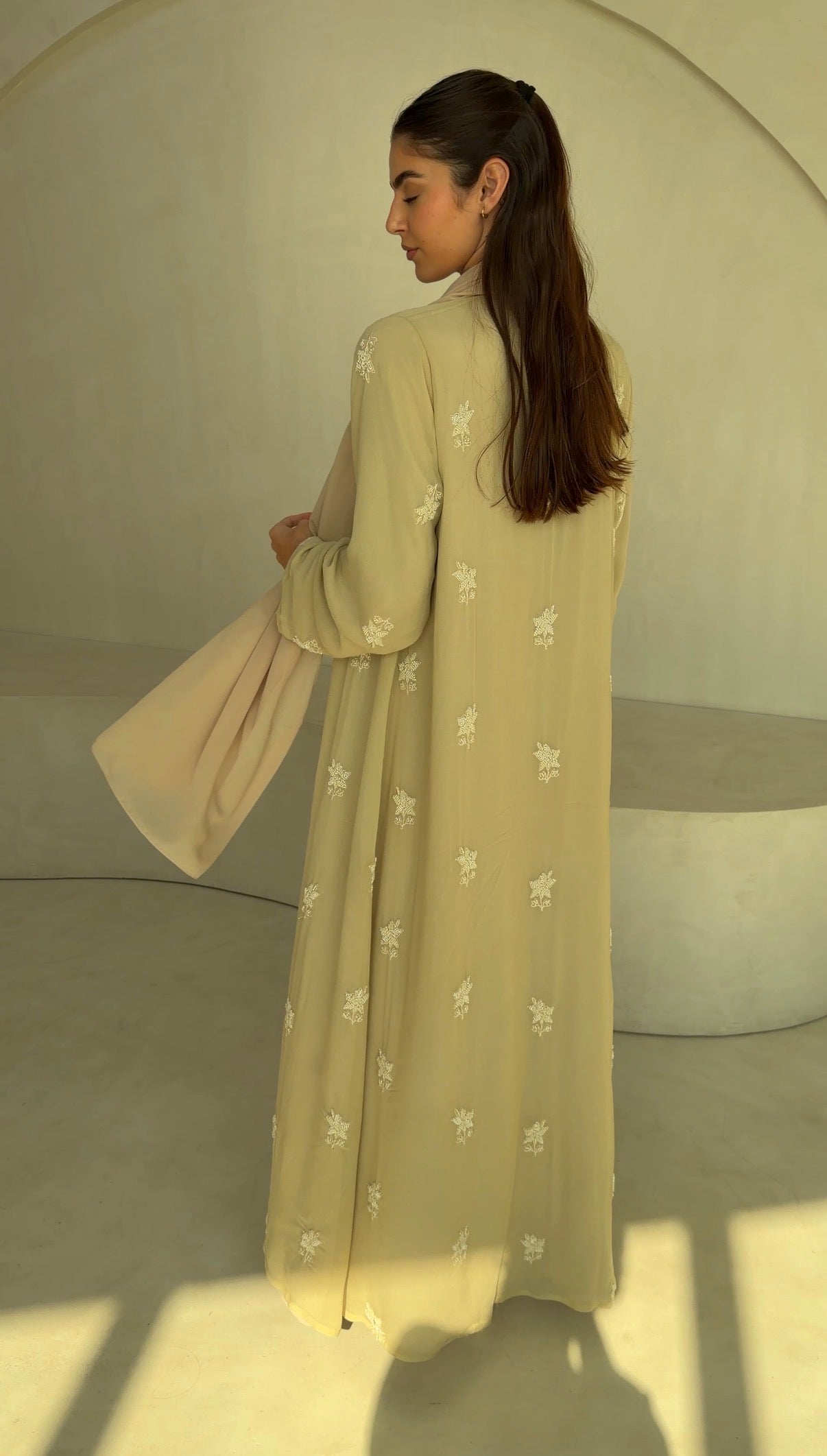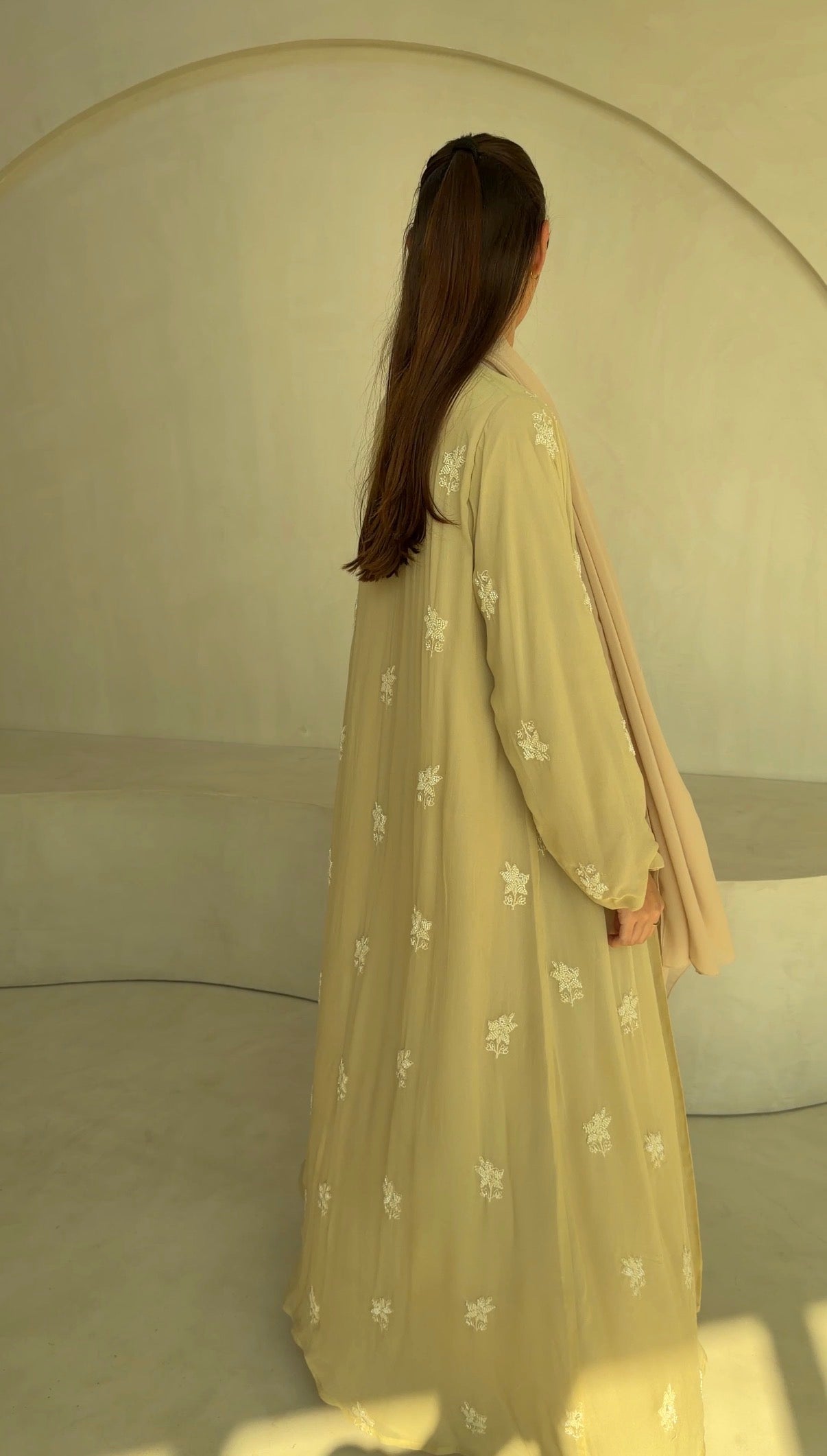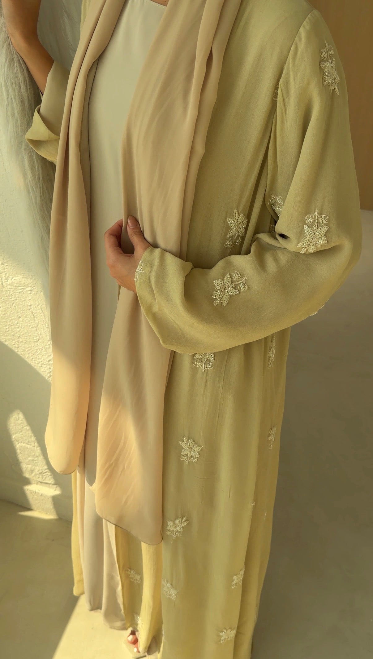 Sheer embroidered georgette abaya, fully lined with matching chiffon for coverage and fluidity.