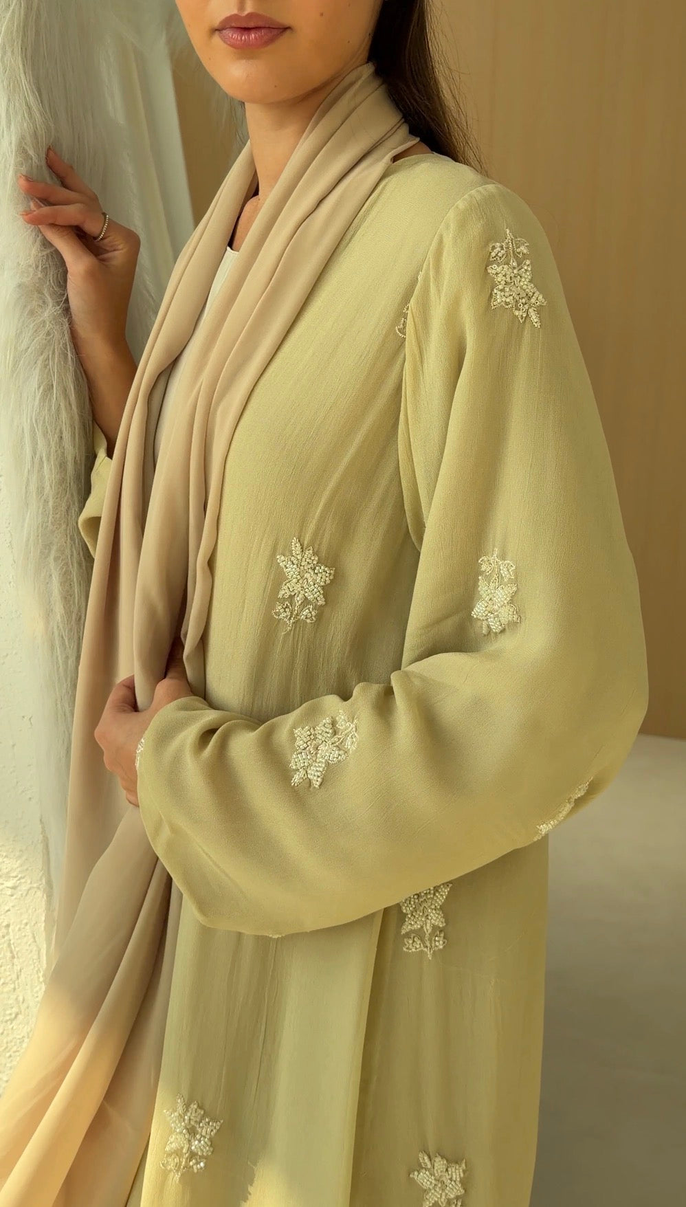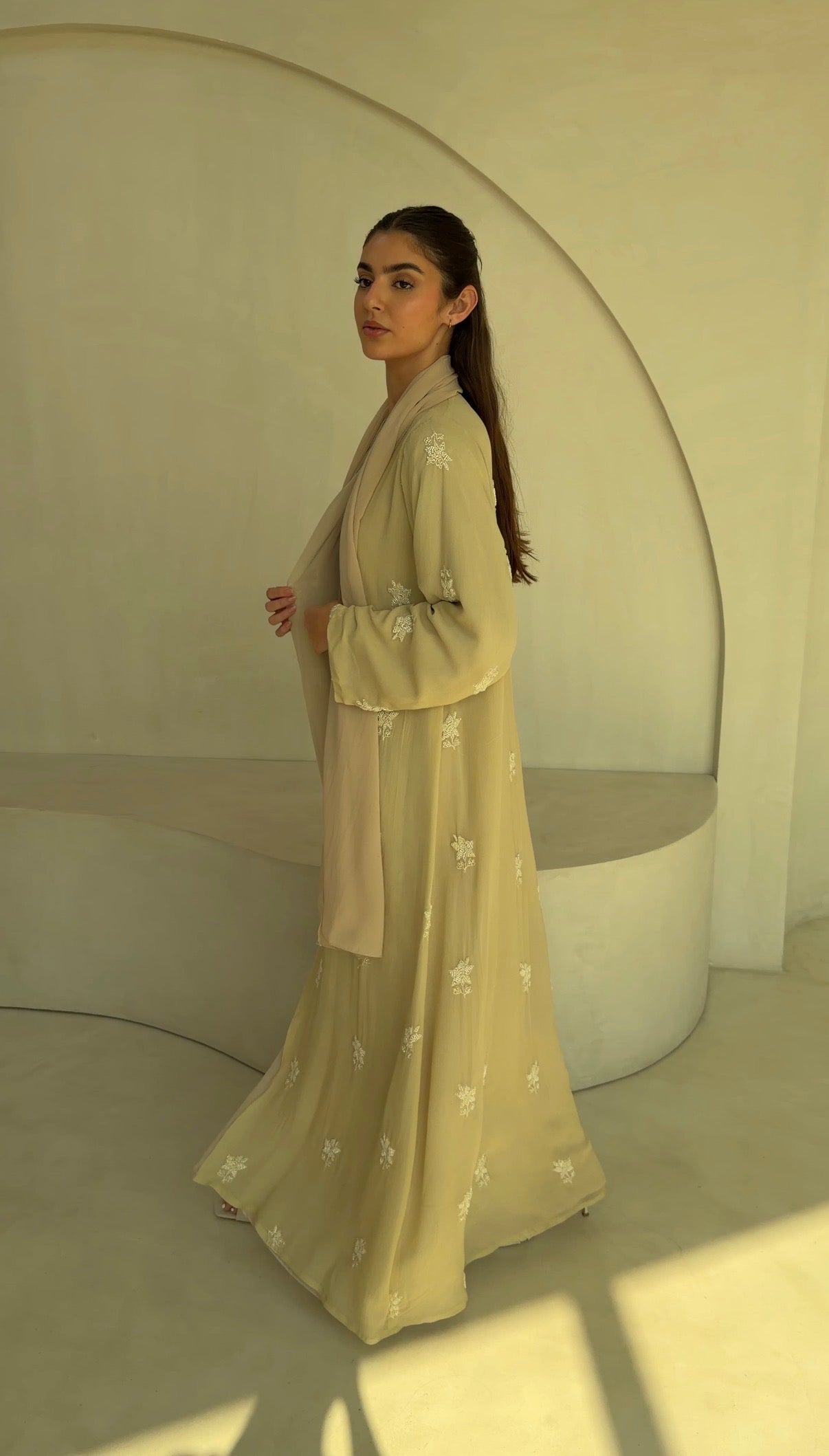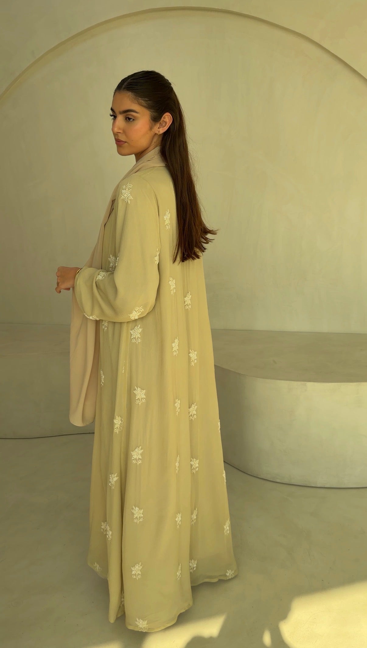 Sheer embroidered georgette abaya, fully lined with matching chiffon for coverage and fluidity.