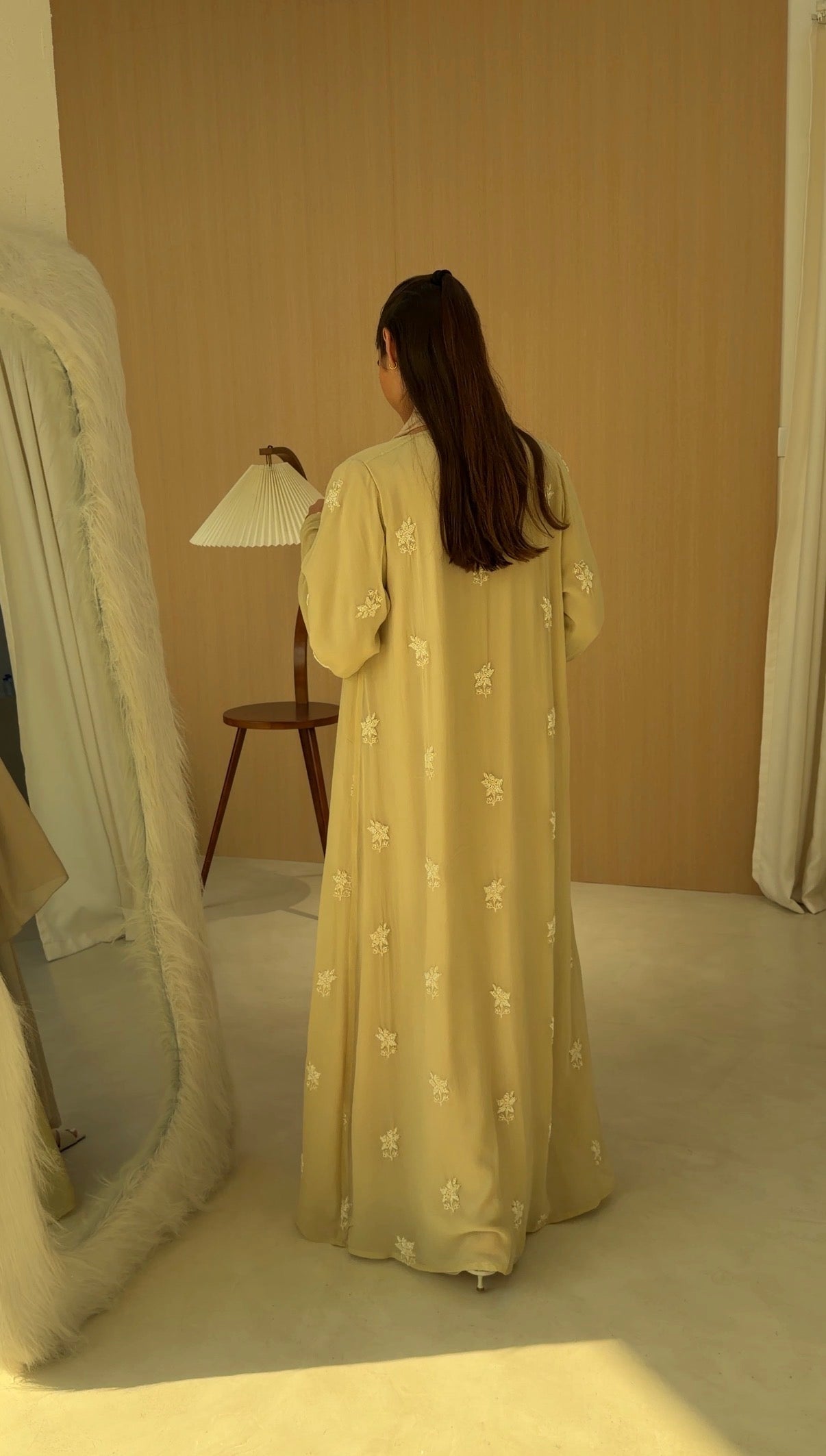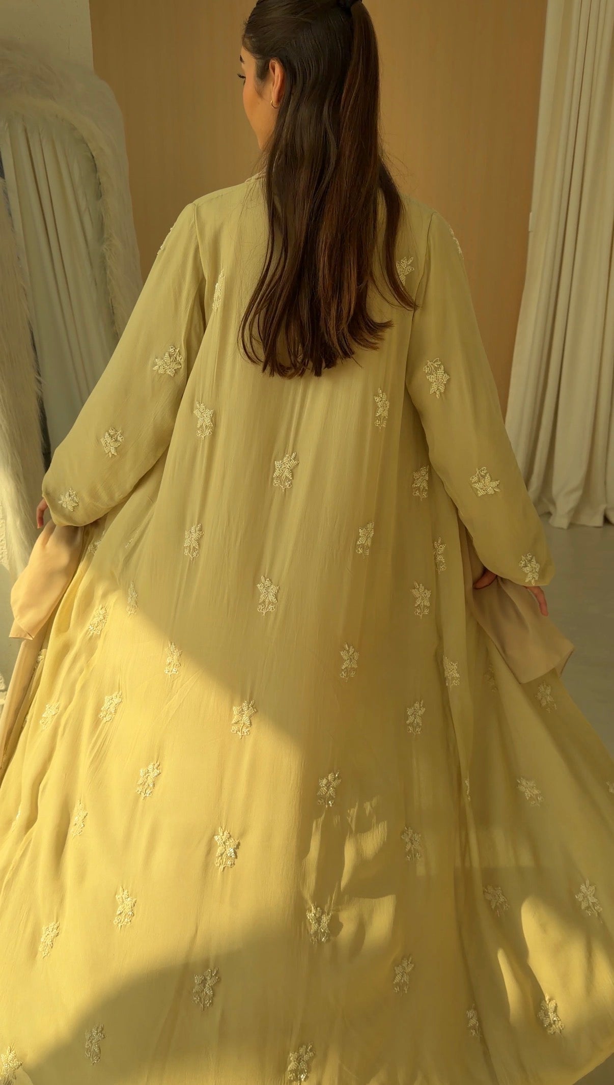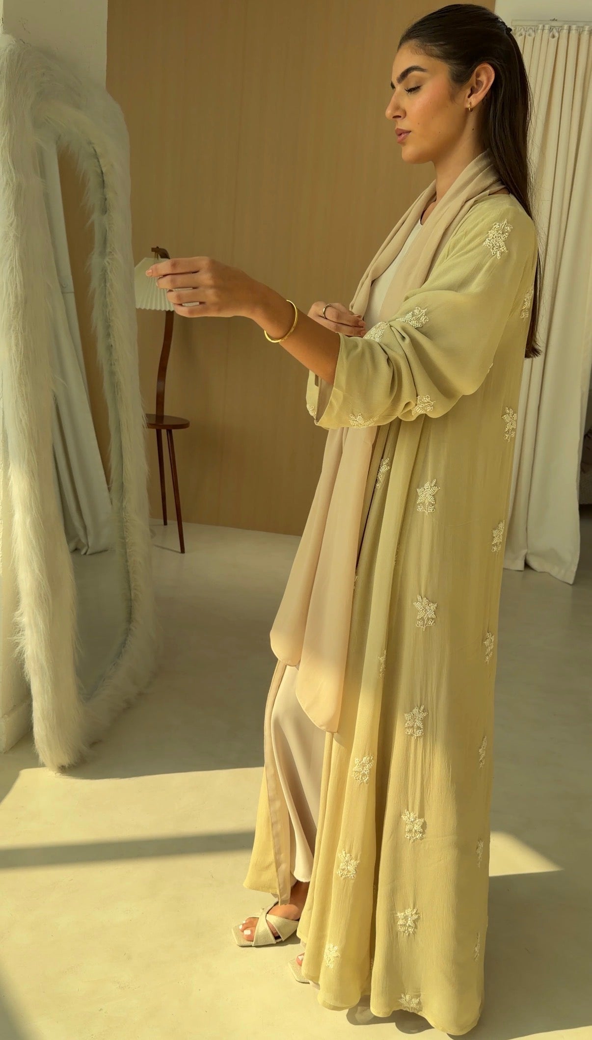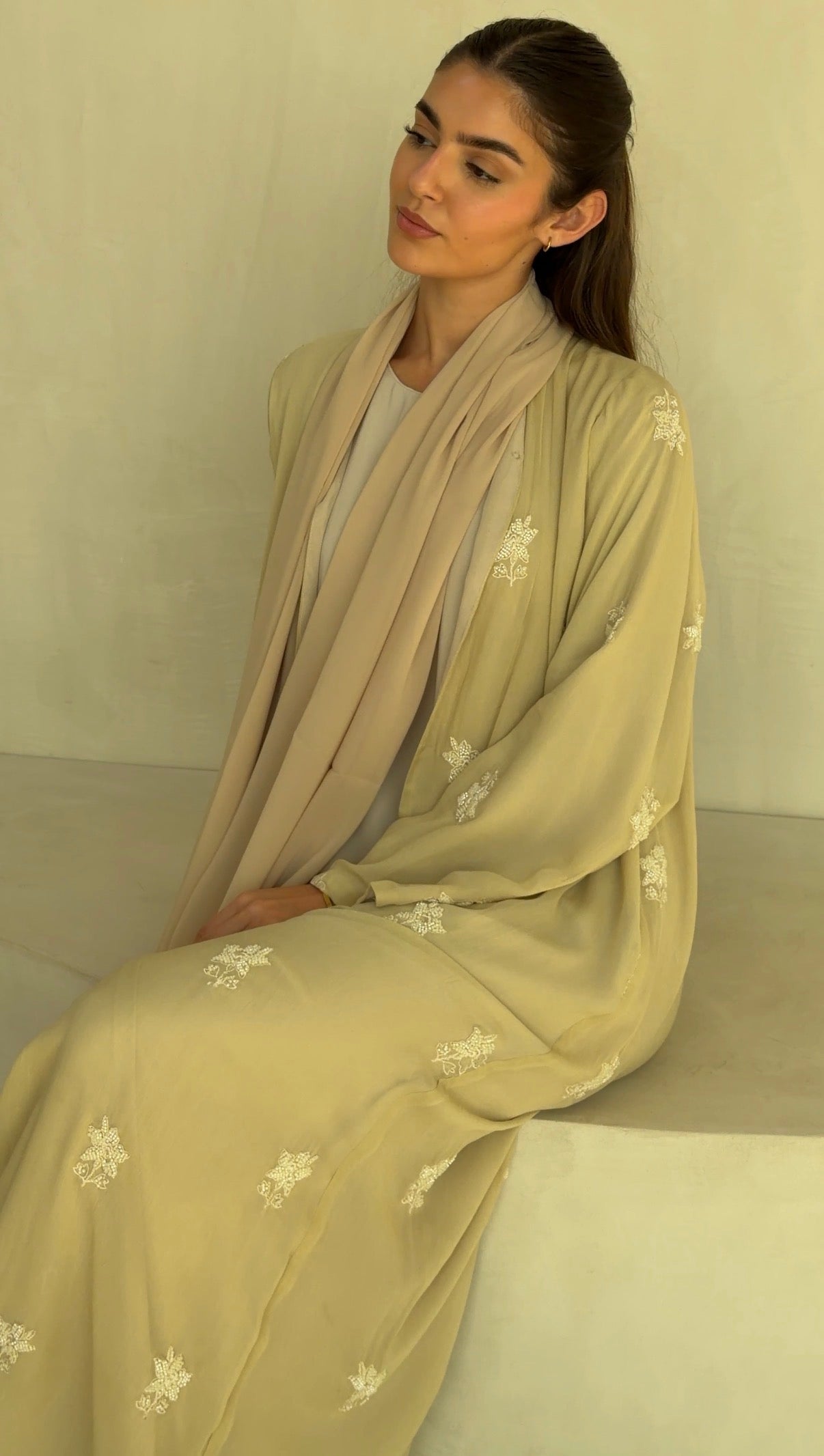 Sheer embroidered georgette abaya, fully lined with matching chiffon for coverage and fluidity.