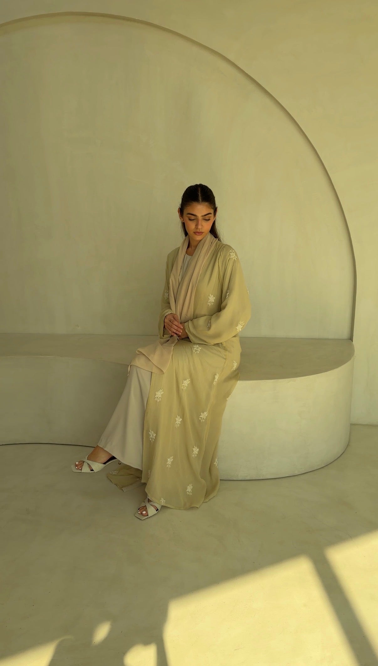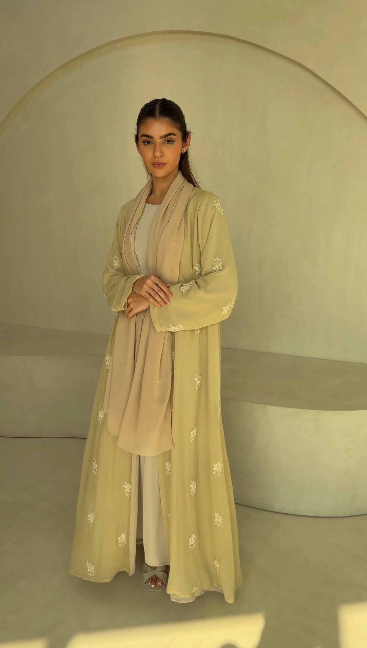 Straight-cut abaya with a soft shoulder cut and flowy umbrella-style fall.