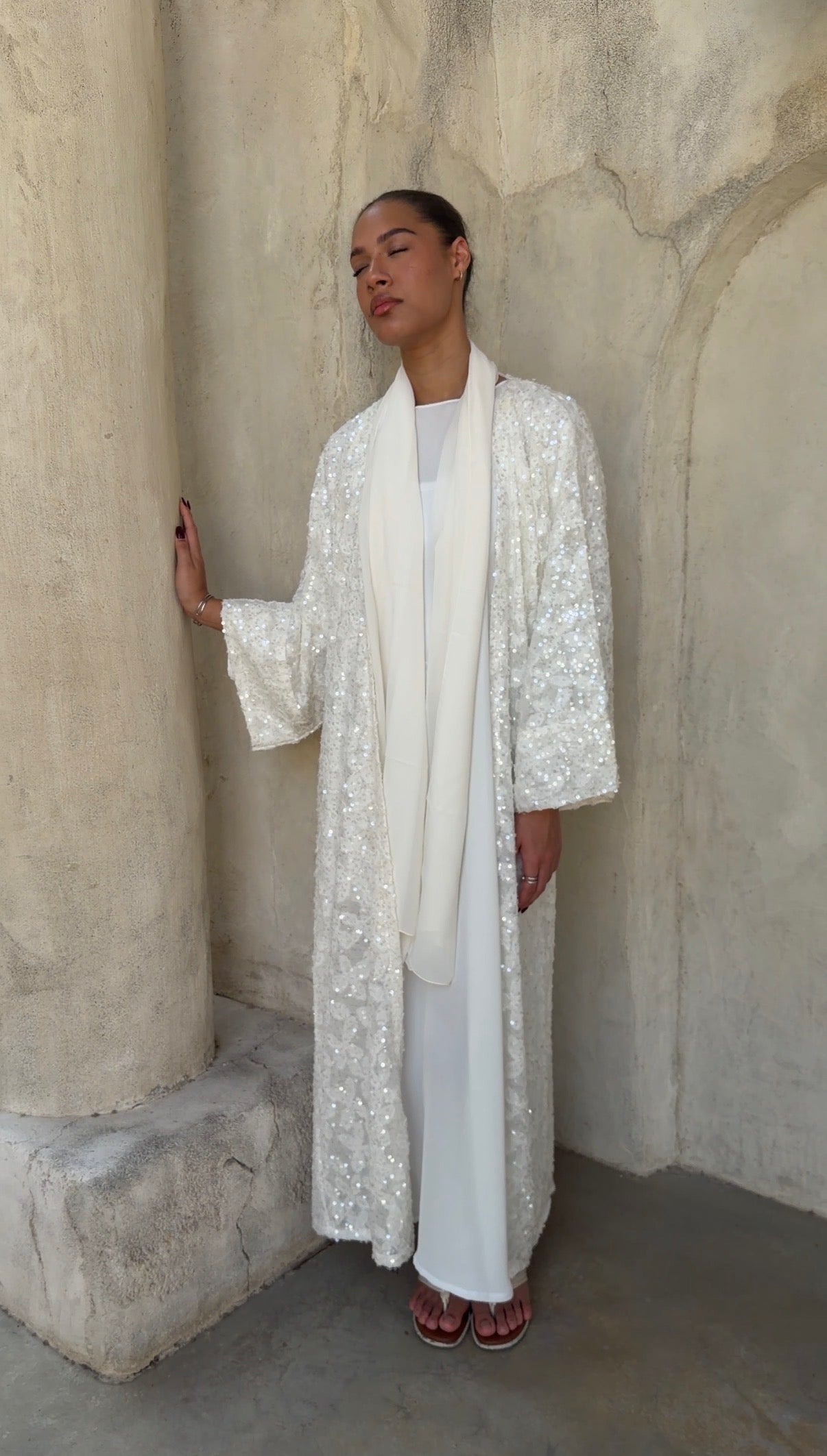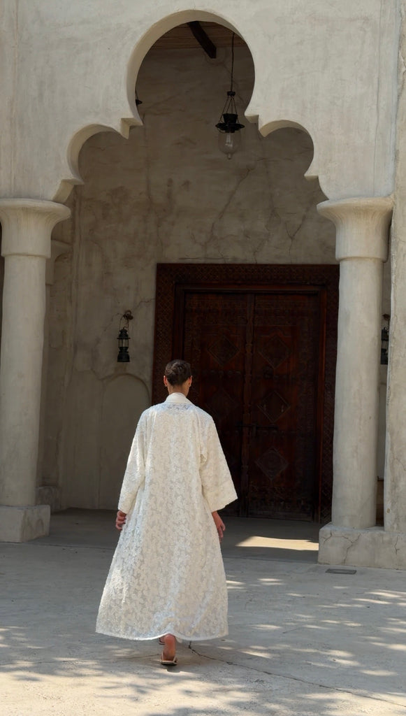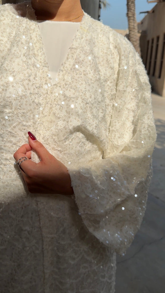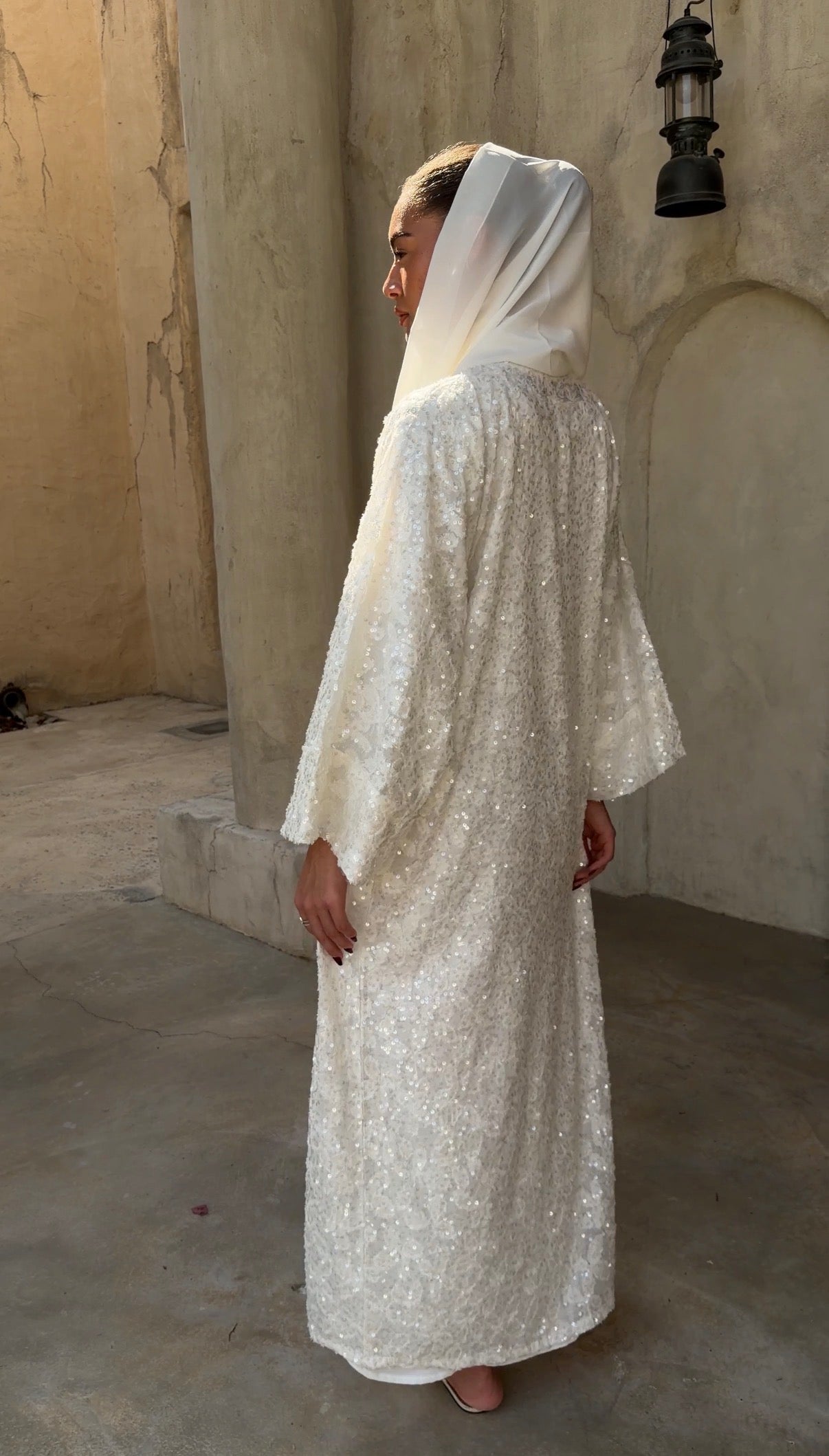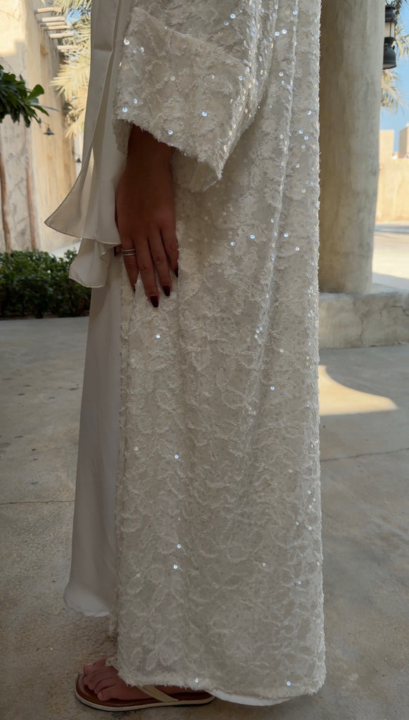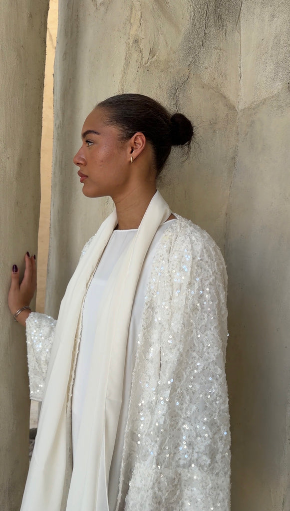 An all-over embroidered ivory layer adorned with delicate sequins that shimmer with every movement. Lightweight yet richly textured, it blends lace detailing with subtle shine, creating an effortlessly elegant statement. Dreamy, refined, and timeless — perfect for elevated occasions and soft daylight moments alike.