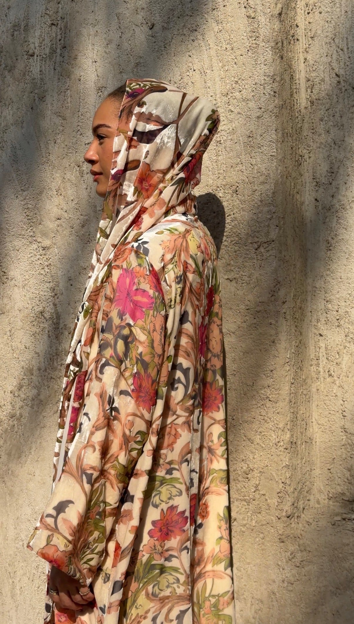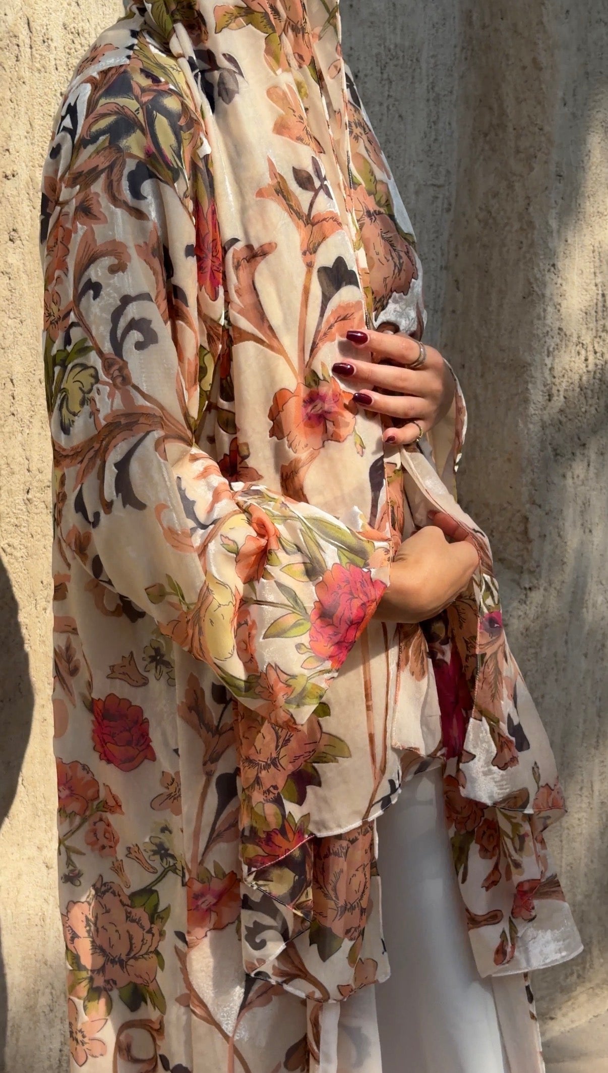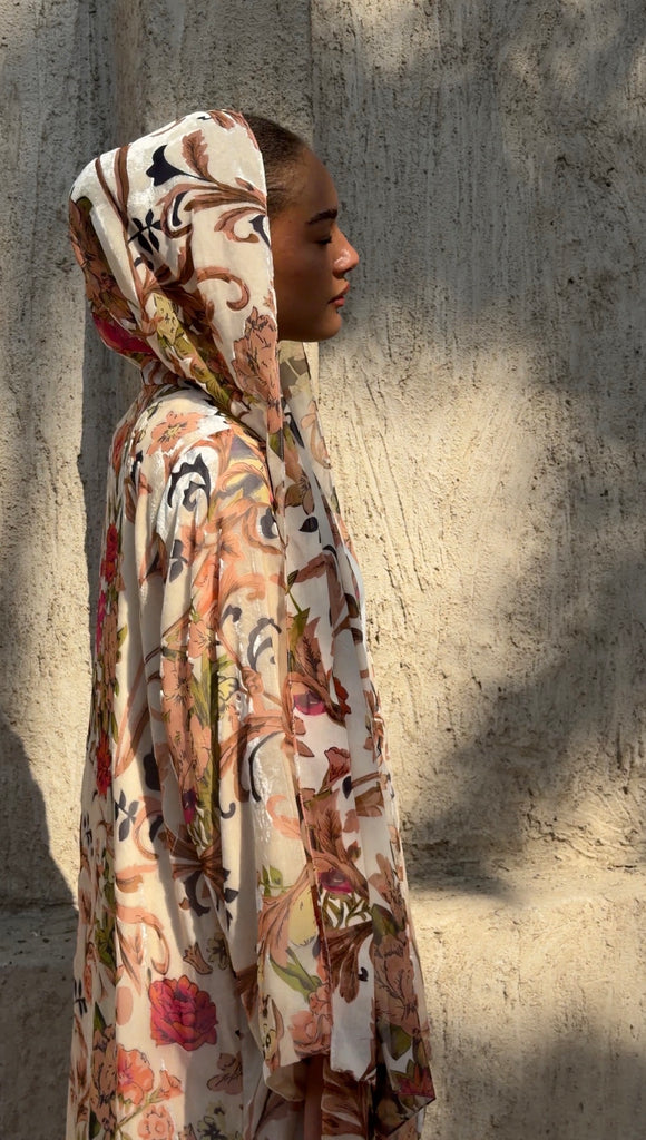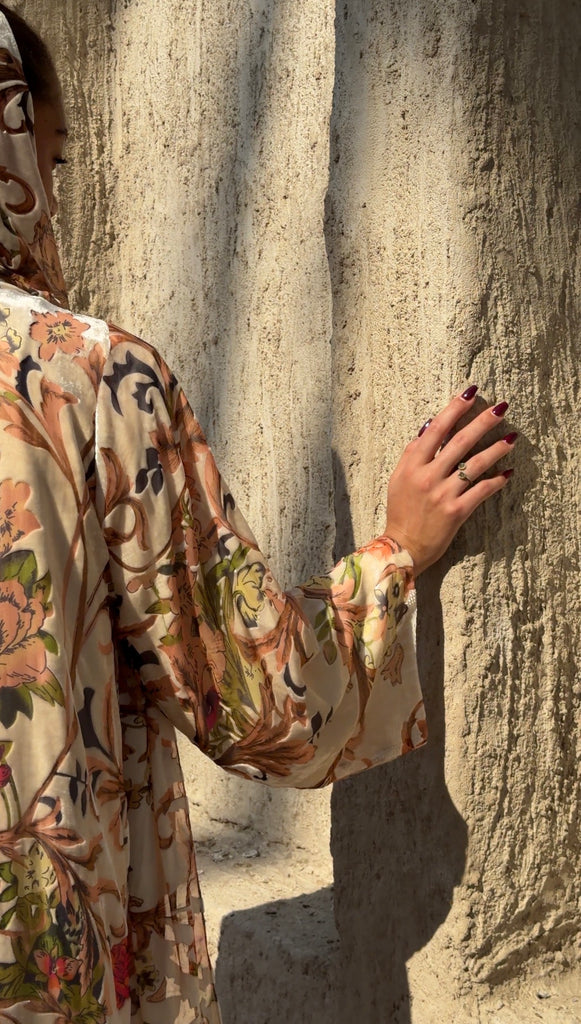 A soft interplay of velvet and chiffon — where delicate florals dance across a creamy base. The floral areas are light and slightly sheer, creating a dreamy contrast against the smooth velvet body. Dreamy, romantic, and textured, it drapes beautifully and shifts between daylight and evening wear with ease.