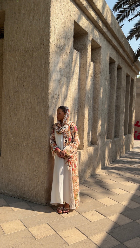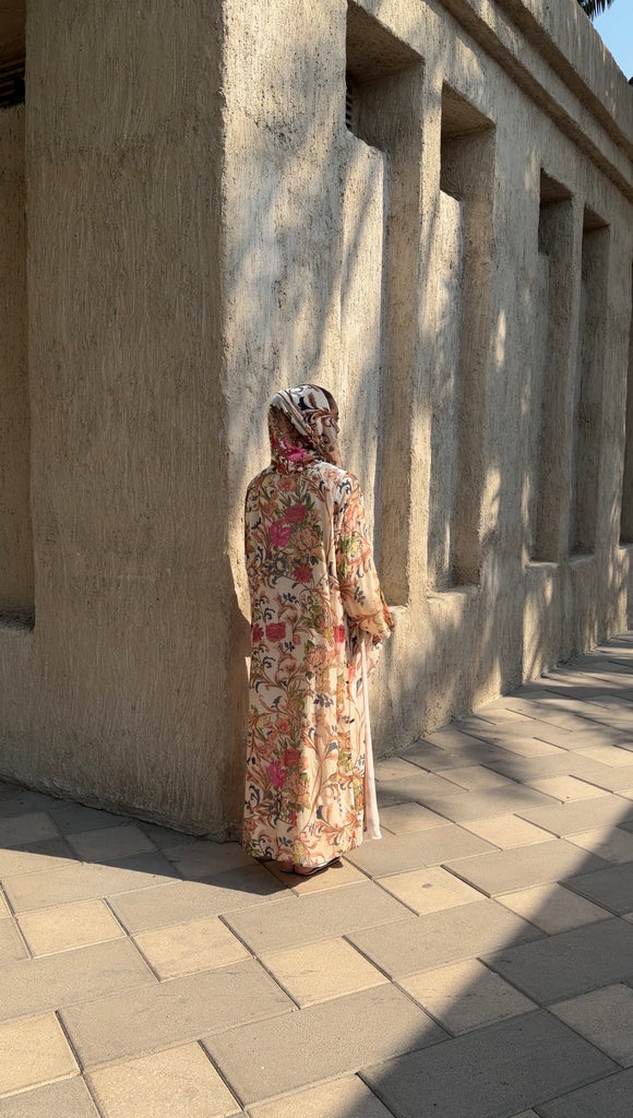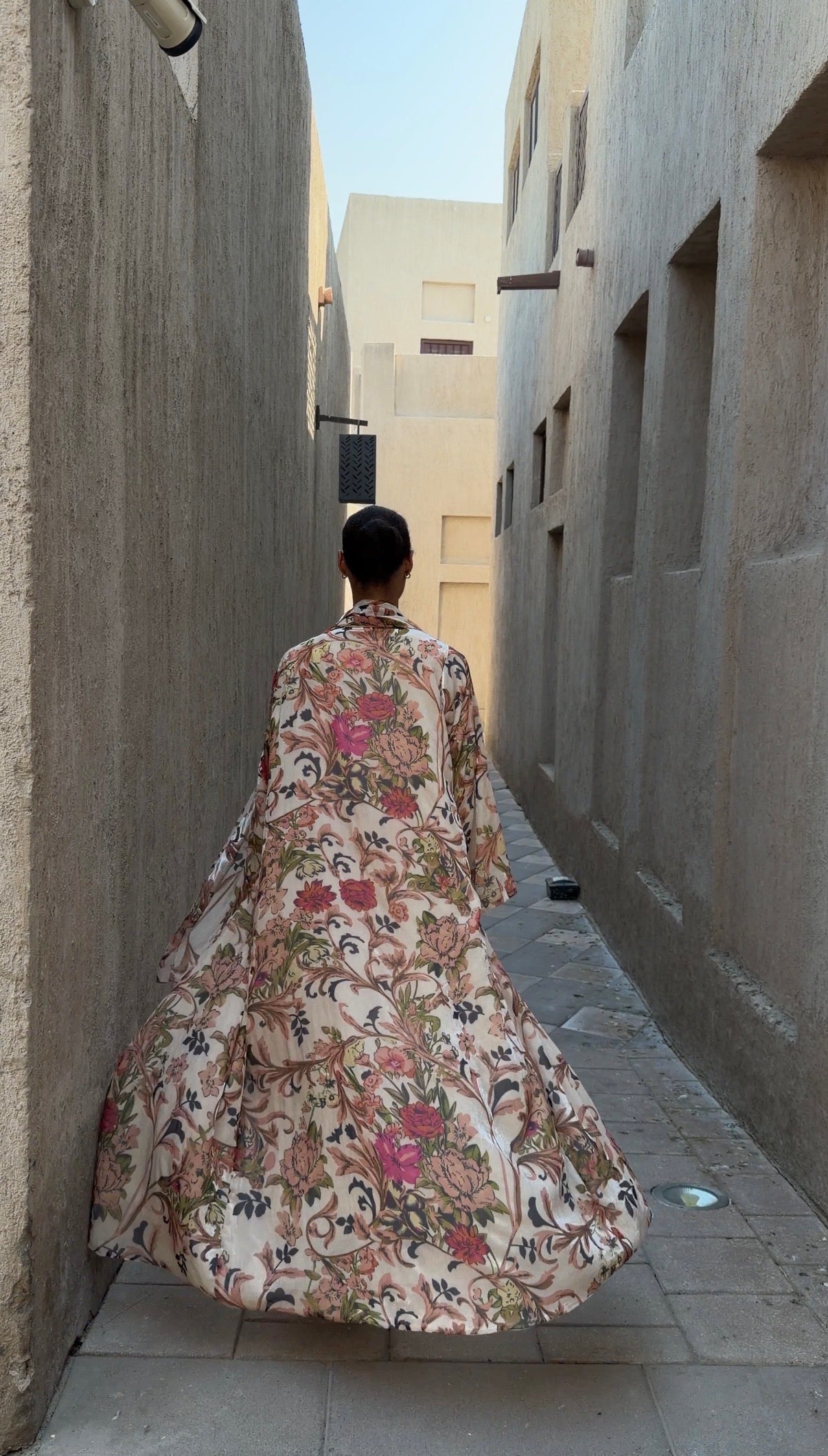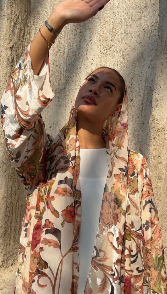 A soft interplay of velvet and chiffon — where delicate florals dance across a creamy base. The floral areas are light and slightly sheer, creating a dreamy contrast against the smooth velvet body. Dreamy, romantic, and textured, it drapes beautifully and shifts between daylight and evening wear with ease.